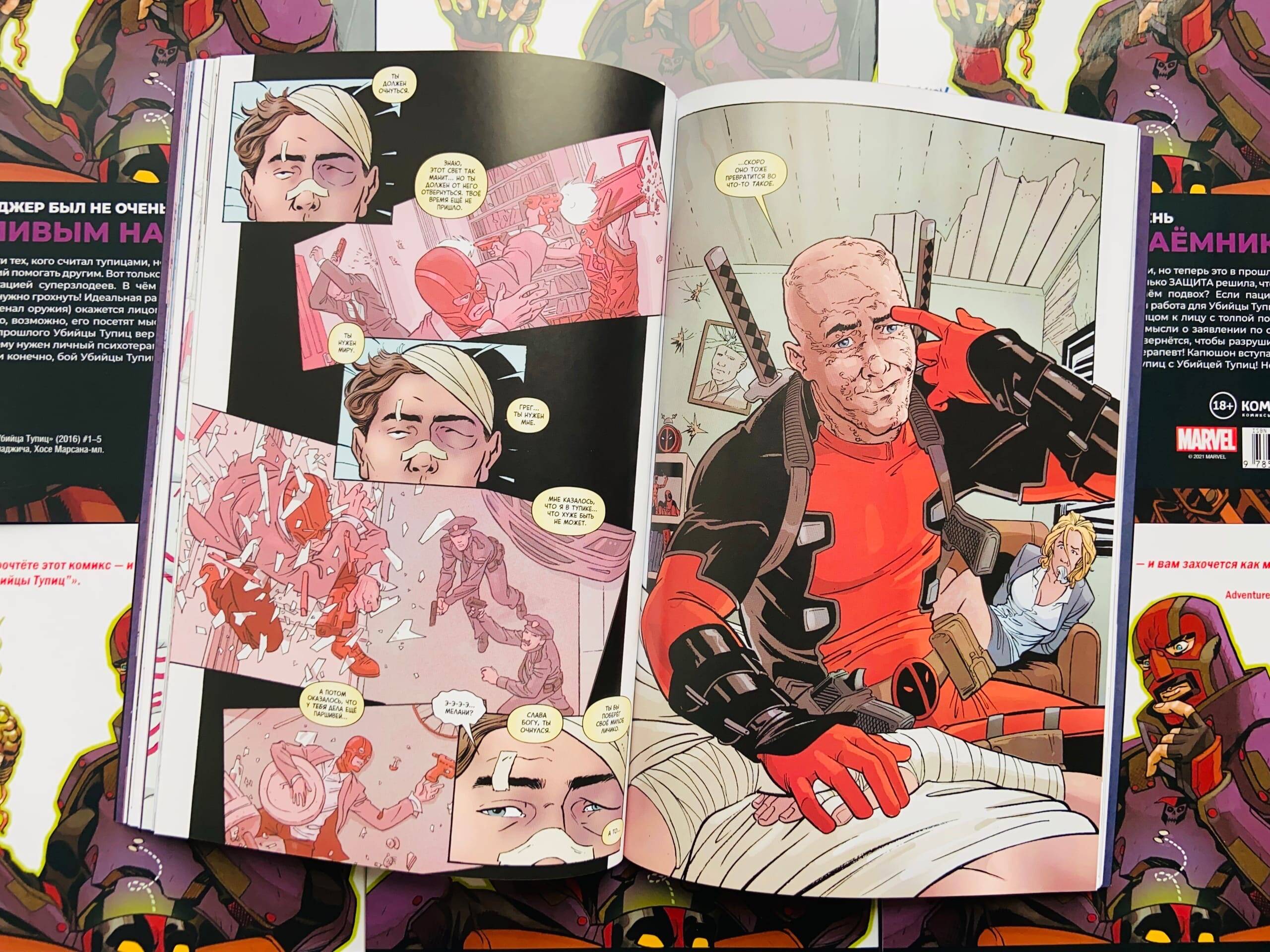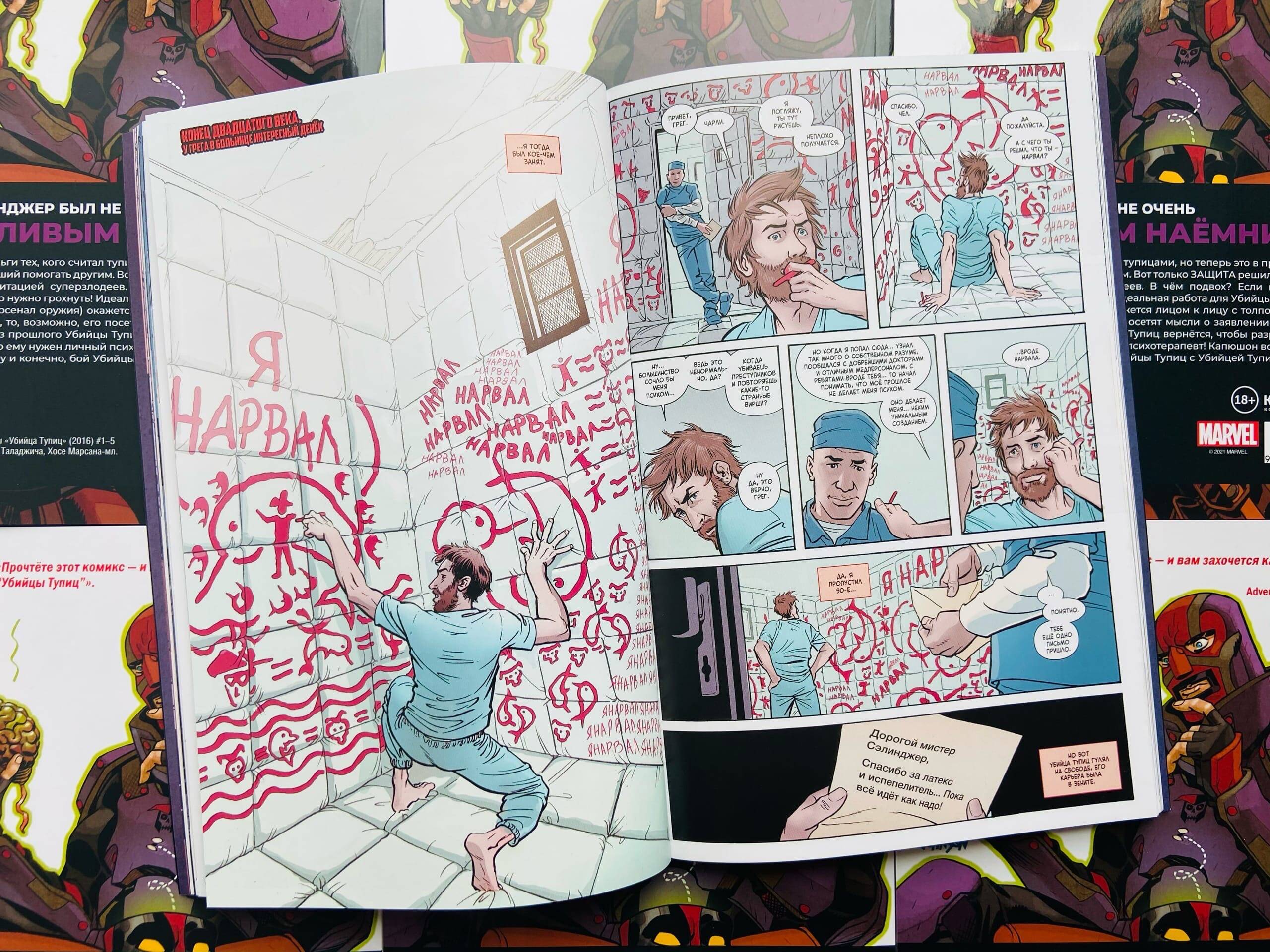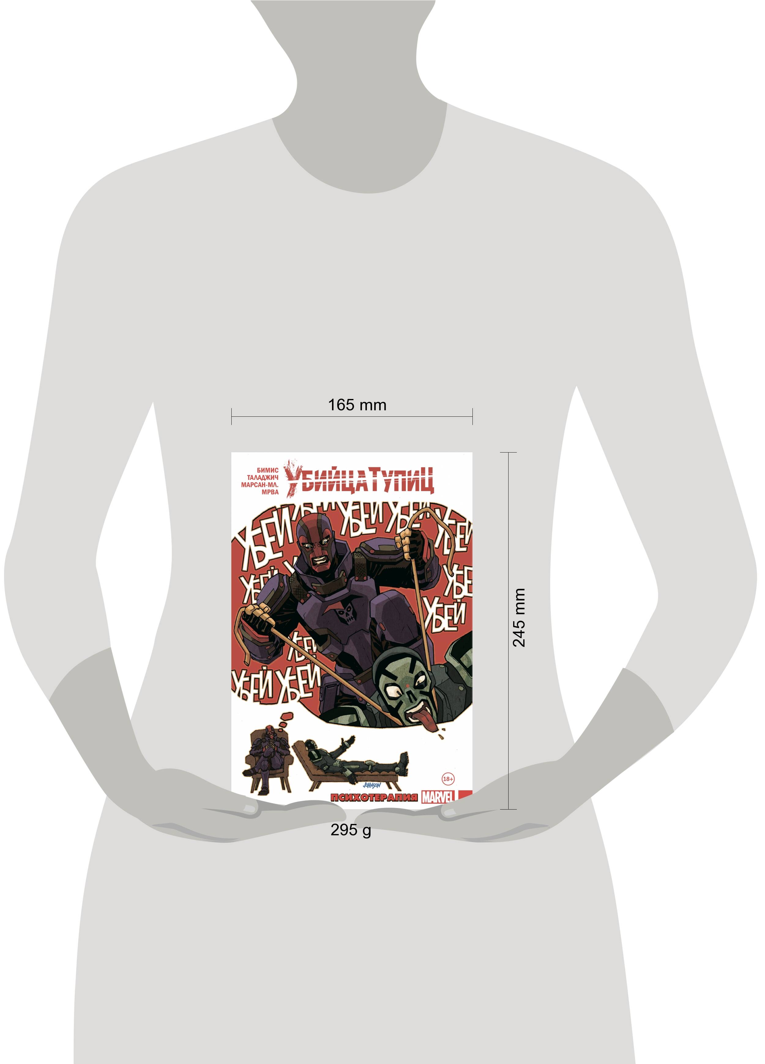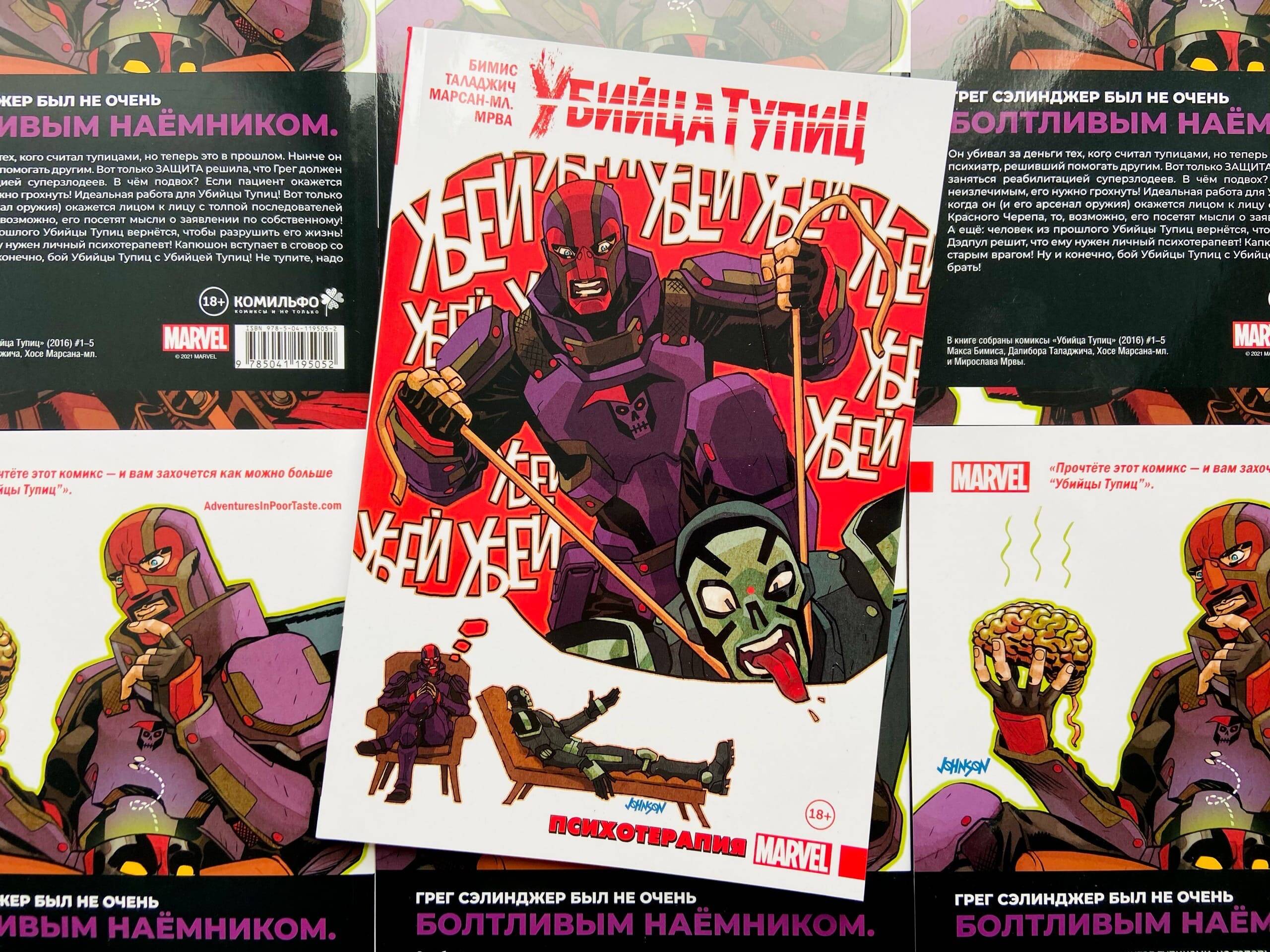 Грег Сэлинджер был не очень болтливым наёмником. Он убивал за деньги тех, кого считал тупицами, но теперь это в прошлом. Нынче он психиатр, решивший помогать другим. Вот только ЗАЩИТА решила, что Грег должен заняться реабилитацией суперзлодеев. В чём подвох? Если пациент окажется неизлечимым, его нужно грохнуть! Идеальная работа для Убийцы Тупиц! Вот только когда он (и его арсенал оружия) окажется лицом к лицу с толпой последователей Красного Черепа, то, возможно, его посетят мысли о заявлении по собственному! А ещё: человек из прошлого Убийцы Тупиц вернётся, чтобы разрушить его жизнь! Дэдпул решит, что ему нужен личный психотерапевт! Капюшон вступает в сговор со старым врагом! Ну и конечно, бой Убийцы Тупиц с Убийцей Тупиц! Не тупите, надо брать! В книге собраны комиксы "Убийца Тупиц" (2016) #1-5 Макса Бимиса, Далибора Таладжича, Хосе Марcана-мл. и Мирослава Мрвы. Перед вами один из самых необычных комиксов последних лет: Макс Бимис, вокалист популярной группы Say Anything и сценарист комиксов, уже известный отечественному по "Худшему из Людей Икс", ловко спрятал за обложкой стандартной мини-серии невероятно лаконичный, живой и ироничный разбор современной комикс-индустрии. Через рассказ о приключениях третьесортного антигероя, Макс расскажет читателю о работе над супергероикой. Не стоит думать, что комикс хорош только своим вторым дном, основной сюжет также динамичен, остроумен и изобилует интересными находками.| Издательство | ООО "Издательство "Эксмо" |
