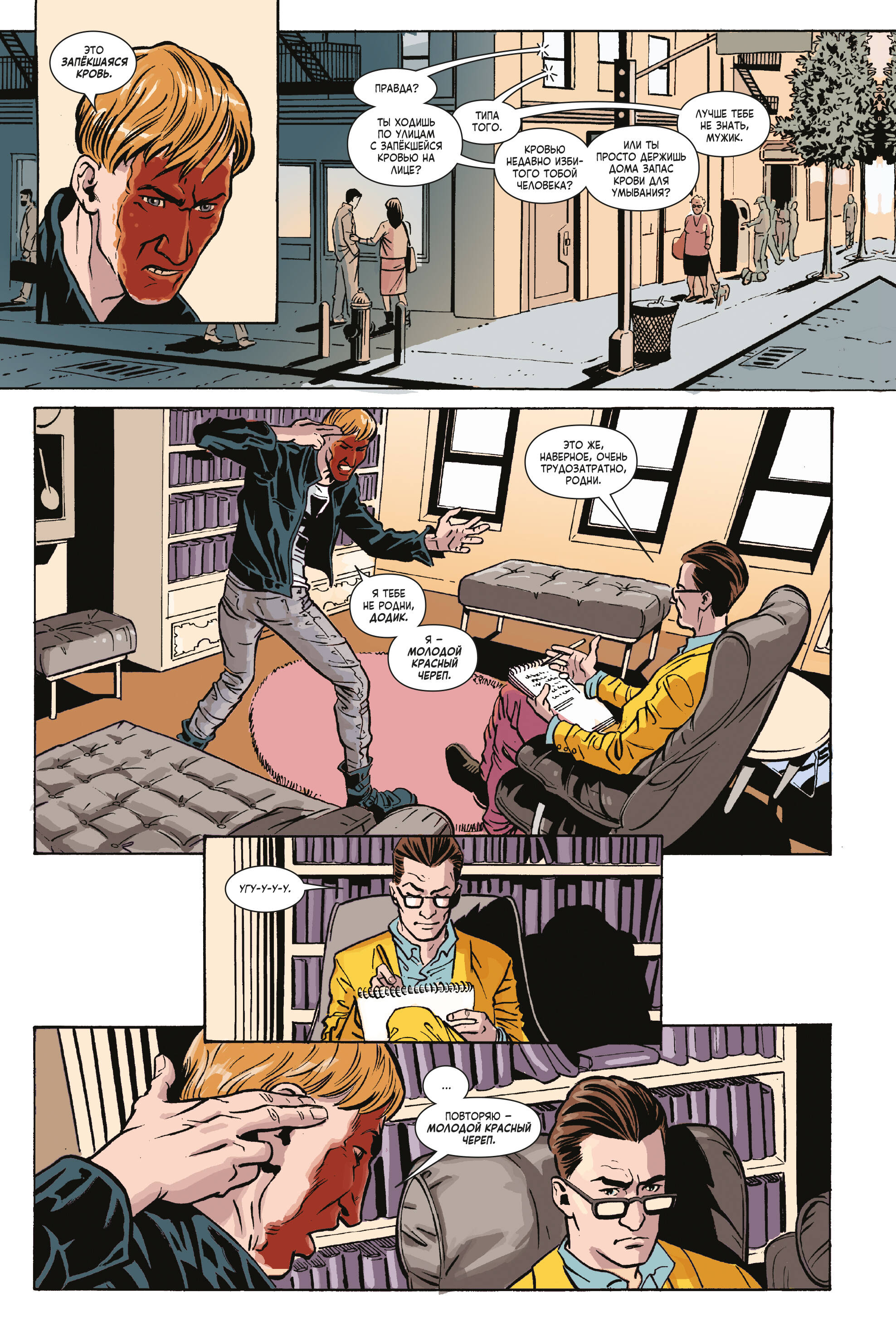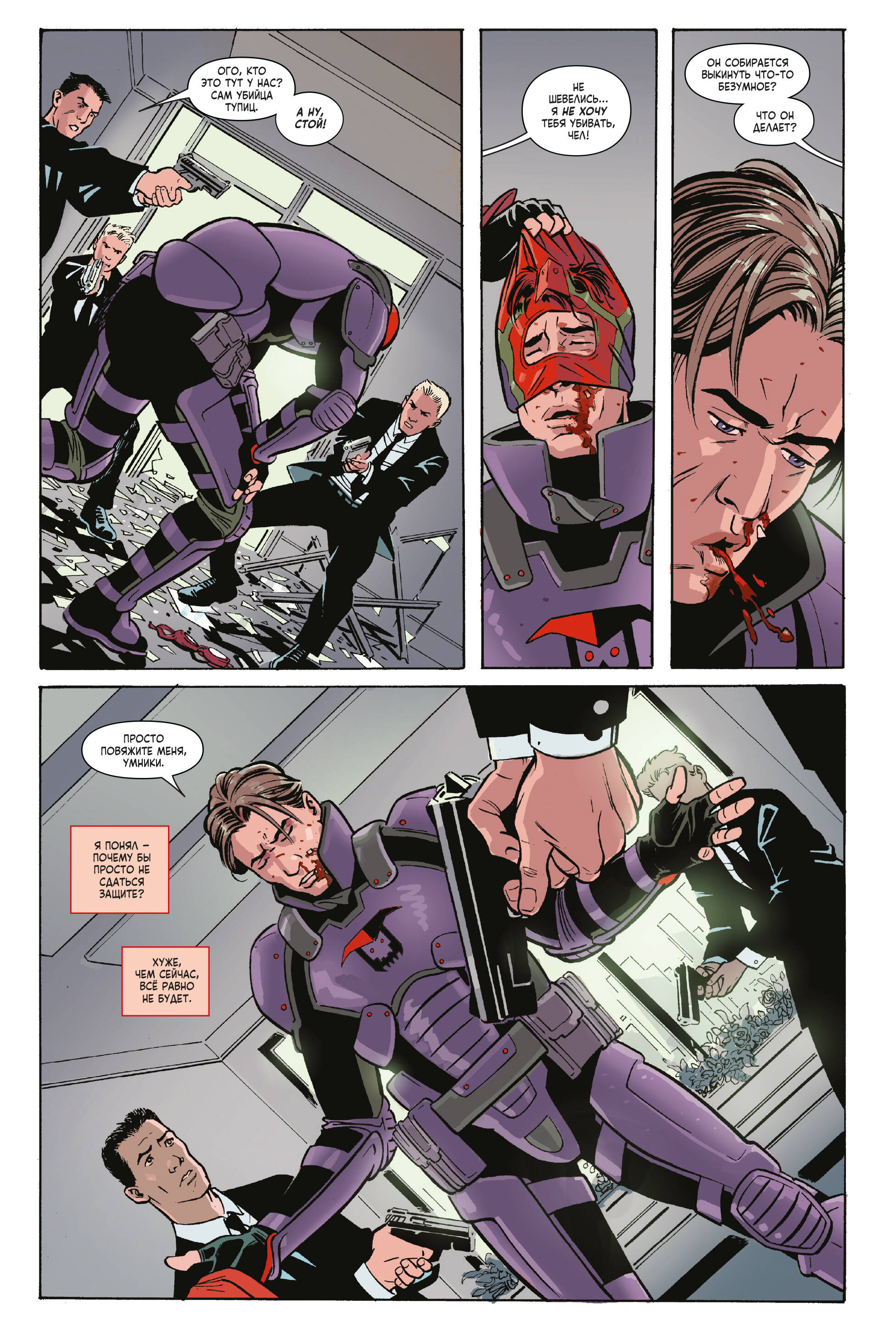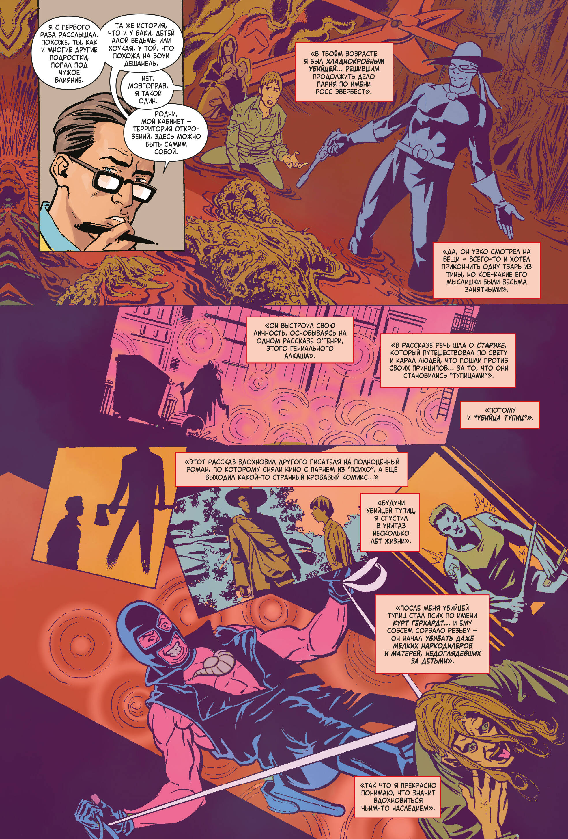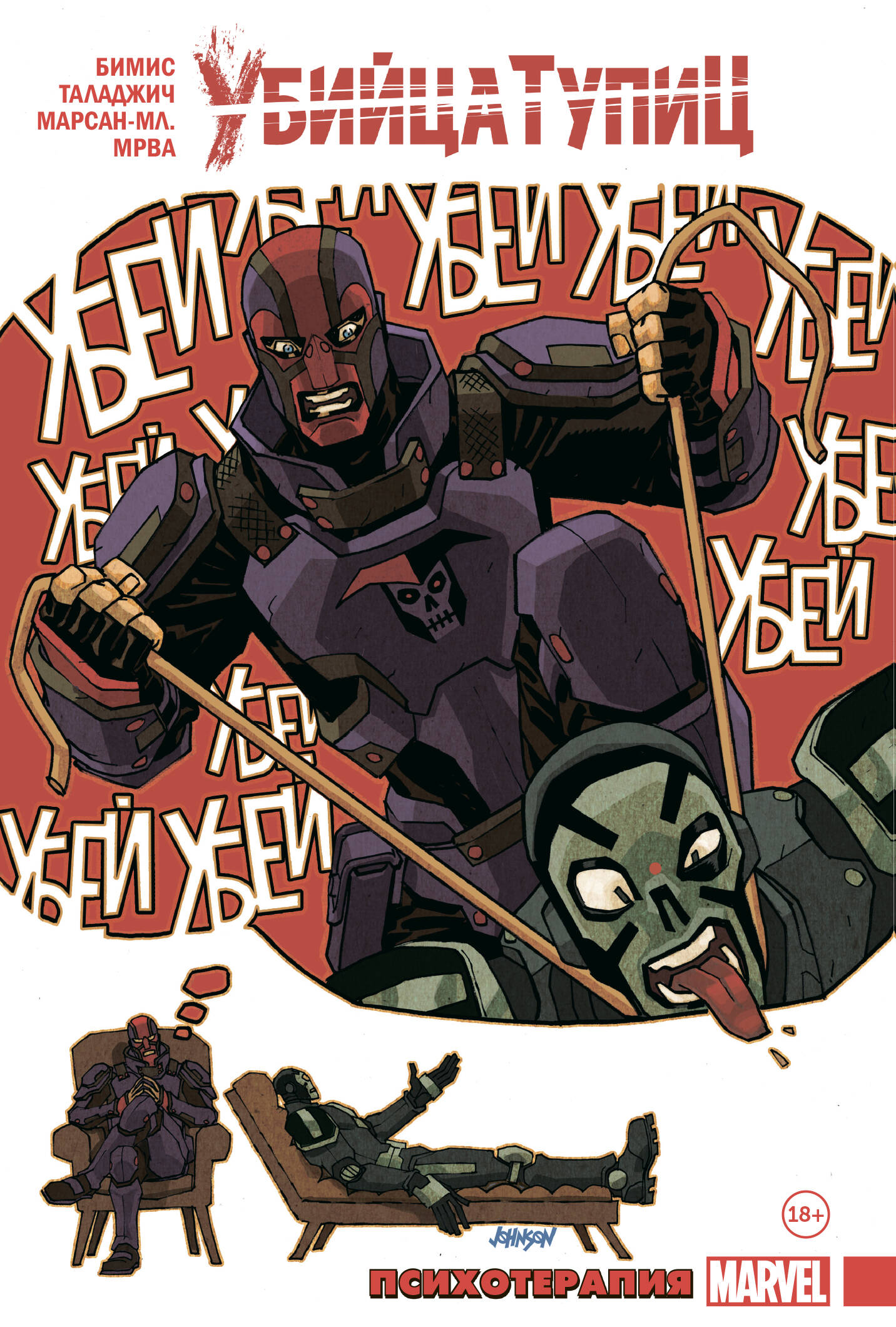Грег Сэлинджер был не очень болтливым наёмником. Он убивал за деньги тех, кого считал тупицами, но теперь это в прошлом. Нынче он психиатр, решивший помогать другим. Вот только ЗАЩИТА решила, что Грег должен заняться реабилитацией суперзлодеев. В чём подвох? Если пациент окажется неизлечимым, его нужно грохнуть! Идеальная работа для Убийцы Тупиц! Вот только когда он (и его арсенал оружия) окажется лицом к лицу с толпой последователей Красного Черепа, то, возможно, его посетят мысли о заявлении по собственному! А ещё: человек из прошлого Убийцы Тупиц вернётся, чтобы разрушить его жизнь! Дэдпул решит, что ему нужен личный психотерапевт! Капюшон вступает в сговор со старым врагом! Ну и конечно, бой Убийцы Тупиц с Убийцей Тупиц! Не тупите, надо брать! В книге собраны комиксы "Убийца Тупиц" (2016) #1-5 Макса Бимиса, Далибора Таладжича, Хосе Марcана-мл. и Мирослава Мрвы. Перед вами один из самых необычных комиксов последних лет: Макс Бимис, вокалист популярной группы Say Anything и сценарист комиксов, уже известный отечественному по "Худшему из Людей Икс", ловко спрятал за обложкой стандартной мини-серии невероятно лаконичный, живой и ироничный разбор современной комикс-индустрии. Через рассказ о приключениях третьесортного антигероя, Макс расскажет читателю о работе над супергероикой. Не стоит думать, что комикс хорош только своим вторым дном, основной сюжет также динамичен, остроумен и изобилует интересными находками.| Издательство | ООО "Издательство "Эксмо" |