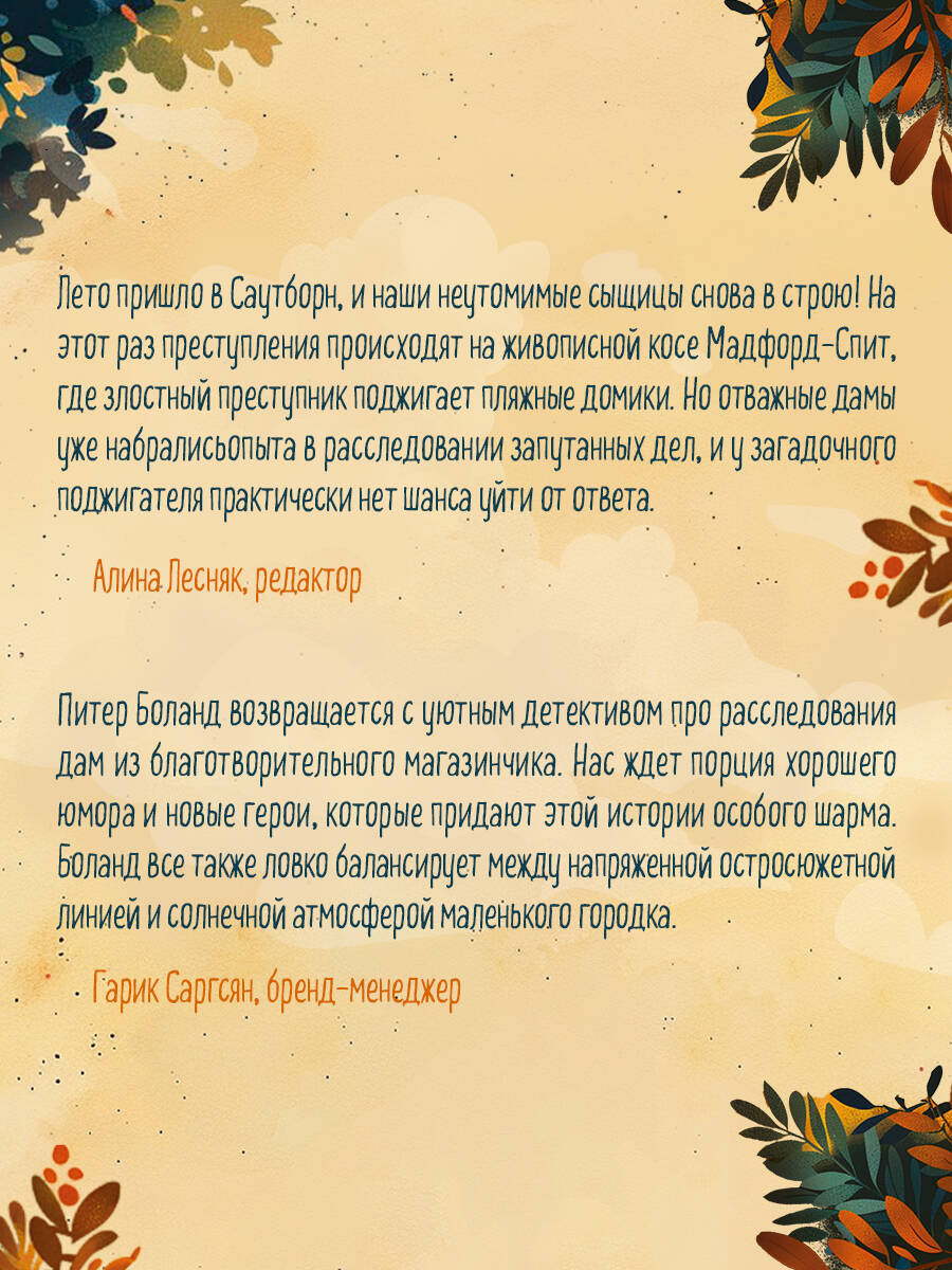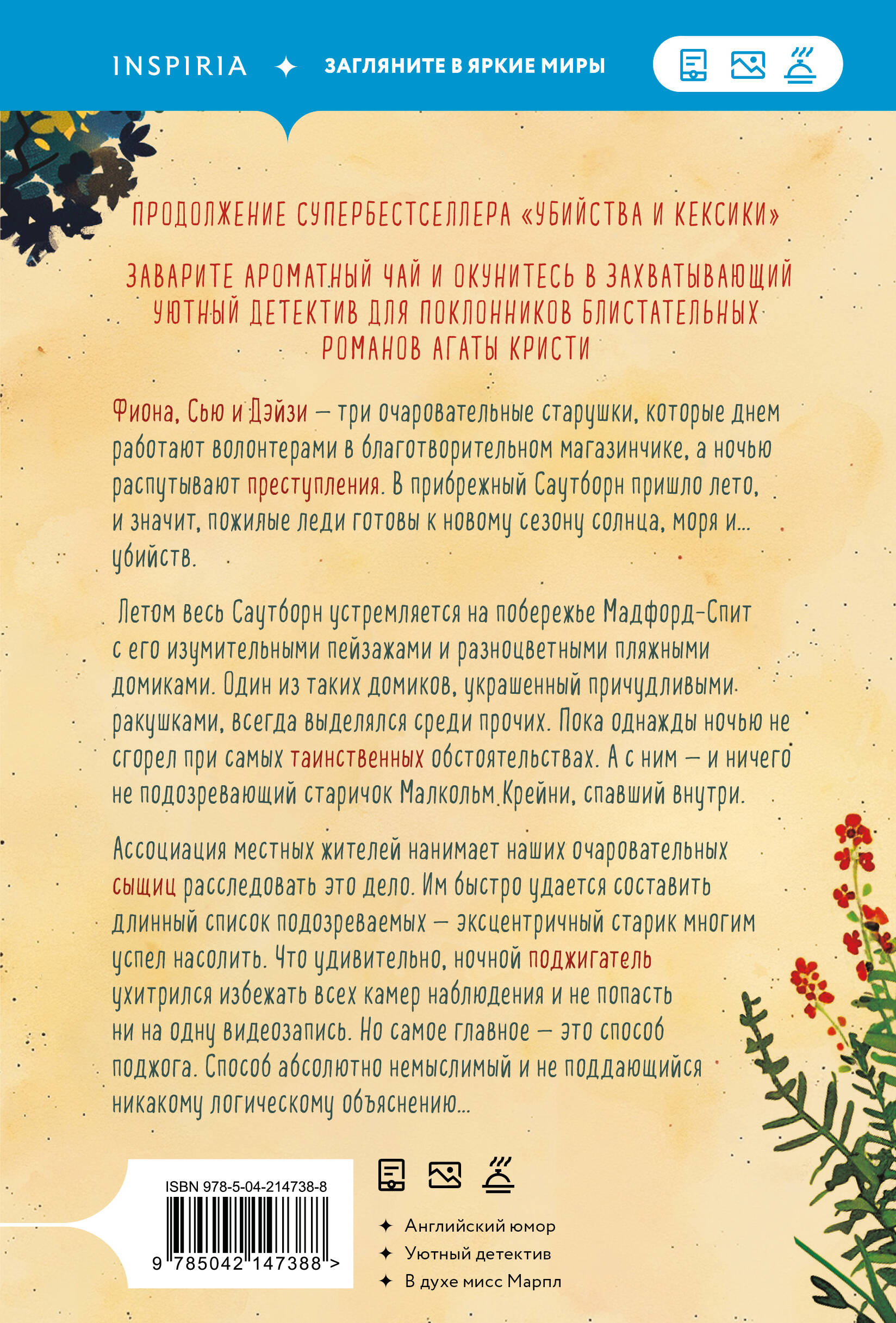 ПРОДОЛЖЕНИЕ СУПЕРБЕСТСЕЛЛЕРА «УБИЙСТВА И КЕКСИКИ». ОТВАЖНЫЕ СЫЩИЦЫ НА ПЕНСИИ ВОЗВРАЩАЮТСЯ, ЧТОБЫ ВЗЯТЬСЯ ЗА НОВОЕ РАССЛЕДОВАНИЕ! ЗАВАРИТЕ АРОМАТНЫЙ ЧАЙ И ОКУНИТЕСЬ В ЗАХВАТЫВАЮЩИЙ УЮТНЫЙ ДЕТЕКТИВ ДЛЯ ПОКЛОННИКОВ БЛИСТАТЕЛЬНЫХ РОМАНОВ АГАТЫ КРИСТИ. Фиона, Сью и Дэйзи - три очаровательные старушки, которые днем работают волонтерами в благотворительном магазинчике, а ночью распутывают преступления. В прибрежный Саутборн пришло лето, и, значит, пожилые леди готовы к новому сезону солнца, моря и… убийств. Летом весь Саутборн устремляется на побережье Мадфорд-Спит с его изумительными пейзажами и разноцветными пляжными домиками. Один из таких домиков, украшенный причудливыми ракушками, всегда выделялся среди прочих. Пока однажды ночью не сгорел при самых таинственных обстоятельствах. А с ним и ничего не подозревающий старичок Малкольмом Крейни, спавший внутри. Ассоциация местных жителей нанимает наших очаровательным сыщиц расследовать это дело. Им быстро удается составить длинный список подозреваемых - эксцентричный старик многим успел насолить. Что удивительно, ночной поджигатель ухитрился избежать всех камер наблюдения и не попасть ни на одну видеозапись. Но самое главное - это способ поджога. Способ абсолютно немыслимый и не поддающийся никакому логическому объяснению…| Издательство | ООО "Издательство "Эксмо" |