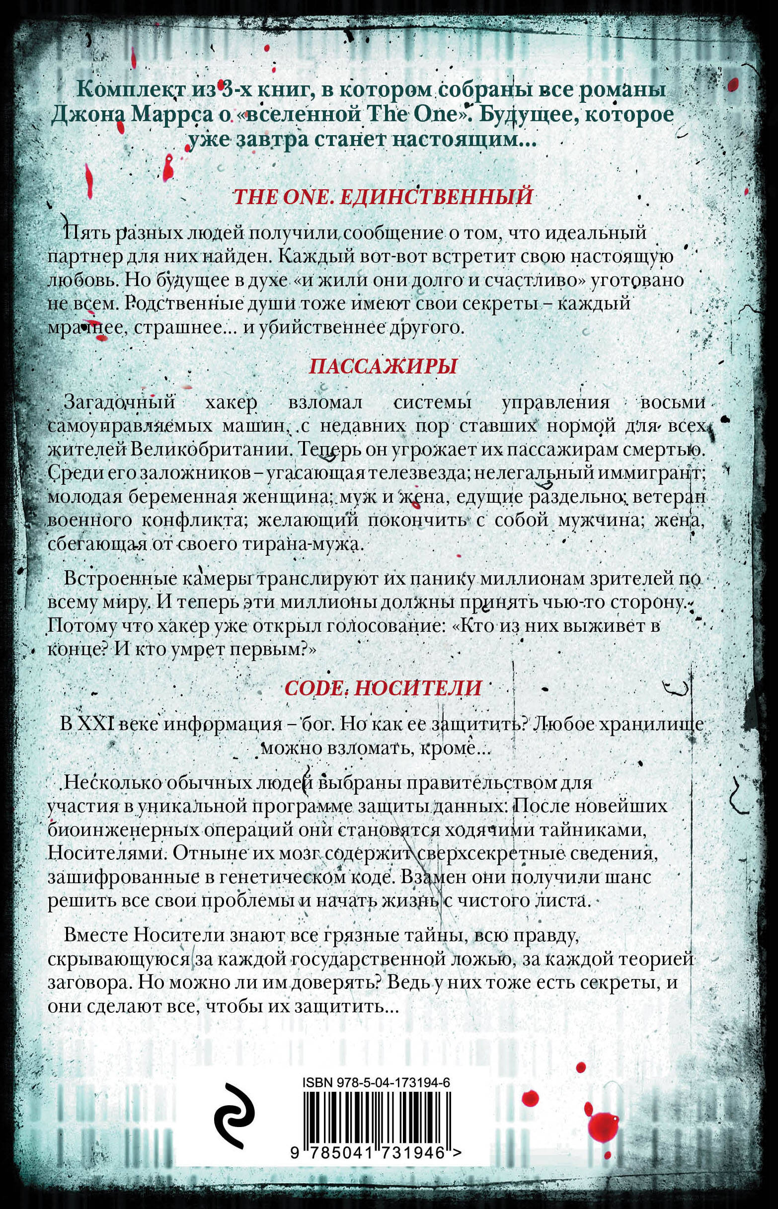 Комплект из 3-х книг, в котором собраны все романы Джона Маррса о «вселенной The One». Будущее, которое уже завтра станет настоящим: «The One. Единственный», «Пассажиры», «Code. Носители». «The One. Единственный» Пять разных людей получили сообщение о том, что идеальный партнер для них найден. Каждый вот-вот встретит свою настоящую любовь. Но будущее в духе «и жили они долго и счастливо» уготовано не всем. Родственные души тоже имеют свои секреты - каждый мрачнее, страшнее… и убийственнее другого. «Пассажиры» Загадочный хакер взломал системы управления восьми самоуправляемых машин, с недавних пор ставших нормой для всех жителей Великобритании. Теперь он угрожает их пассажирам смертью. Среди его заложников - угасающая телезвезда; нелегальный иммигрант; молодая беременная женщина; муж и жена, едущие раздельно; ветеран военного конфликта; желающий покончить с собой мужчина; жена, сбегающая от своего тирана-мужа. Встроенные камеры транслируют их панику миллионам зрителей по всему миру. И теперь эти миллионы должны принять чью-то сторону. Потому что хакер уже открыл голосование: «Кто из них выживет в конце? И кто умрет первым?». «Code. Носители» В XXI веке информация - бог. Но как ее защитить? Любое хранилище можно взломать, кроме… Несколько обычных людей выбраны правительством для участия в уникальной программе защиты данных. После новейших биоинженерных операций они становятся ходячими тайниками, Носителями. Отныне их мозг содержит сверхсекретные сведения, зашифрованные в генетическом коде. Взамен они получили шанс решить все свои проблемы и начать жизнь с чистого листа. Вместе Носители знают все грязные тайны, всю правду, скрывающуюся за каждой государственной ложью, за каждой теорией заговора. Но можно ли им доверять? Ведь у них тоже есть секреты, и они сделают все, чтобы их защитить…