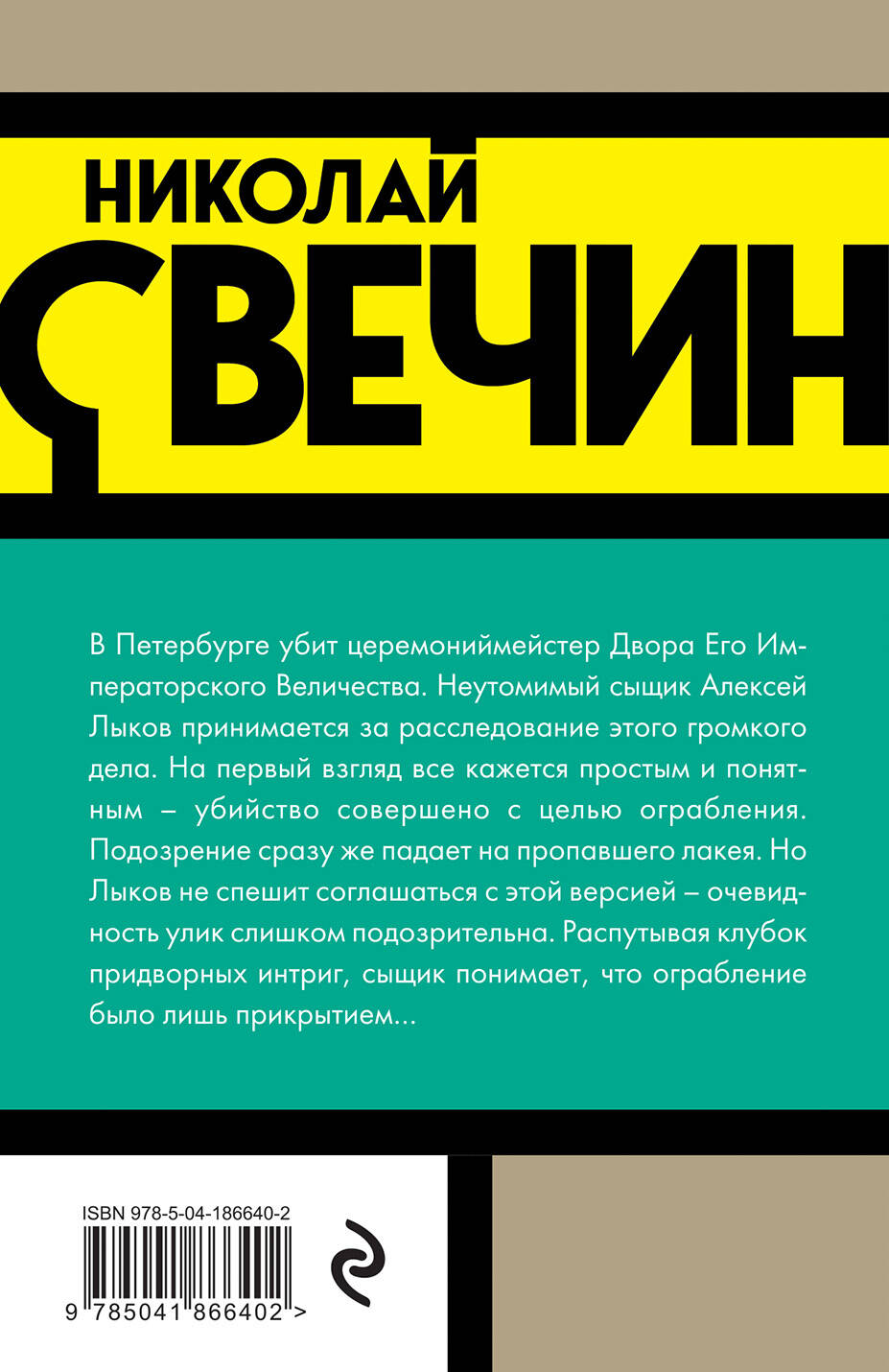 Новая стильная серия модного автора ретро-детективов Николая Свечина, самого популярного после Акунина в жанре! Роман входит в цикл произведений о сыщике Алексее Лыкове и является 11-м по счету, но книгу можно читать и как самостоятельное произведение. В Петербурге убит церемониймейстер Двора Его Императорского Величества. Неутомимый сыщик Алексей Лыков принимается за расследование этого громкого дела. На первый взгляд, все кажется простым и понятным - убийство совершено с целью ограбления. Подозрение сразу же падает на пропавшего лакея. Но Лыков не спешит соглашаться с этой версией - очевидность улик слишком подозрительна. Распутывая клубок придворных интриг, сыщик понимает, что ограбление было лишь прикрытием…| Издательство | ООО "Издательство "Эксмо" |