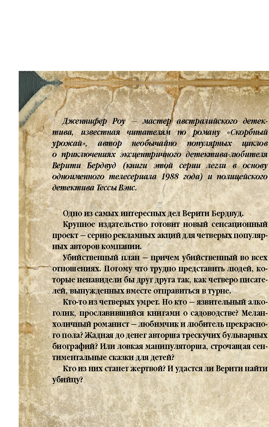 Одно из самых интересных дел Верити Бердвуд. Крупное издательство готовит новый сенсационный проект - серию рекламных акций для четверых популярных авторов компании. Убийственный план - причем убийственный во всех отношениях. Потому что трудно представить людей, которые ненавидели бы друг друга так, как четверо писателей, вынужденных вместе отправиться в турне. Кто-то из четверых умрет. Но кто - язвительный алкоголик, прославившийся книгами о садоводстве? Меланхоличный романист - любимчик и любитель прекрасного пола? Жадная до денег авторша трескучих бульварных биографий? Или ловкая манипуляторша, строчащая сентиментальные сказки для детей? Кто из них станет жертвой? И удастся ли Верити найти убийцу?| Издательство | Издательство "АСТ" |