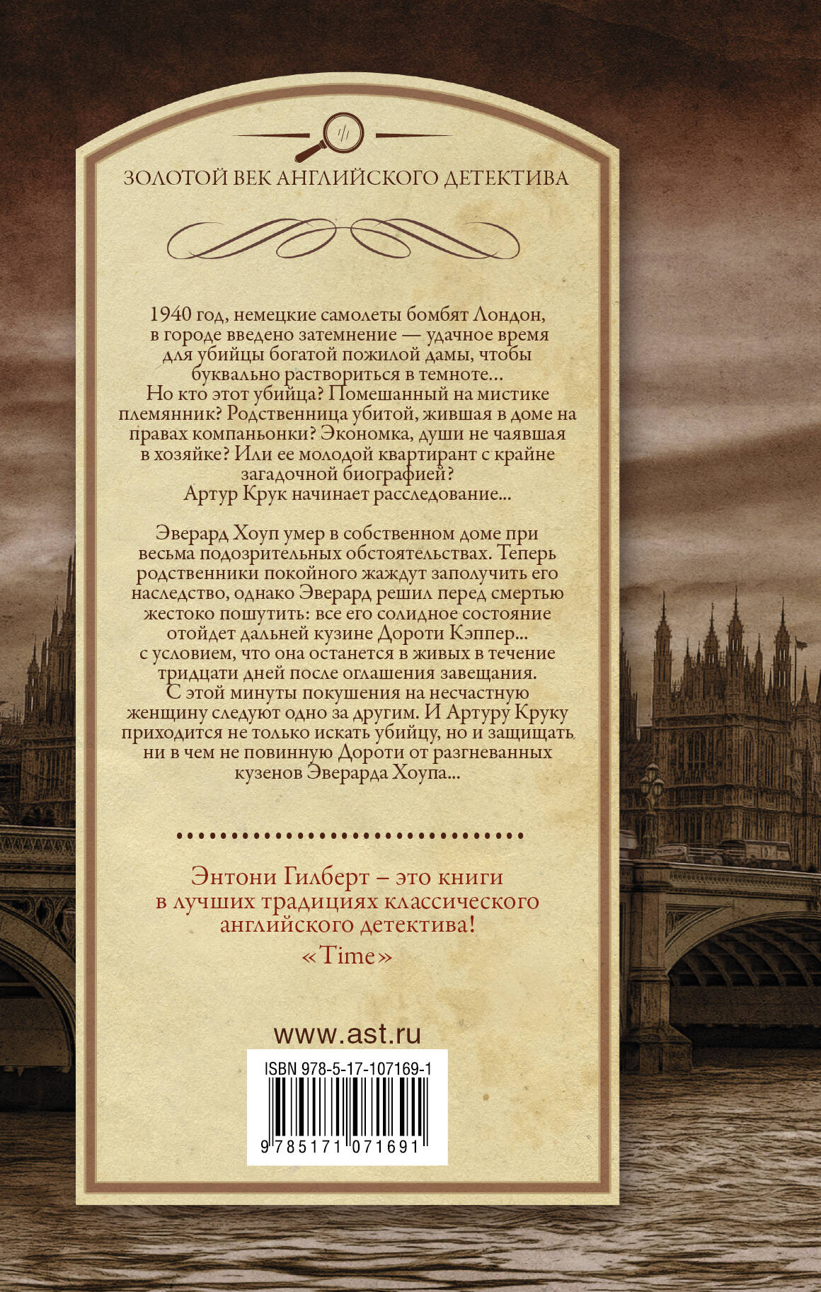 1940 год, немецкие самолеты бомбят Лондон, в городе введено затемнение - удачное время для убийцы богатой пожилой дамы, чтобы буквально раствориться в темноте… Но кто этот убийца? Помешанный на мистике племянник? Родственница убитой, жившая в доме на правах компаньонки? Экономка, души не чаявшая в хозяйке? Или ее молодой квартирант с крайне загадочной биографией? Артур Крук начинает расследование... Эверард Хоуп умер в собственном доме при весьма подозрительных обстоятельствах. Теперь родственники покойного жаждут заполучить его наследство, однако Эверард решил перед смертью жестоко пошутить: все его солидное состояние отойдет дальней кузине Дороти Кэппер... с условием, что она останется в живых в течение тридцати дней после оглашения завещания. С этой минуты покушения на несчастную женщину следуют одно за другим. И Артуру Круку приходится не только искать убийцу, но и защищать ни в чем не повинную Дороти| Издательство | ИЗДАТЕЛЬСТВО "АСТ" |