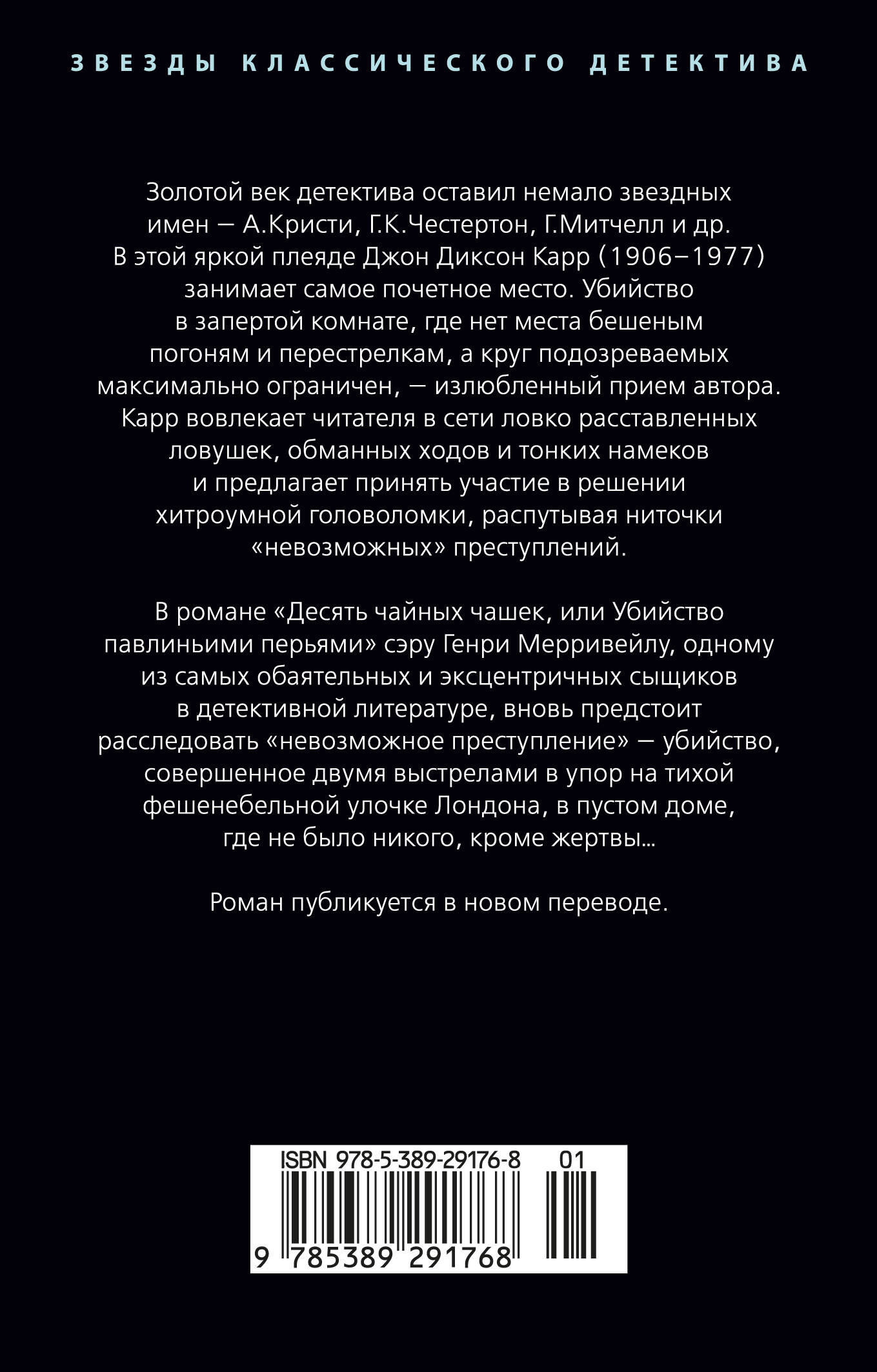 Золотой век детектива оставил немало звездных имен - А. Кристи, Г. К. Честертон, Г. Митчелл и др. В этой яркой плеяде Джон Диксон Карр (1906-1977) занимает самое почетное место. «Убийство в запертой комнате», где нет места бешеным погоням и перестрелкам, а круг подозреваемых максимально ограничен, - излюбленный прием автора. Карр вовлекает читателя в сети ловко расставленных ловушек, обманных ходов и тонких намеков и предлагает принять участие в решении хитроумной головоломки, распутывая ниточки «невозможных» преступлений. В романе «Десять чайных чашек, или Убийство павлиньими перьями» сэру Генри Мерривейлу, одному из самых обаятельных и эксцентричных сыщиков в детективной литературе, вновь предстоит расследовать «невозможное преступление» - убийство, совершенное двумя выстрелами в упор на тихой фешенебельной улочке Лондона, в пустом доме, где не было никого, кроме жертвы… Роман публикуется в новом переводе. Книга небольшого формата в мягком переплете, которую удобно брать в дорогу; книга также может послужить отличным подарком для всех любителей классического детектива и поклонников Карра.