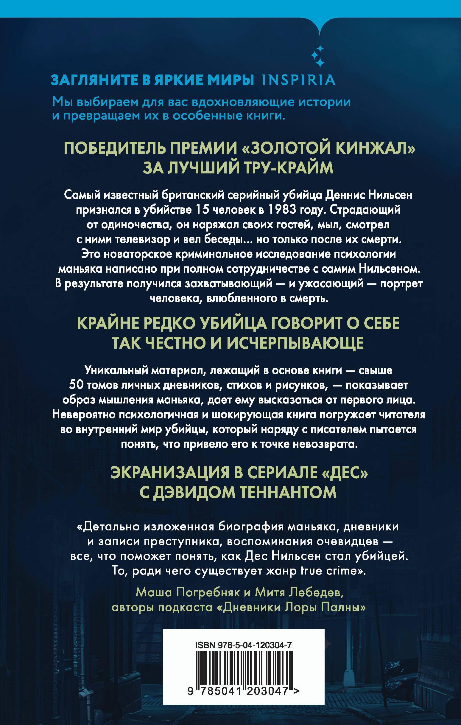 Победитель премии «Золотой кинжал» за лучший тру-крайм. Экранизация в сериале «Дес» с Дэвидом Теннантом в главной роли. Самый известный британский серийный убийца Деннис Нильсен признался в убийстве 15 человек в 1983 году. Страдающий от одиночества, он наряжал своих гостей, мыл, смотрел с ними телевизор и вел беседы… но только после их смерти. Это новаторское криминальное исследование психологии маньяка, написанное при полном сотрудничестве самого Нильсена. В результате получился захватывающий - и ужасающий - портрет человека, влюбленного в смерть. В феврале 1983 года у жильцов лондонского дома на Масвелл-Хилл засорилась канализация. Приехавший сантехник обнаружил в подвале ужасную находку - месиво из человеческой плоти и костей. На следующий день по подозрению в убийстве был арестован один из жильцов по имени Деннис Нильсен. - Мы говорим об одном теле или о двух? - спросил его полицейский. - Пятнадцать или шестнадцать, начиная с 1978 года. Я все расскажу. Вы не представляете, как здорово с кем-то об этом поговорить, - ответил Нильсен. Крайне редко убийца говорит о себе так честно и исчерпывающе: его архив - беспрецедентный документ в истории уголовных убийств, настолько он подробен, полон мрачных фантазий и шокирующих деталей. Уникальный материал, лежащий в основе книги - свыше 50 томов личных дневников, стихов и рисунков - показывает образ мышления маньяка, дает ему высказаться от первого лица. Невероятно психологичная и шокирующая, книга погружает во внутренний мир убийцы, который наряду с писателем пытается понять, что привело его к точке невозврата. «Оригинальный взгляд на образ мыслей серийного убийцы». - Daily Mail «Одно из самых замечательных, полных и наиболее гуманных описаний разума убийцы… Эта книга должна служить образцом для всех будущих книг в этом жанре». - New Society «Эта книга - проницательная и одновременно беспристрастно-холодная оценка криминальной психологии Нильсена». - Mirror «Тщательное изучение мрачных хитросплетений человеческого разума». - The Bookbag «Книга захватывающая и пугающая, и, тем не менее, она дает читателю понять: несмотря на все то, что совершил Нильсен, он все еще остается человеком. Печальным, одиноким человеком, который просто хотел оказаться в чьей-то компании - и был готов на все, чтобы ее заполучить». - Kirkus Review «Детально изложенная биография маньяка, дневники и записи преступника, воспоминания очевидцев - все, что поможет понять, как Дес Нильсен стал убийцей. То, ради чего существует жанр true crime». - Маша Погребняк и Митя Лебедев, авторы подкаста «Дневники Лоры Палны»| Издательство | ООО "Издательство "Эксмо" |