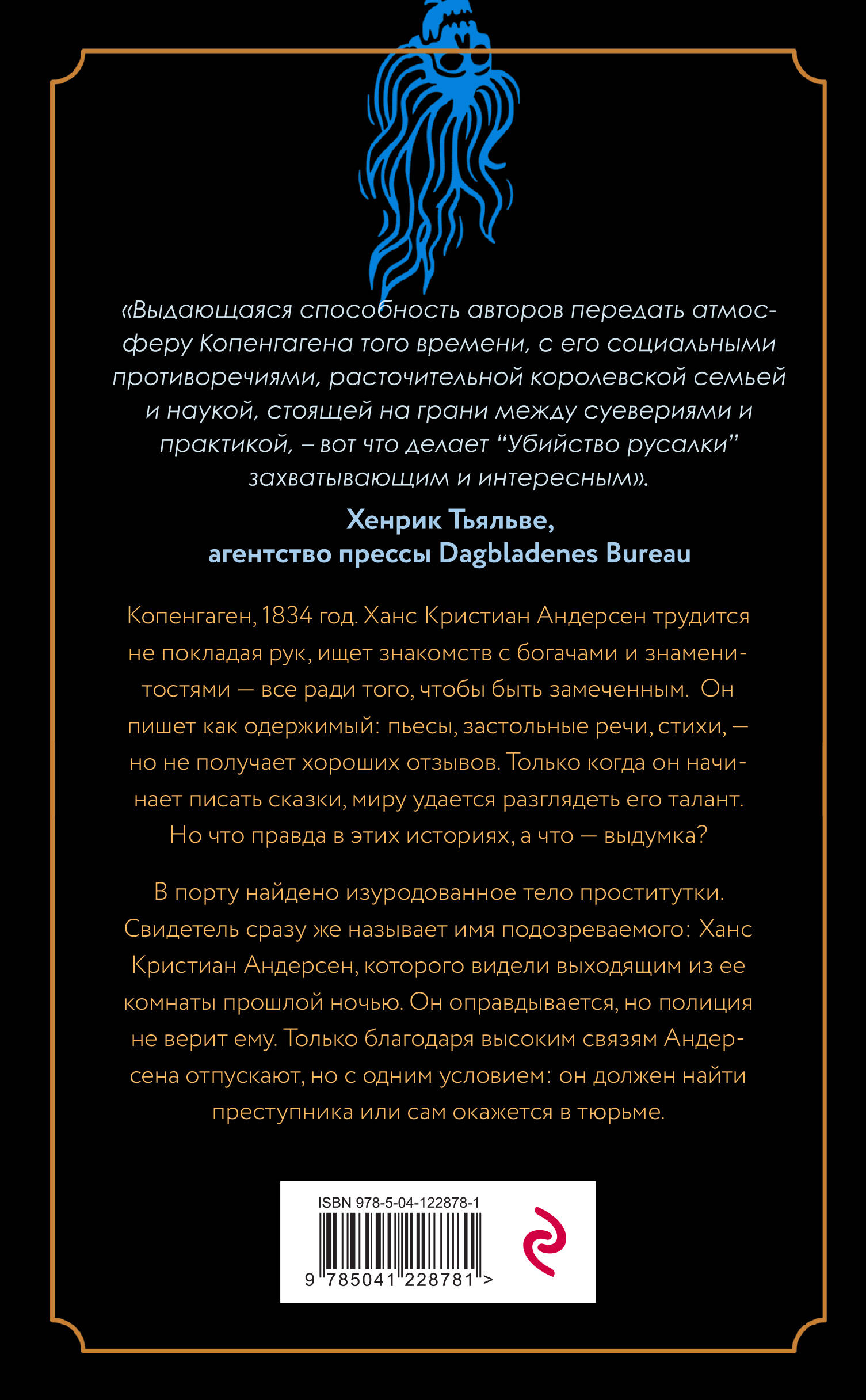 Уникальный исторический триллер, предлагающий неожиданную версию происхождения "Русалочки". Копенгаген, 1834 год. Ханс Кристиан Андерсен трудится не покладая рук, ищет знакомств с богачами и знаменитостями - все ради того, чтобы быть замеченным. Он пишет, как одержимый: пьесы, застольные речи, стихи о любви - но не получает хороших отзывов. Только когда он начинает писать сказки, миру удается разглядеть его талант. Но что правда в этих историях, а что - выдумка? В порту найдено изуродованное тело проститутки. Свидетель сразу же называет имя подозреваемого: Ханс Кристиан Андерсен, которого видели выходящим из ее комнаты прошлой ночью. Он оправдывается, но полиция не верит ему. Только благодаря высоким связям Андерсена отпускают, но с одним условием: он должен найти преступника или сам окажется в тюрьме. «Убийство русалки» - настоящее путешествие сквозь время и пространство. Томас Ридаль и А. Й. Казински - это даже не дуэт, а трио авторов, которым вместе удалось создать альтернативную историю великого поэта и писателя. Настолько увлекательную, что хочется считать ее настоящей.| Издательство | Эксмо |
