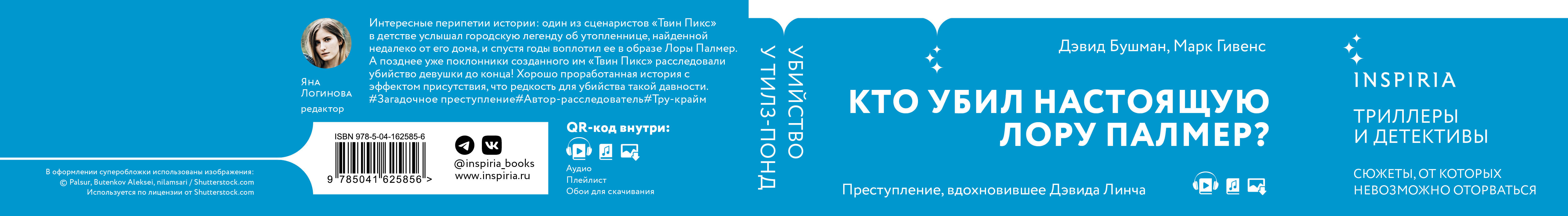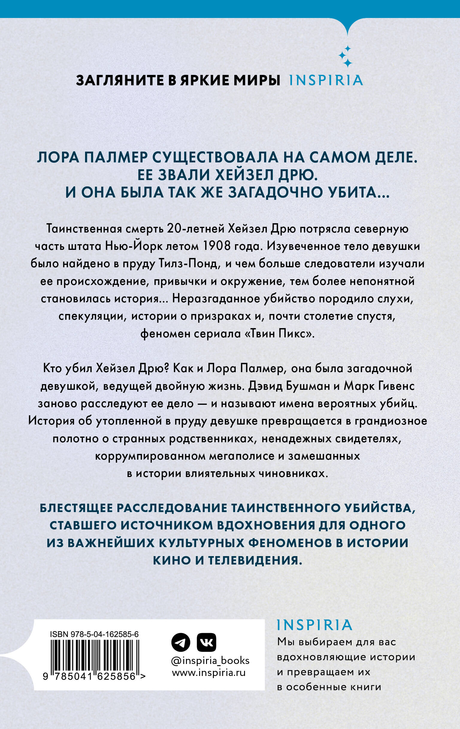 ЛОРА ПАЛМЕР СУЩЕСТВОВАЛА НА САМОМ ДЕЛЕ. ЕЕ ЗВАЛИ ХЕЙЗЕЛ ДРЮ. И ОНА БЫЛА ТАК ЖЕ ЗАГАДОЧНО УБИТА. Летом 1908 года убийство Хейзел Дрю потрясло северную часть штата Нью-Йорк. Изувеченное тело двадцатилетней девушки было найдено в пруду, и чем больше следователи изучали ее происхождение, привычки и окружение, тем более непонятной становилась история... Неразгаданное убийство породило слухи, спекуляции, истории о призраках и, почти столетие спустя, феномен сериала «Твин Пикс». Один из сценаристов сериала, Марк Фрост, воплотил образ Хейзел Дрю, о которой часто слышал в детстве от своих бабушки и дедушки, в образе Лоры Палмер... Кто убил Хейзел Дрю? Как и Лора Палмер, она была загадочной девушкой, ведущей двойную жизнь. Дэвид Бушман и Марк Гивенс заново расследуют ее дело - и называют имена вероятных убийц. История об утопленной в пруду Тилз-Понд девушке превращается в грандиозное полотно о странных родственниках, ненадежных свидетелях, коррумпированном мегаполисе и замешанных в истории влиятельных чиновниках. Блестяще проработанное расследование таинственного убийства, ставшего источником вдохновения для одного из важнейших культурных феноменов в истории кино и телевидения. ------------------------------ «В тщательно проработанной книге Дэвида Бушмана и Марка Гивенса двойником Лоры Палмер является Хейзел Дрю, юная красавица с темными секретами, найденная мертвой в пруду недалеко от Олбани в 1908 году. Сто пятнадцать лет спустя Бушмен и Гивенс, шаг за шагом, подозреваемый за подозреваемым, раскрывают тайну ее нераскрытого убийства». - Vanity Fair «Кто убил двадцатилетнюю Хейзел Дрю и оставил ее тело в пруду на севере штата Нью-Йорк в 1908 году? В этом остросюжетном криминальном романе Бушман и Гивенс расследуют убийство, которое вдохновило на создание культового телесериала "Твин Пикс". Авторы эффективно обобщают пять лет исследований, используя ряд источников, и рисуют убедительную картину событий, которая заставляет читателей чувствовать, что они наблюдают за событиями в реальном времени». - Publishers Weekly| Издательство | ООО "Издательство "Эксмо" |