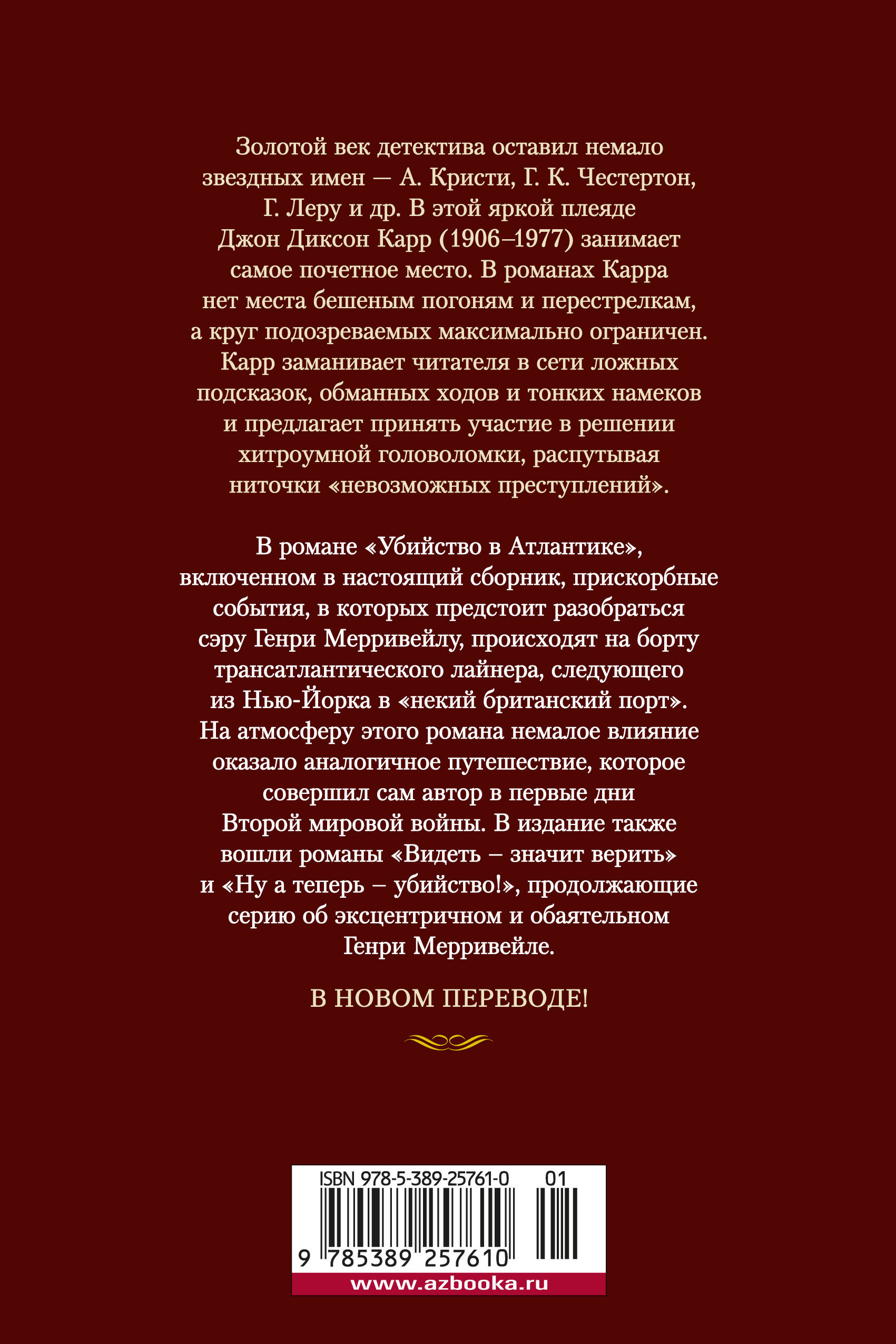 Золотой век детектива оставил немало звездных имен - А. Кристи, Г. К. Честертон, Г. Леру и др. В этой яркой плеяде Джон Диксон Карр (1906-1977) занимает самое почетное место. В романах Карра нет места бешеным погоням и перестрелкам, а круг подозреваемых максимально ограничен. Карр заманивает читателя в сети ложных подсказок, обманных ходов и тонких намеков и предлагает принять участие в решении хитроумной головоломки, распутывая ниточки "невозможных преступлений". В романе "Убийство в Атлантике", включенном в настоящий сборник, прискорбные события, в которых предстоит разобраться сэру Генри Мерривейлу, происходят на борту трансатлантического лайнера, следующего из Нью-Йорка в "некий британский порт". На атмосферу этого романа немалое влияние оказало аналогичное путешествие, которое совершил сам автор в первые дни Второй мировой войны. В издание также вошли романы "Видеть - значит верить" и "Ну а теперь - убийство!", продолжающие серию об эксцентричном и обаятельном Генри Мерривейле. В новом переводе!| Издательство | Азбука-Аттикус Издат.группа ООО |
