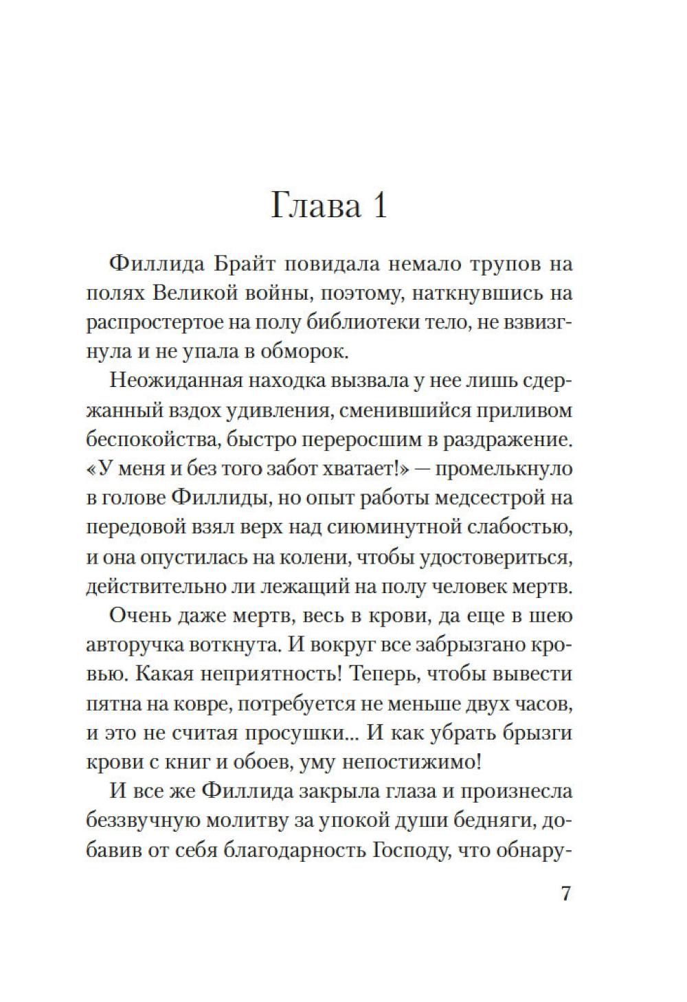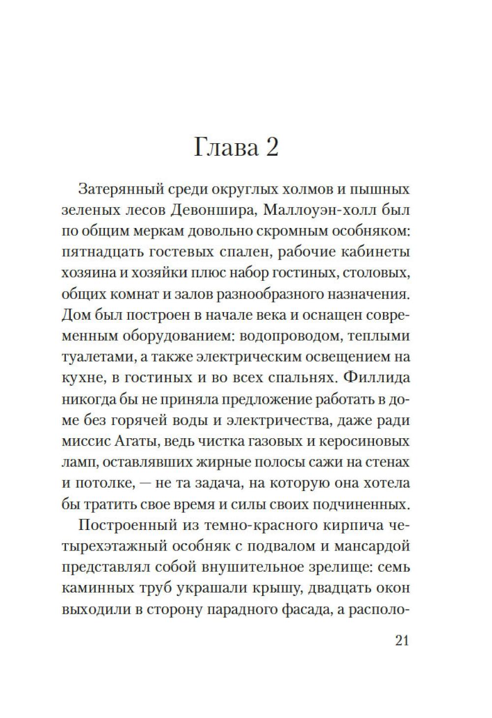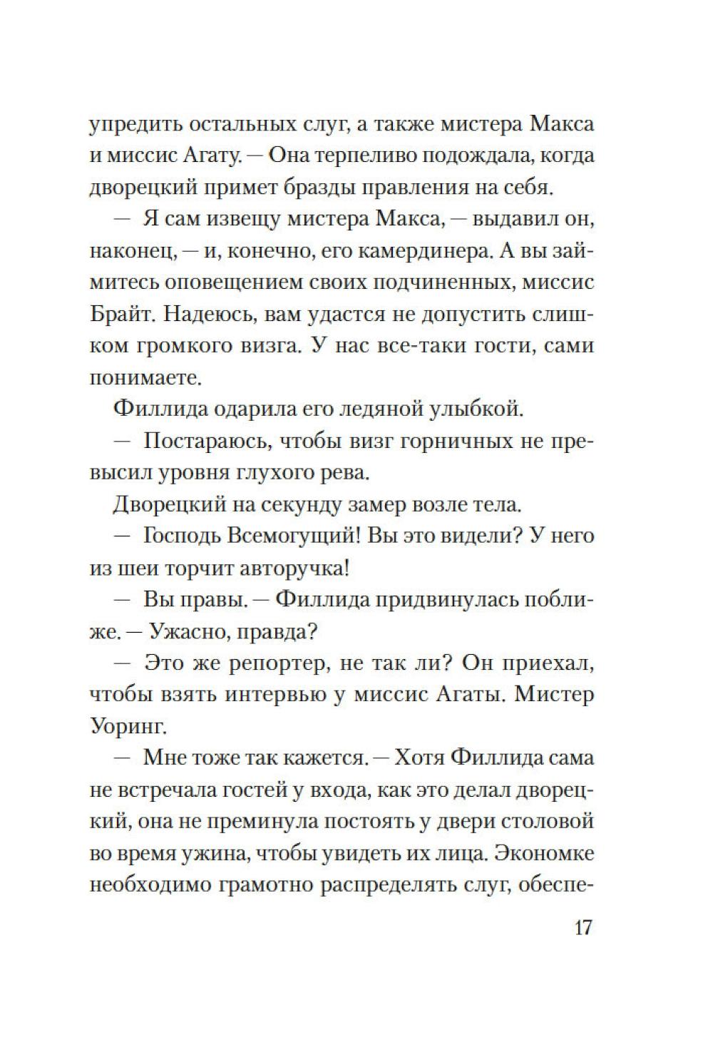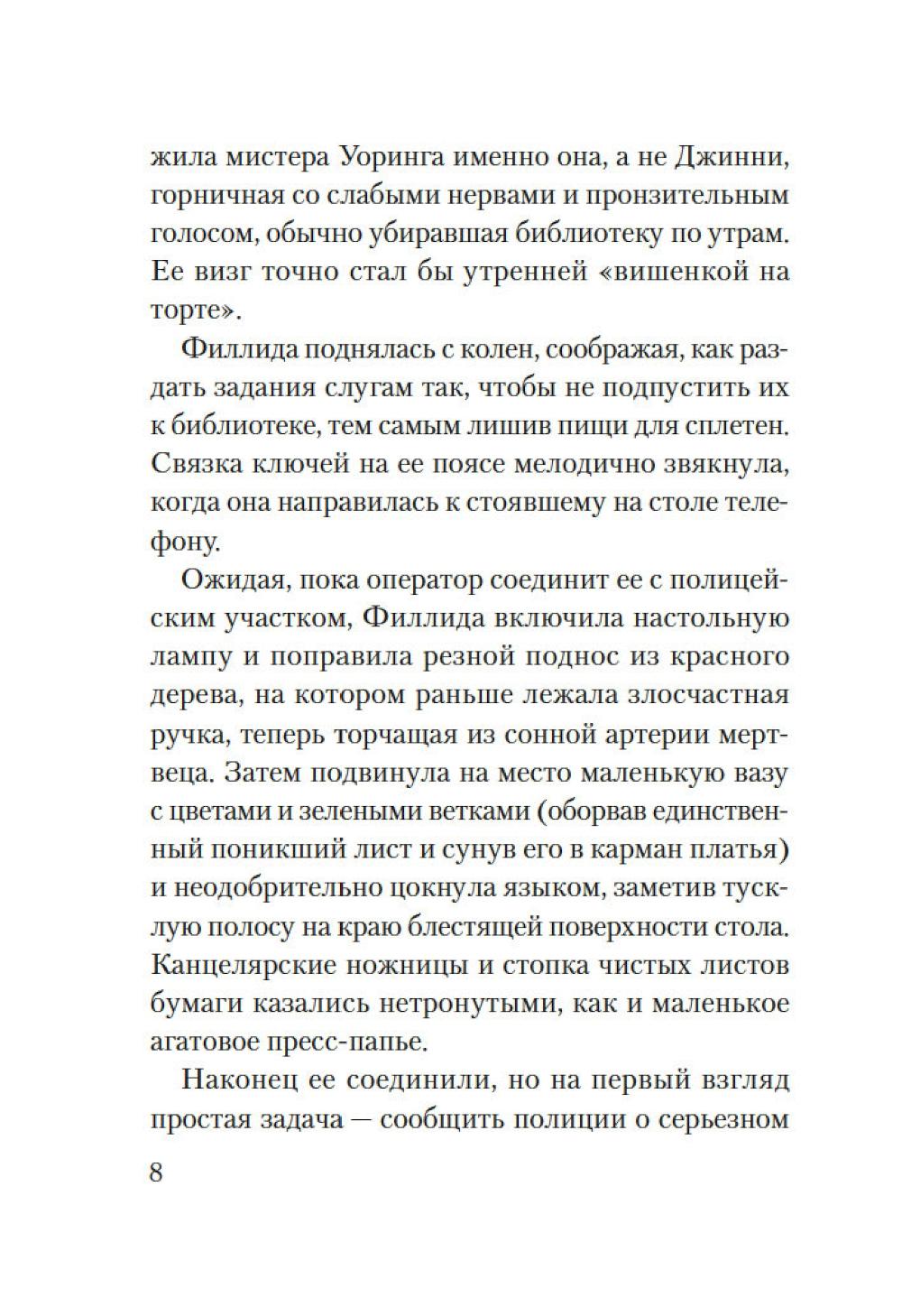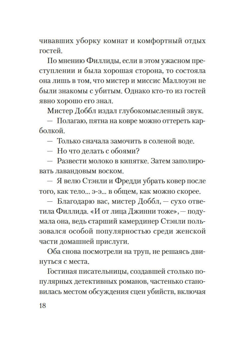 Филлида Брайт управляет хозяйством в поместье, затерянном среди зеленых холмов Девоншира. Но это вовсе не заурядный загородный дом - поместье принадлежит мужу знаменитой Агаты Кристи, давней подруги Филлиды. За ужином хозяева обсуждают с гостями оригинальные способы убийства, но, когда наутро Филлида находит в библиотеке труп, это становится для нее неожиданностью... Экономка пытается помочь полиции, но тщетно, и ей приходится расследовать преступление самостоятельно. А после второго убийства сомнений не остается: убийца - один из гостей!| Издательство | Иностранка |