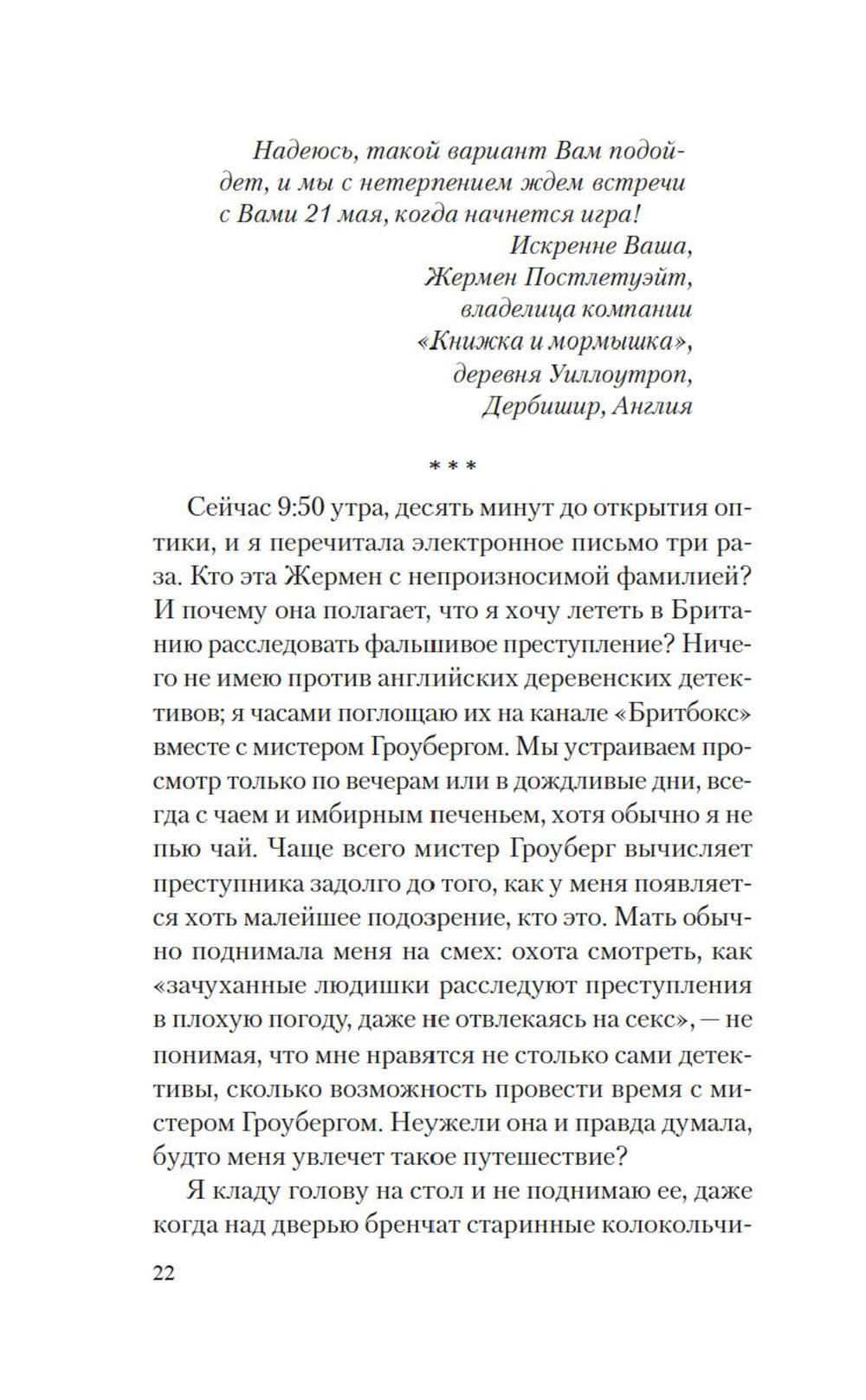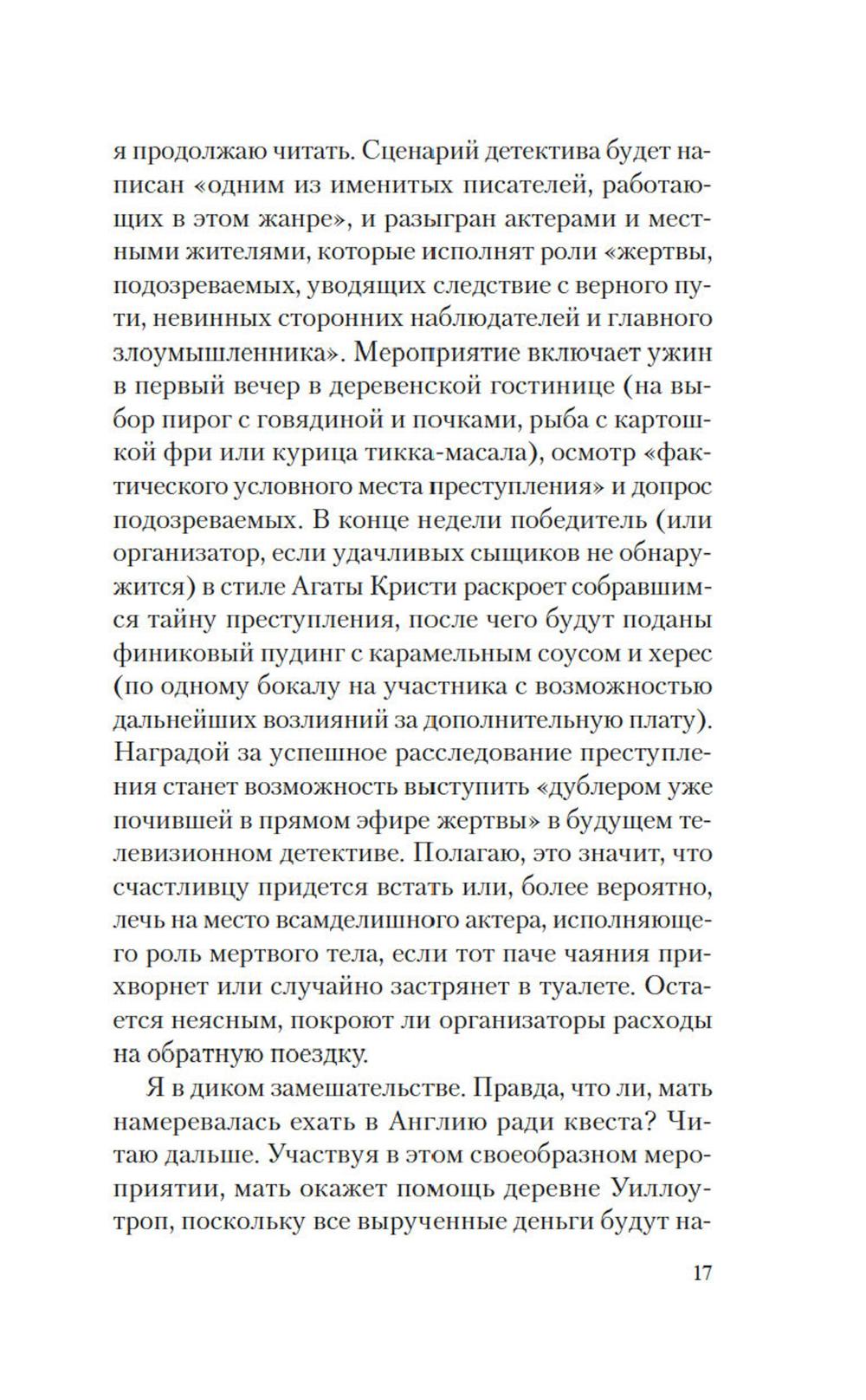 Смерть матери вызывает у молодой американки Кэт двойственное чувство. С одной стороны, теперь она круглая сирота, с другой - мать и так постоянно отсутствовала, колеся по стране в поисках новых ощущений. Сама же Кэт ведет тихую жизнь в родном Буффало и сознательно избегает бурных страстей и импульсивных решений. Но однажды, разбирая мамины вещи, девушка внезапно обнаруживает путевку в живописную английскую деревушку, где проводится детективный квест: местные жители инсценируют сюжет с убийством, которое гости, поклонники классических британских детективов, должны раскрыть за семь дней. Озадаченная, но и заинтригованная тайными намерениями матери, Кэт решает отправиться в Англию в одиночку - и погружается в круговерть невероятных событий.| Издательство | Иностранка |