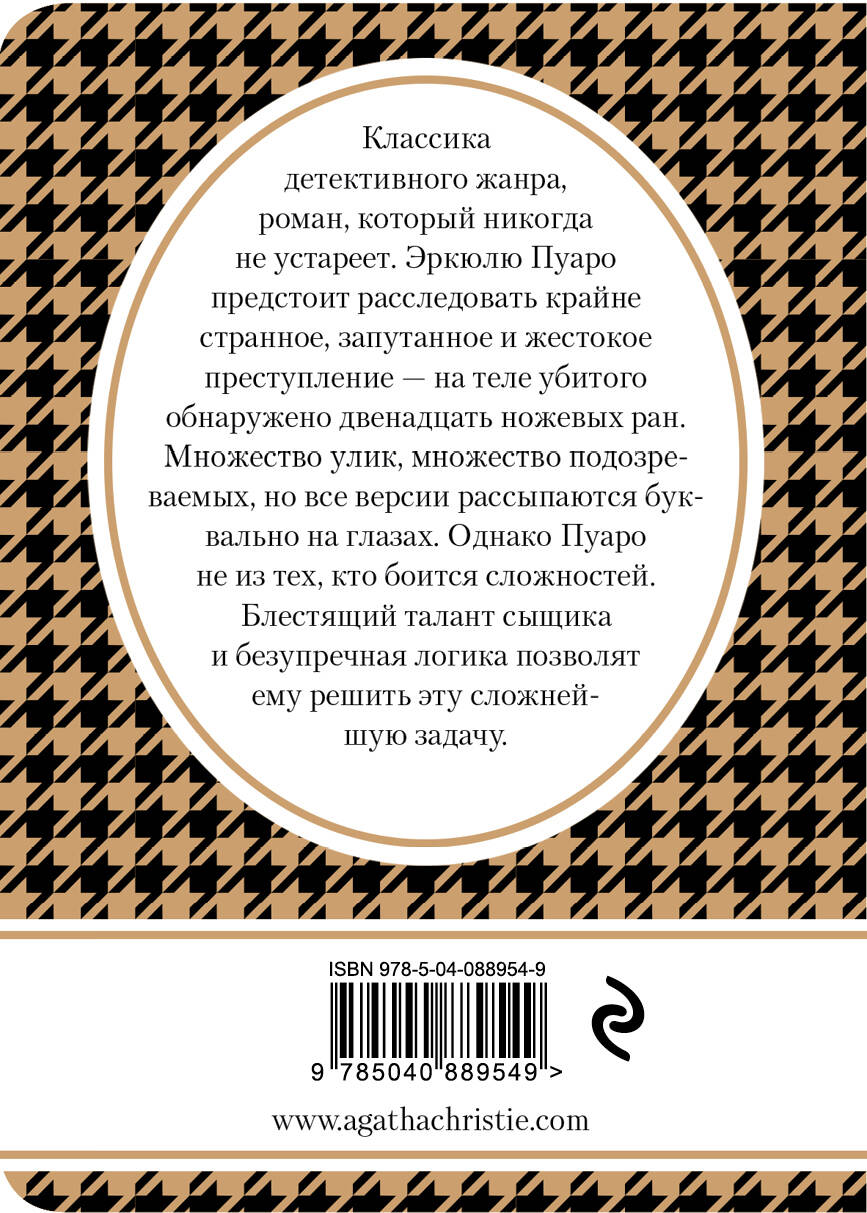 Нестареющая классика британского детектива. Один из самых известных романов королевы детектива. Эркюлю Пуаро предстоит расследовать крайне странное, запутанное и жестокое преступление - в купе по соседству обнаружен труп человека. На теле убитого обнаружено двенадцать ножевых ран. Множество улик, множество подозреваемых, но все версии рассыпаются буквально на глазах. Однако Пуаро не из тех, кто боится сложностей. Блестящий талант сыщика и безупречная логика позволят ему решить эту сложнейшую задачу.