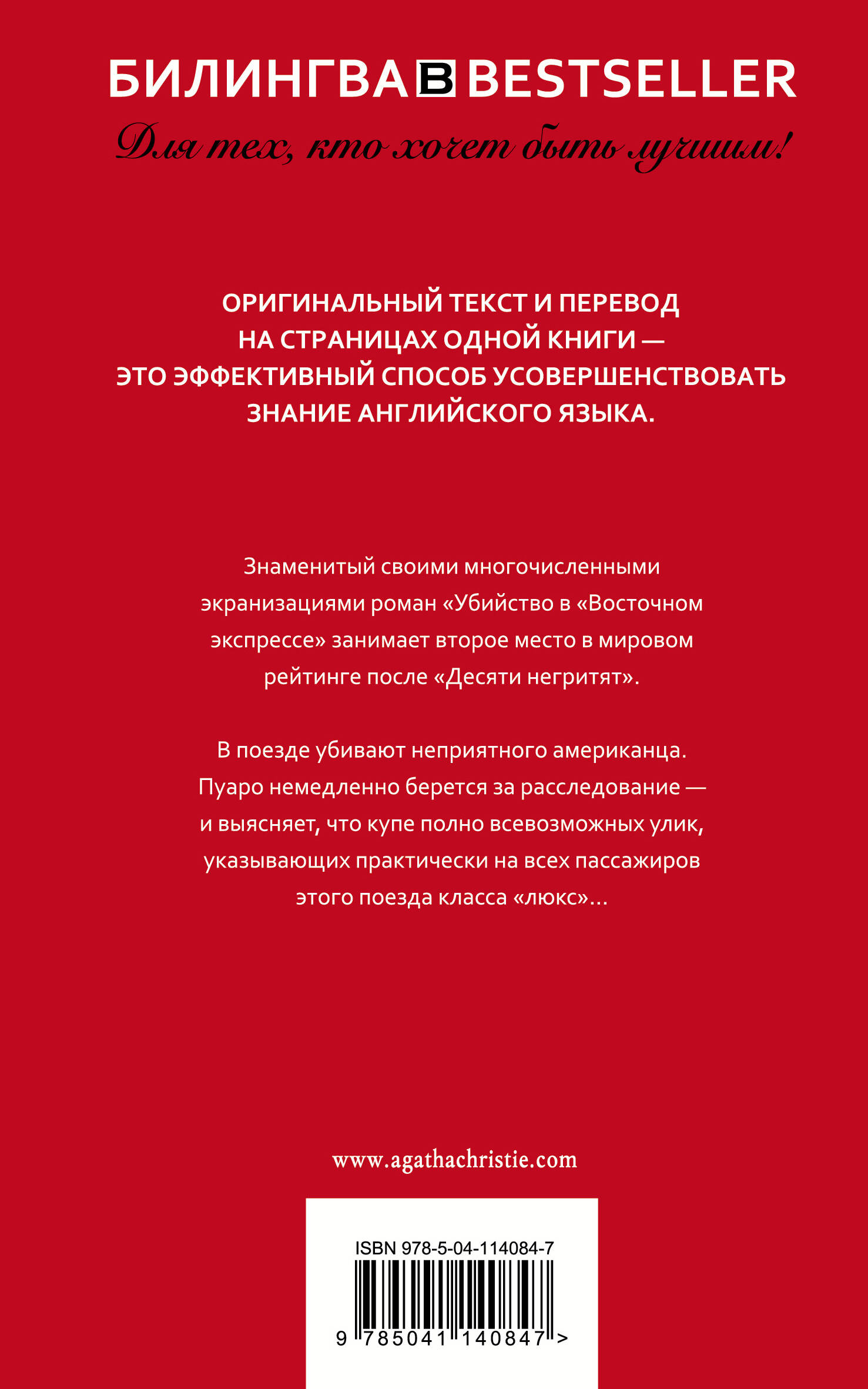 Для тех, кто хочет быть лучшим! Оригинальный текст и перевод на страницах одной книги - это эффективный способ усовершенствовать знание английского языка. Знаменитый своими многочисленными экранизациями роман «Убийство в "Восточном экспрессе"» занимает второе место в мировом рейтинге после «Десяти негритят». В поезде убивают неприятного американца. Пуаро немедленно берется за расследование - и выясняет, что купе полно всевозможных улик, указывающих практически на всех пассажиров знаменитого поезда класса люкс.