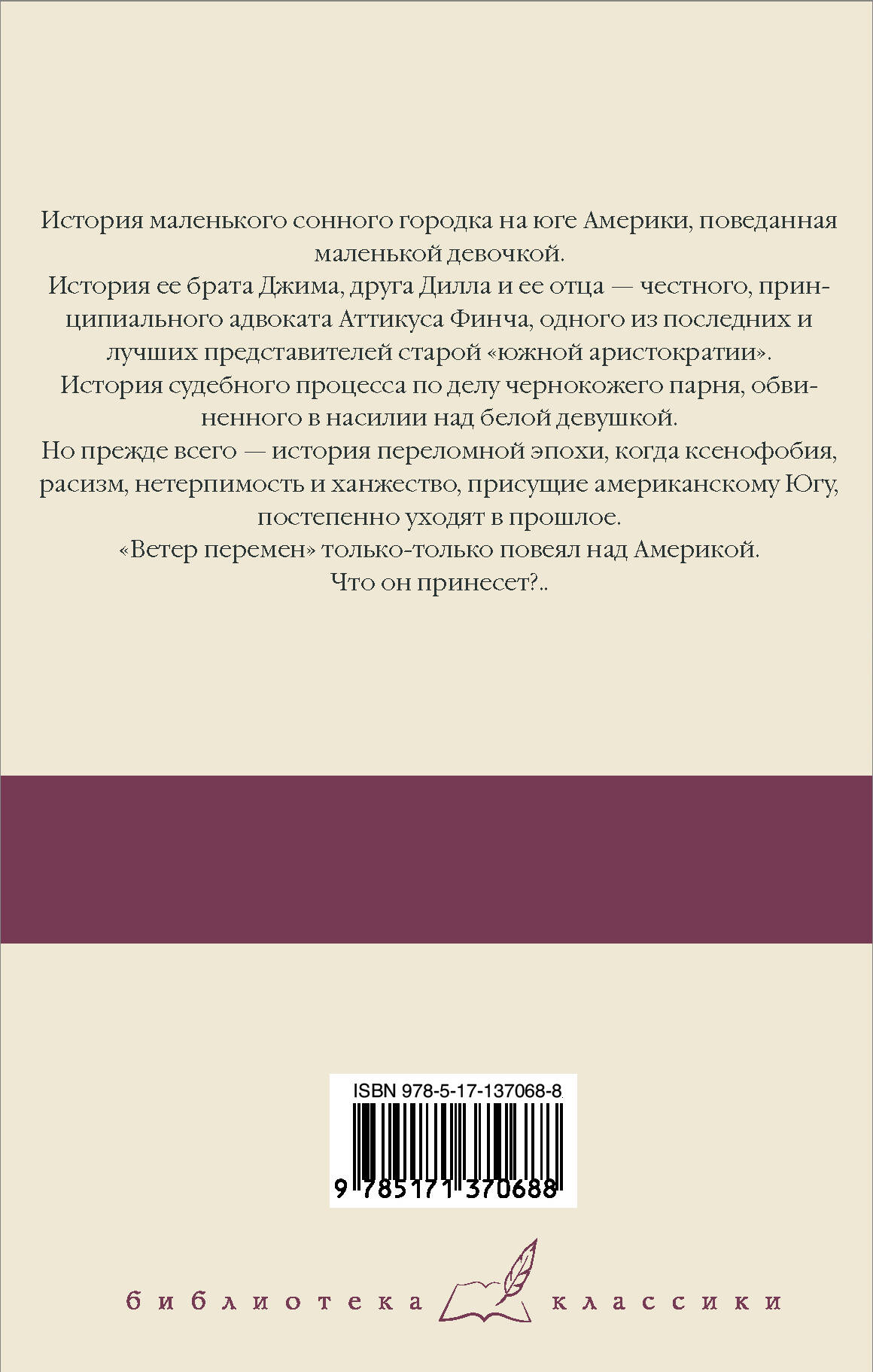 История маленького сонного городка на юге Америки, поведанная маленькой девочкой. История ее брата Джима, друга Дилла и ее отца - честного, принципиального адвоката Аттикуса Финча, одного из последних и лучших представителей старой "южной аристократии". История судебного процесса по делу чернокожего парня, обвиненного в насилии над белой девушкой. Но прежде всего - история переломной эпохи, когда ксенофобия, расизм, нетерпимость и ханжество, присущие американскому югу, постепенно уходят в прошлое. "Ветер перемен" только-только повеял над Америкой. Что он принесет?..| Издательство | ИЗДАТЕЛЬСТВО "АСТ" |