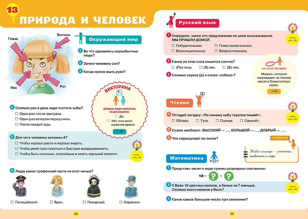 Страницы «Заработай баллы» - это задания по основным темам школьной программы, которые позволяют проверить знания ребёнка и оценить результат в баллах. Ответы на основные вопросы собраны в единый блок и размещены в середине издания. При желании вы можете вынуть их, чтобы проконтролировать знания ребёнка.