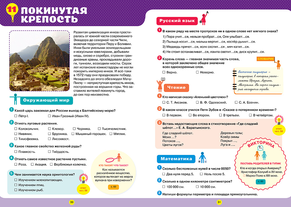 Страницы «Заработай баллы» - это задания по основным темам школьной программы, которые позволяют проверить знания ребёнка и оценить результат в баллах. Ответы на основные вопросы собраны в единый блок и размещены в середине издания. При желании вы можете вынуть их, чтобы проконтролировать знания ребёнка.