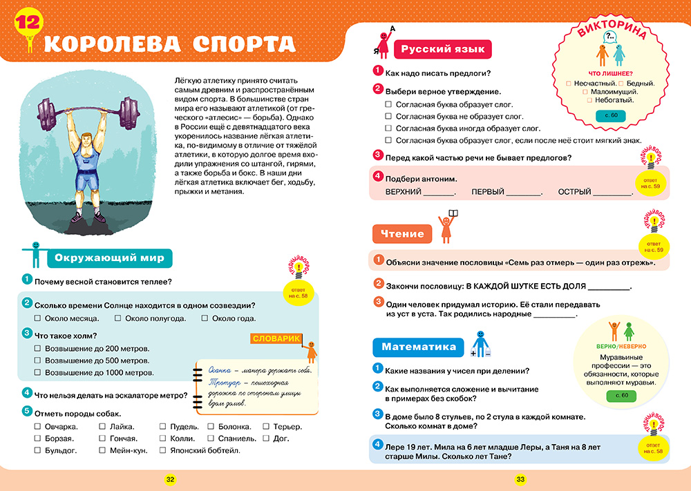 3 фишки:<br>- Все предметы в одной книге!<br>- Упражнения для закрепления материала.<br>- Гид для родителей + ответы на все задания.<br>Описание книги.<br>Проведите каникулы с большой пользой! Авторы учебника - известные педагоги, их обучающие пособия любят и дети, и родители.<br>С помощью увлекательных заданий ваш школьник:<br>- Прочно усвоит и закрепит школьную программу<br>- Сможет подготовиться к интеллектуальным марафонам и олимпиадам<br>- Будет развивать память, внимание и речь, а также мелкую моторику<br>- Превратит учебу в увлекательную игру.<br>Тематические страницы «Сделай сам» направлены на развитие творческих способностей ребёнка, они учат его своими руками создавать умные поделки, не боясь при этом экспериментировать.<br>Страницы «Заработай баллы» - это задания по основным темам школьной программы, которые позволяют проверить знания ребёнка и оценить результат в баллах. Ответы на основные вопросы собраны в единый блок и размещены в середине издания. При желании вы можете вынуть их, чтобы проконтролировать знания ребёнка.<br>Лайфхак для родителей.<br>•Не допускайте, чтобы ребенок скучал во время занятий. Интерес - сильнейший мотив обучения, позволяющий испытывать радость от интеллектуальных занятий.<br>•Развитие способностей напрямую определяется временем и постоянной практикой. Лучше заниматься понемногу, но постоянно.<br>•Не проявляйте излишней тревоги по поводу недостаточных успехов или медленного продвижения вперед: когда от детей ожидают выдающихся результатов, они действительно начинают их показывать, даже если раньше считались не очень способными.<br>•В занятиях с ребенком нужна мера. Не перегружайте его.<br>•Избегайте неодобрительной оценки, находите слова поддержки и чаще хвалите.<br>Что развиваем?<br>- Память.<br>- Внимание.<br>- Навыки письма.<br>- Сообразительность.<br>- Логическое мышление.<br>Про автора.<br>Ольга Васильевна Узорова - учитель, автор учебных пособий для начальной школы. Родилась в Москве. Окончила педагогический университет, работала в младших классах гимназии. Разработанные ею дидактические материалы легли в основу различных развивающих книг. Совместно с педагогом Еленой Нефедовой она выпустила более 300 учебных пособий для начальной школы - русскому языку, математике, рассказывающих об окружающем мире. Среди них - рабочие тетради, учебники, тесты.<br>Эти пособия научат быстро читать и считать в начальной школе.<br><br>Возраст: 7-11 лет.| Автор/составитель | Нефёдова Елена Алексеевна |
