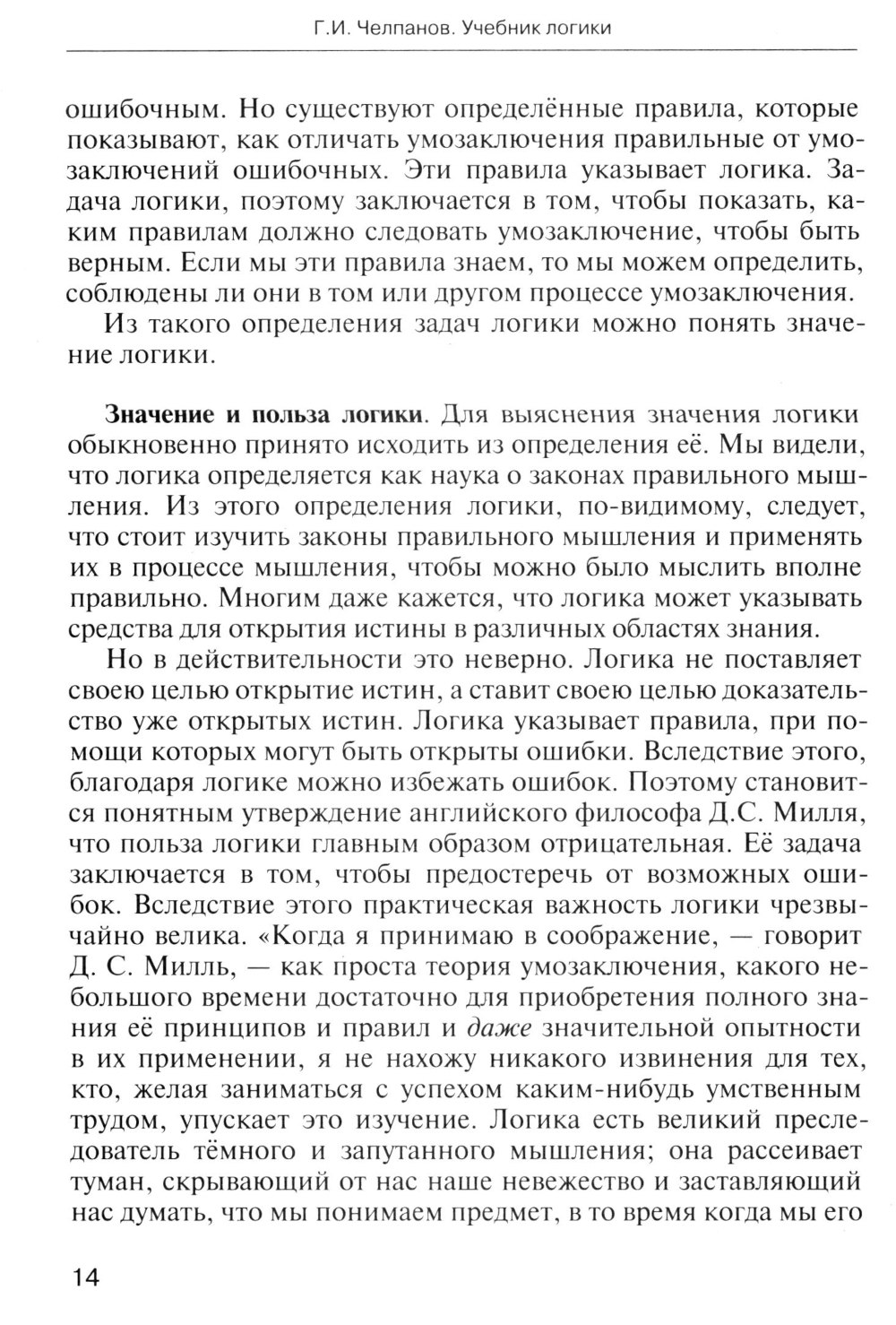 Изучение логики - науки о правильном мышлении является одним из обязательных этапов в становлении образованного и культурного человека, особенно в наше время, когда общественное сознание подвергается разного рода манипуляциям, основанным на пренебрежении к логике. В этом плане «Учебник логики» русского философа, логика и психолога Георгия Ивановича Челпанова (1862-1936) может послужить великолепным пособием по изучению этой древней и чрезвычайно важной науки. Выдержавший несколько изданий до революции, он и в наши дни пользуется заслуженной популярностью. Среди его достоинств - простой и понятный стиль изложения, обилие примеров и пояснений к правилам. Издание предназначено для всех, кто изучает и преподаёт логику - студентов, аспирантов, преподавателей вузов, а также для тех, кто осваивает её самостоятельно.| Издательство | Амрита-Русь |