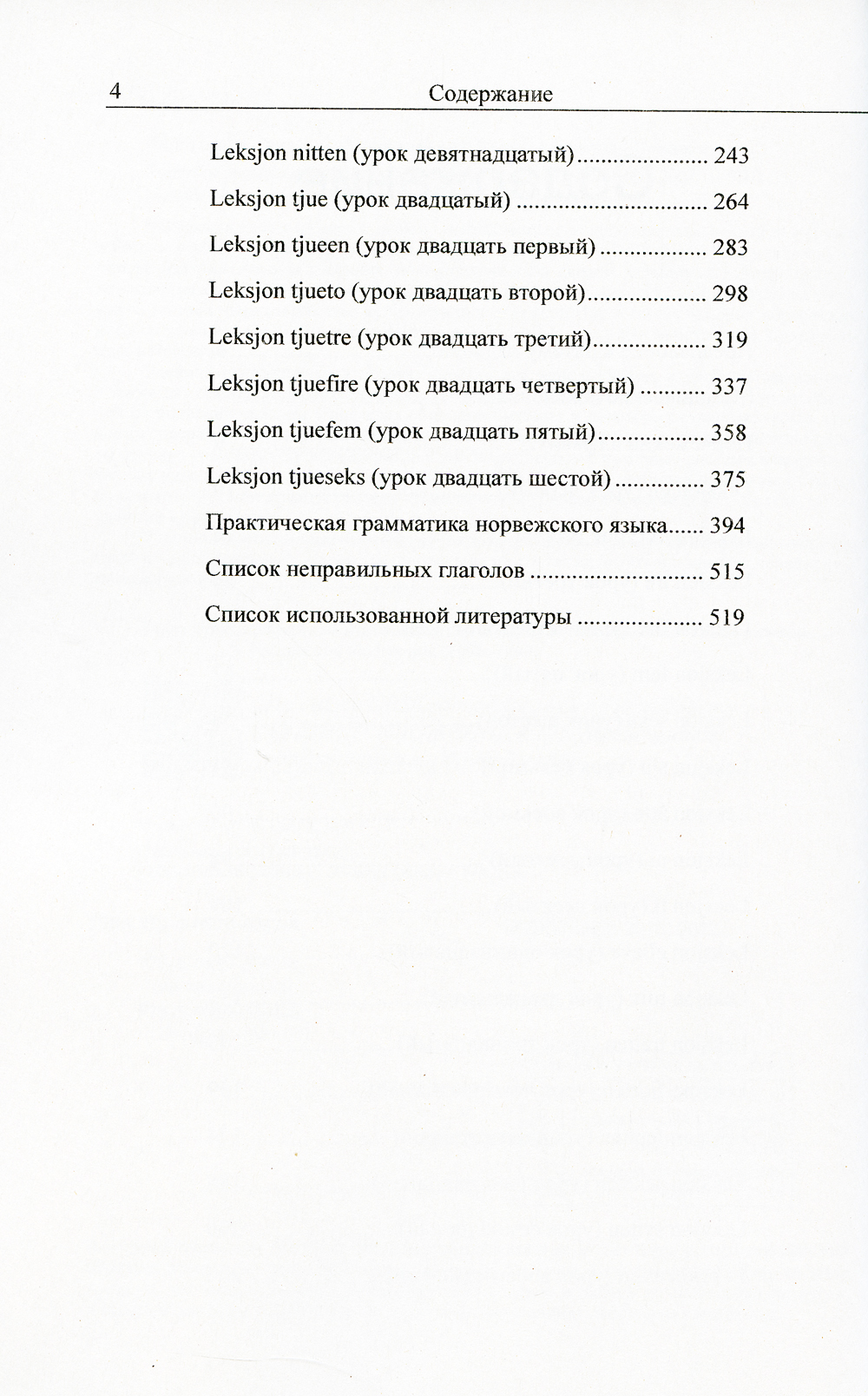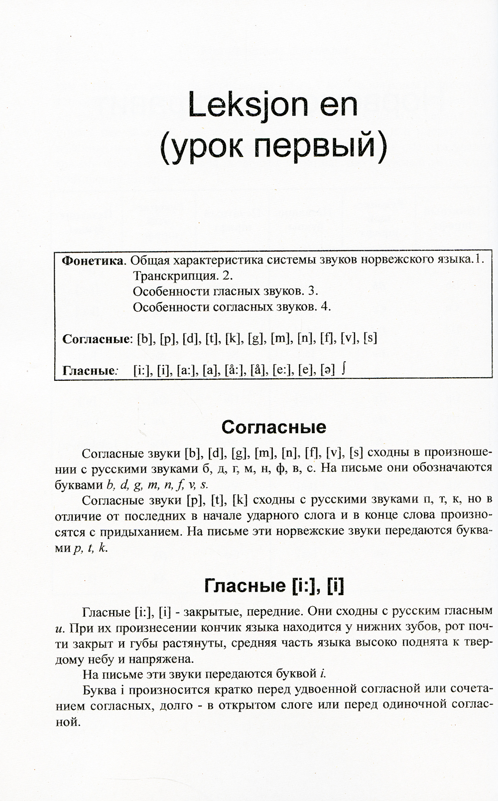 Настоящая книга является новым, исправленным и дополненным изданием первого в России учебника норвежского языка, впервые вышедшего в 2001 году и пережившего уже четыре издания. Авторы учебника, подготовленного в первом издании на кафедре скандинавских языков МГИМО (У) МИД России, ориентировались как на традиции создания учебников по иностранным языкам, существующие в России, так и на достижения норвежских авторов учебников и учебных пособий по норвежскому языку для иностранцев, проживающих в Норвегии. Учебник предназначен в первую очередь для использования в учебных заведениях, а также для самостоятельного изучения. Цель учебника - привитие навыков устного общения на норвежском языке в пределах обиходно-бытовых и некоторых страноведческих тем. Книга содержит вводно-фонетический курс и основной курс с последовательным изложением лексико-грамматического материала и его закреплением с помощью системы коммуникативных упражнений и поурочными комментариями. В уроках учебника содержатся ссылки на соответствующие пункты раздела «Практическая грамматика норвежского языка», помещенного в конце книги. Учебник адресован широкому кругу лиц, впервые приступающих к изучению норвежского языка и желающих научиться говорить на нем, а также читать и понимать норвежскую письменную речь.| Издательство | ЛЕНАНД |