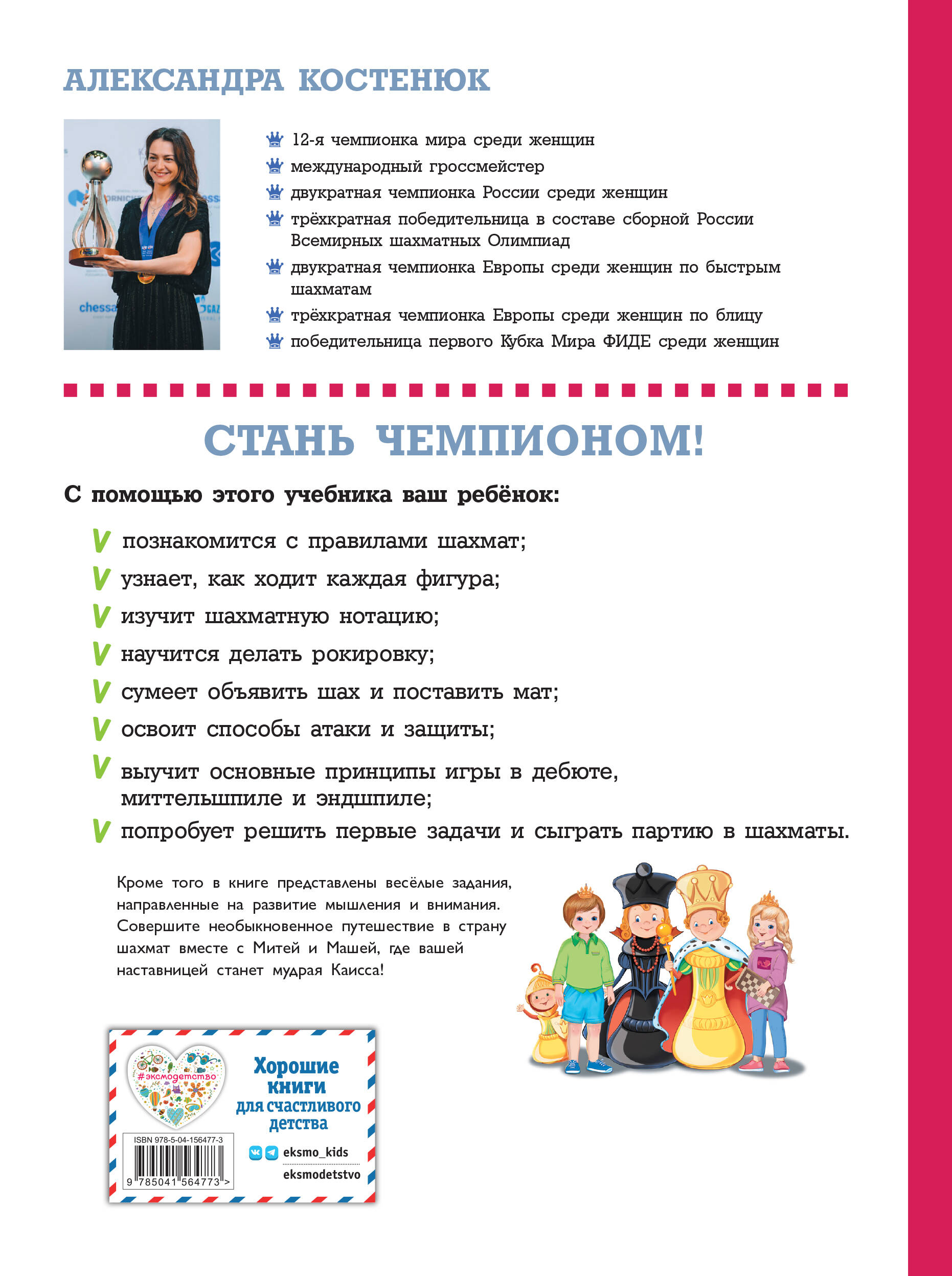 Учитесь играть в шахматы вместе с 12-й чемпионкой мира Александрой Костенюк! Материал этого учебника основан на методике, которая уже более 15 лет используется в её шахматной школе. Чёткая структура, практические задания, яркие забавные иллюстрации, а также весёлые задачки для досуга призваны сделать обучение этой игре не только лёгким, но ещё и весёлым. Благодаря изучению шахмат у детей развивается внимание, мышление, логика, усидчивость. К тому же им будет интересно узнавать азы шахмат вместе со своими ровесниками - любопытным Митей и жизнерадостной Машей. А на все их непростые вопросы ответит покровительница шахматной страны Каисса! В дополнение к учебнику мы рекомендуем использовать рабочую тетрадь из этой же серии.| Издательство | ООО "Издательство "Эксмо" |