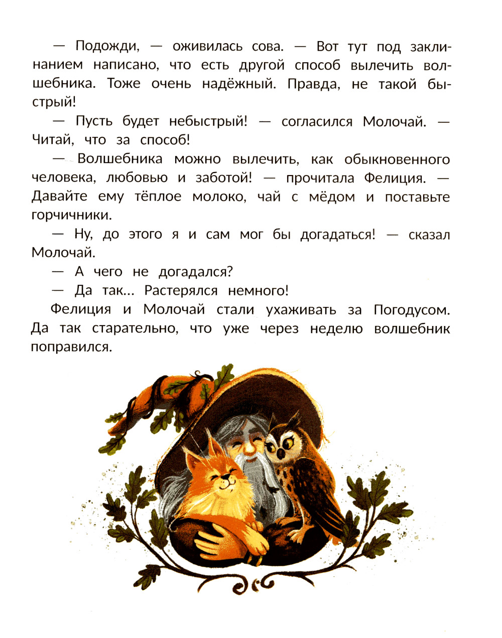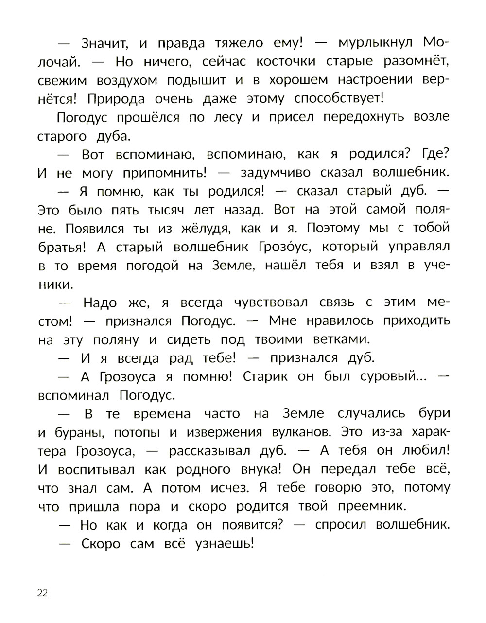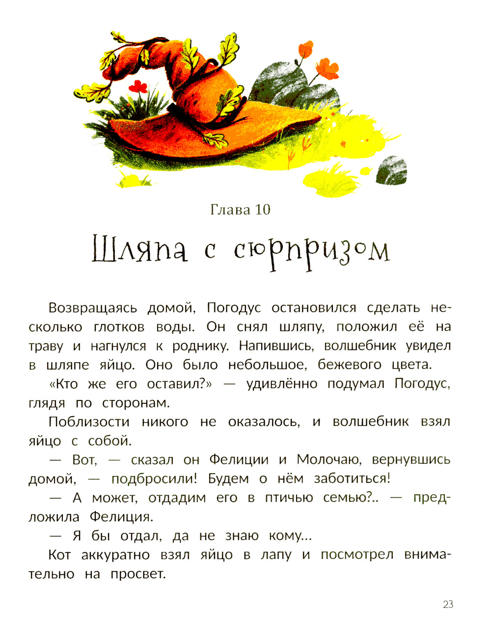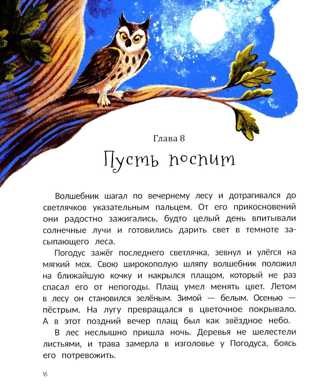 В домике на окраине леса живёт волшебник по имени Погодус. Он следит за сменой времён года, вызывает дождь, снег и туман, рисует радугу, перекрашивает к весне зайцев, готовит луну и приклеивает к небу звёзды. Стареющий волшебник чувствует, что ему нужен ученик, и однажды находит у себя в шляпе яйцо, из которого вылупляется маленькая девочка...| Издательство | Феникс |