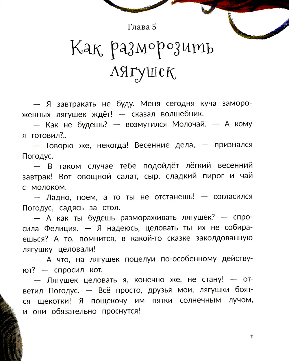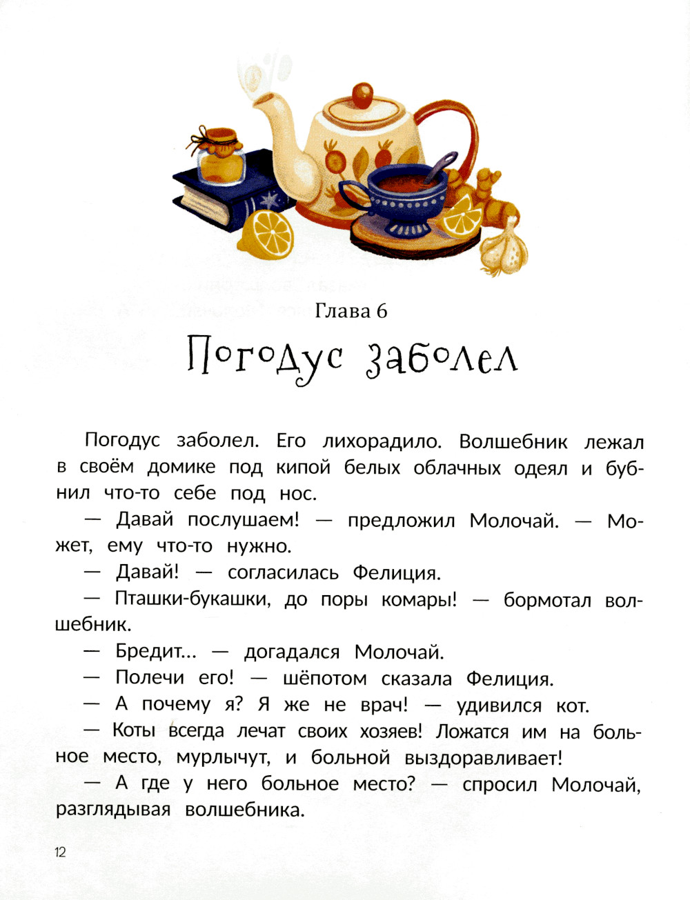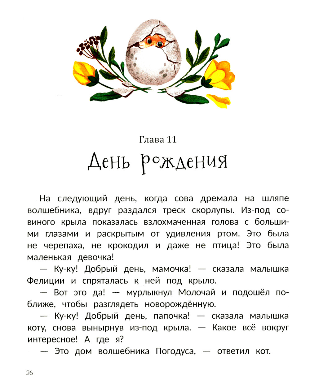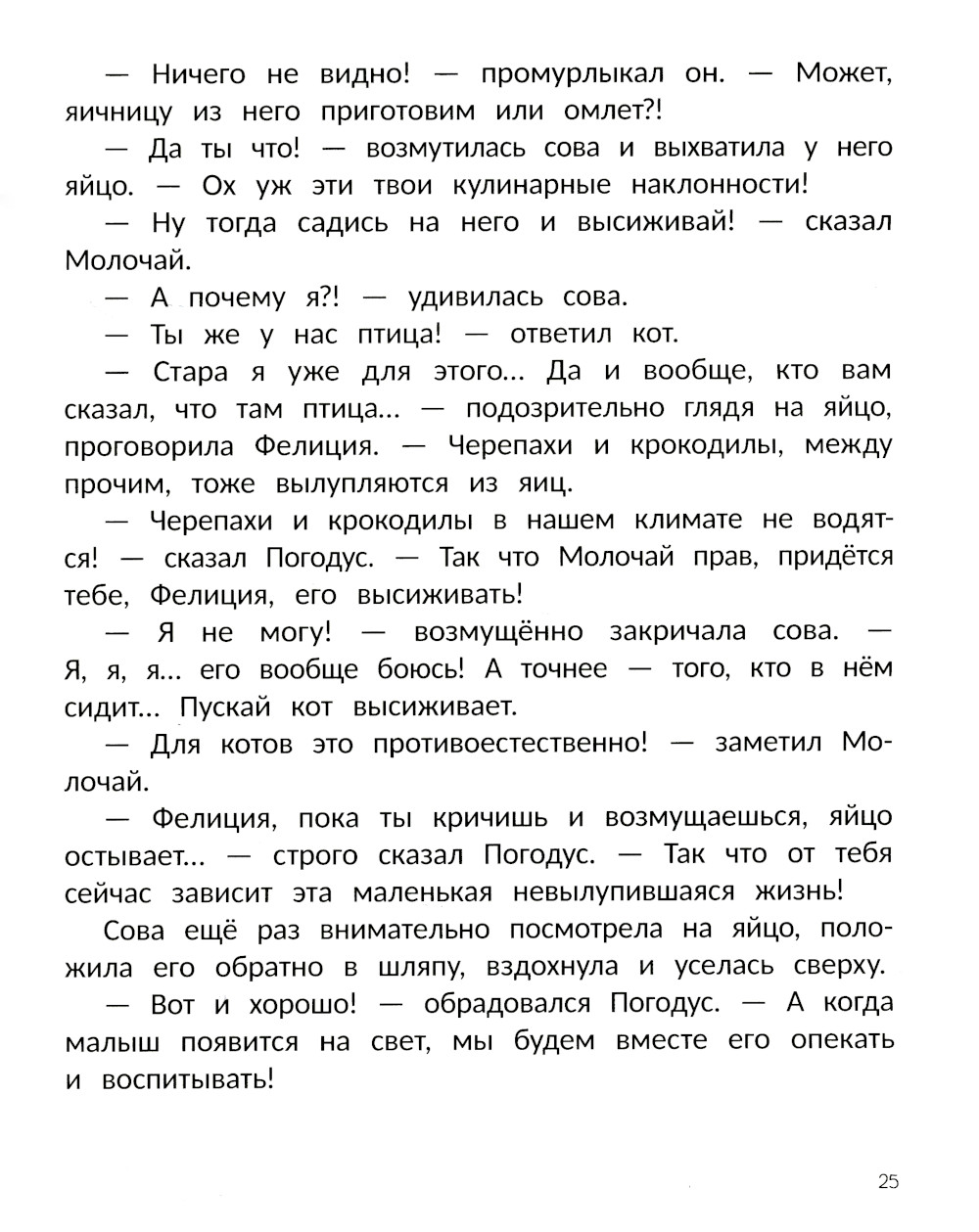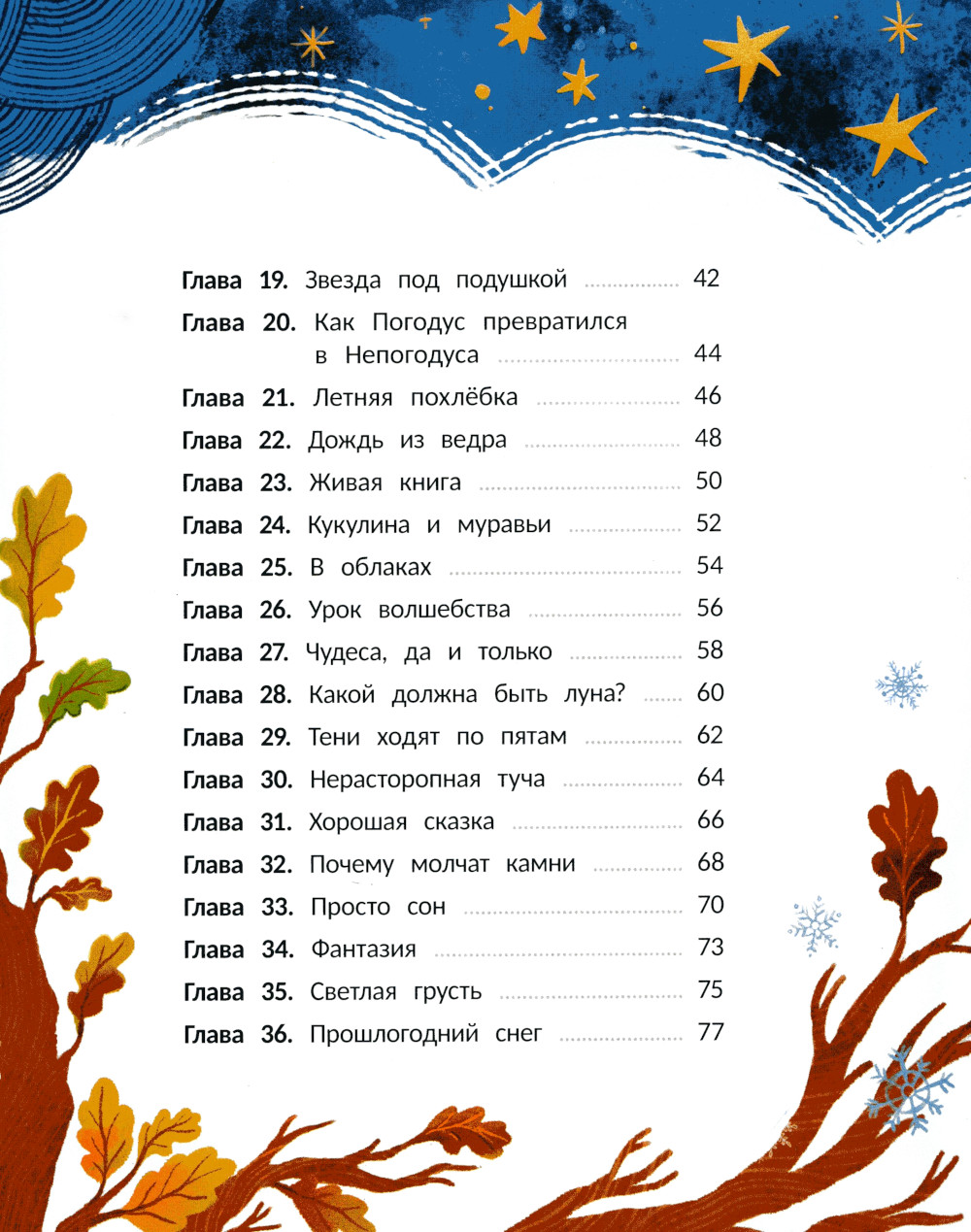 В домике на окраине леса живёт волшебник по имени Погодус. Он следит за сменой времён года, вызывает дождь, снег и туман, рисует радугу, перекрашивает к весне зайцев, готовит луну и приклеивает к небу звёзды. Стареющий волшебник чувствует, что ему нужен ученик, и однажды находит у себя в шляпе яйцо, из которого вылупляется маленькая девочка...| Издательство | Феникс |
