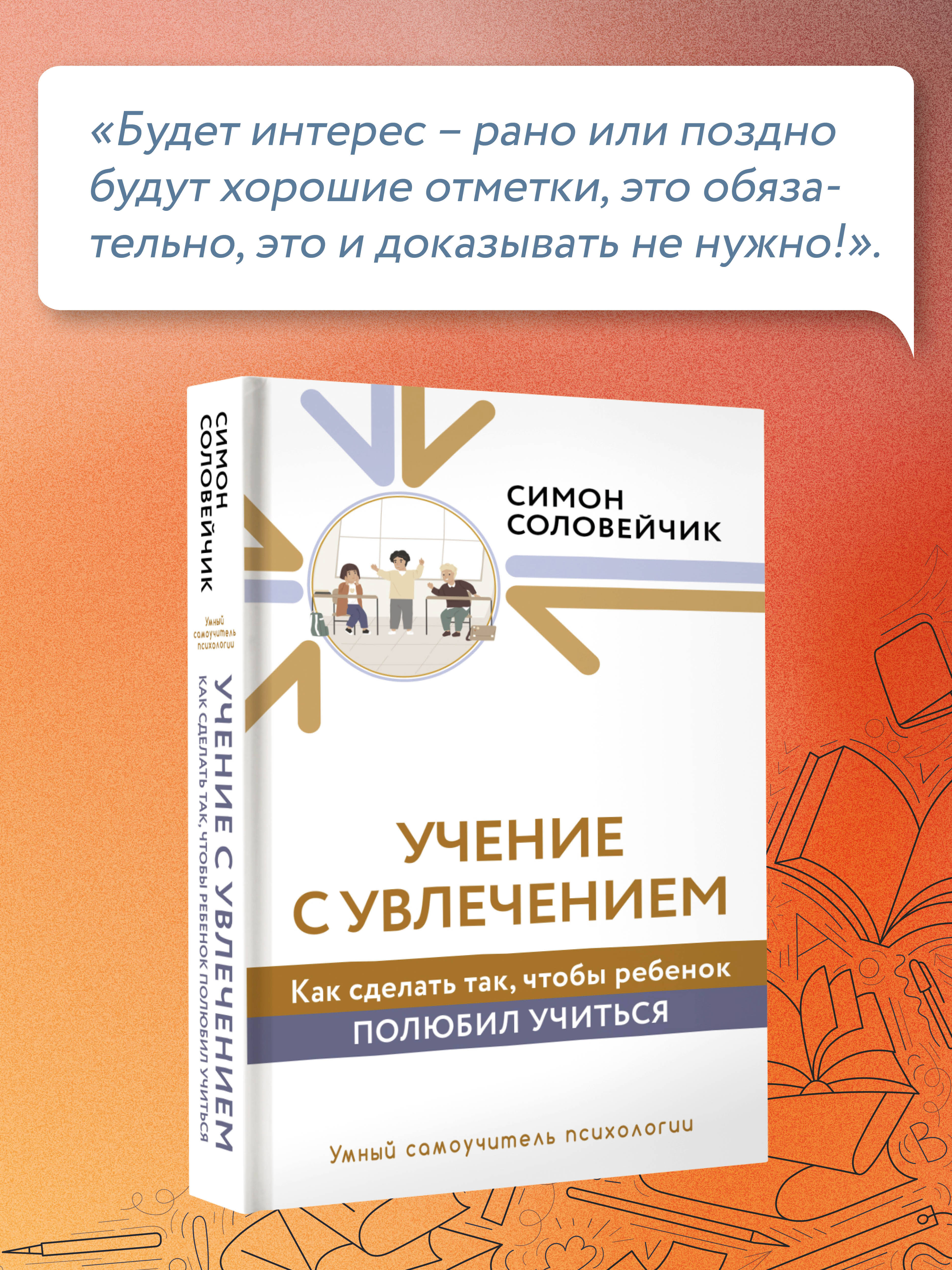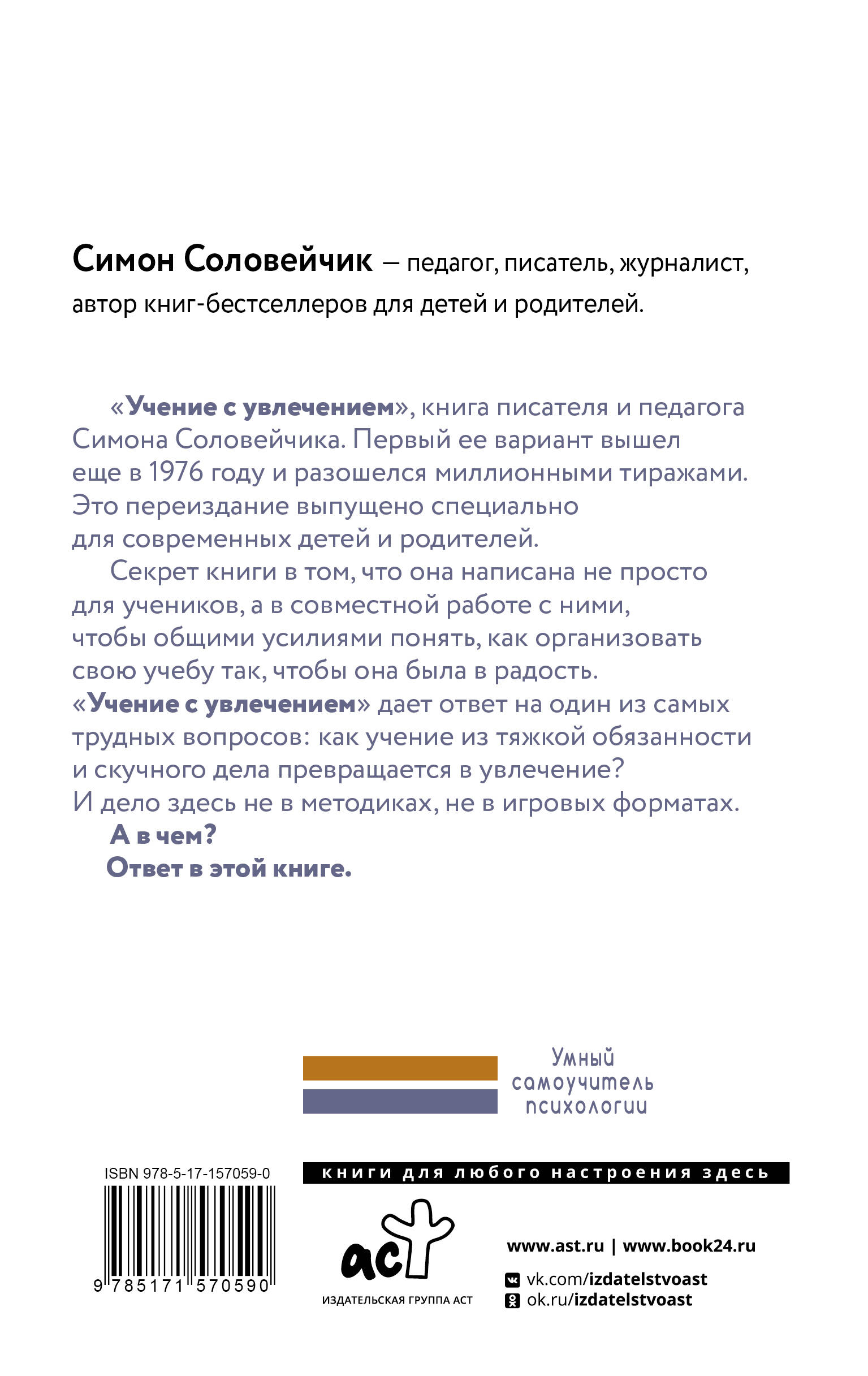 "Учение с увлечением", книга писателя и педагога Симона Соловейчика. Первый ее вариант вышел еще в 1976 году и разошелся миллионными тиражами. Это переиздание выпущено специально для современных детей и родителей. Секрет книги в том, что она написана не просто для учеников, а в совместной работе с ними, чтобы общими усилиями понять, как организовать свою учебу так, чтобы она была в радость. "Учение с увлечением" дает ответ на один из самых трудных вопросов: как учение из тяжкой обязанности и скучного дела превращается в увлечение? И дело здесь не в методиках, не в игровых форматах. А в чем? Ответ в этой книге.| Издательство | ИЗДАТЕЛЬСТВО "АСТ" |