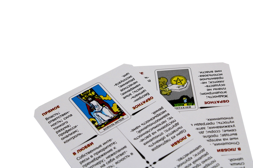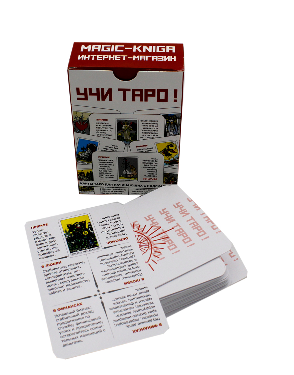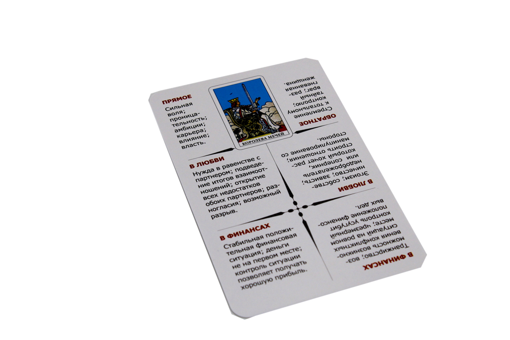 Если вы хотите быстро выучить значения карт и получить ответы, сделать расклад конкретно на отношения или финансовое благополучие, тогда эта колода для вас. На каждой карте есть не только основное значение - прямое и перевернутое, но и отдельные значения карт на любовь и финансы. 78 карт с пояснением значений прямых и перевернутых положений. Отдельные значения карт в раскладах на любовь и финансы. Пояснения даны прямо на картах. НЕ ЛЕНИСЬ-УЧИ ТАРО!| Издательство | Издатель А.Г.Москвичев |