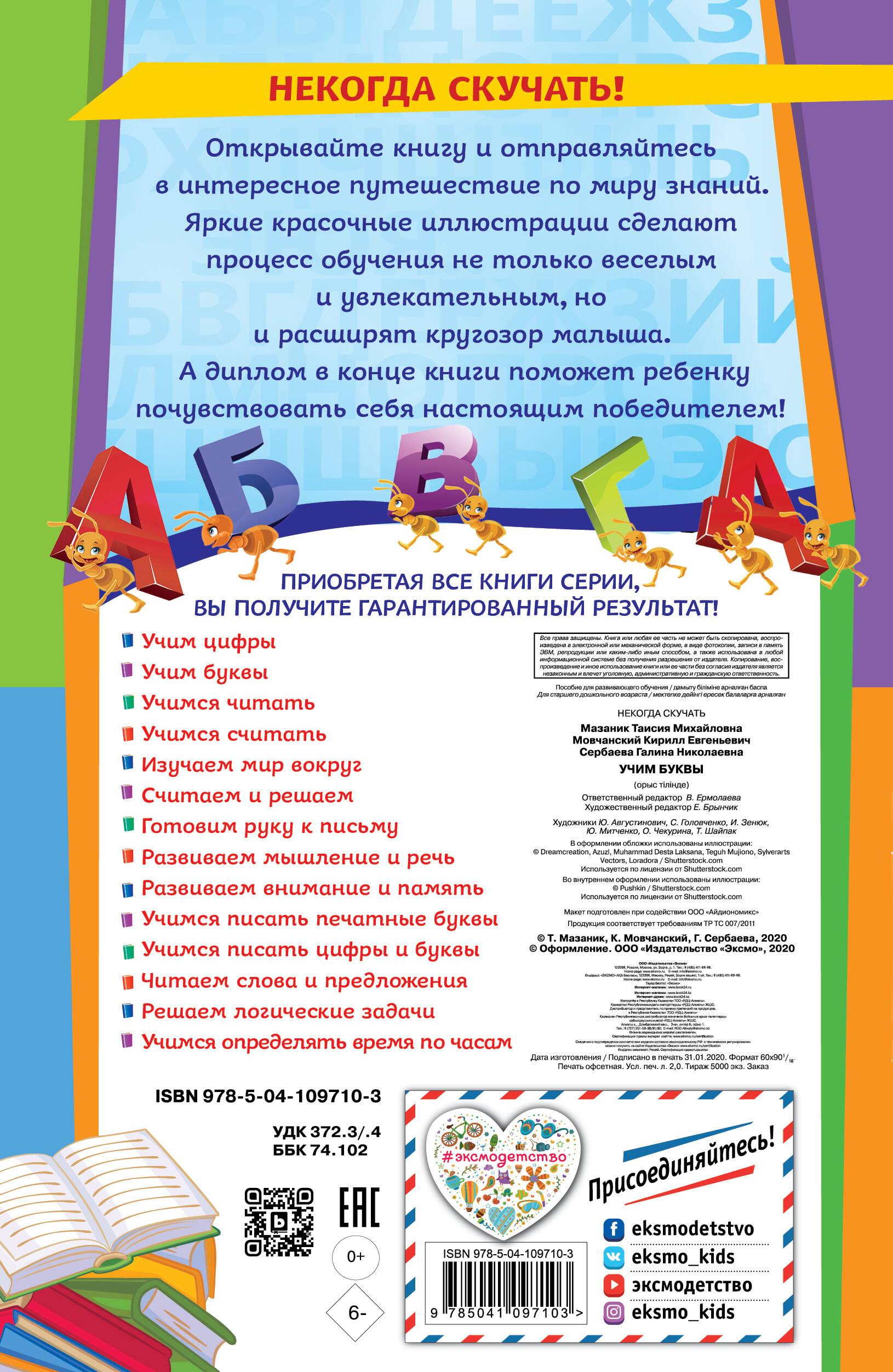 Серия экономичных книг, направленных на обучение и развитие детей! Задача этой серии - обучение через игру. Формат небольшой - они легко поместятся в детский рюкзачок или мамину сумочку, их удобно брать с собой в транспорт, поликлинику, на дачу и другие места вне дома. Приобретая серию книг для своего ребёнка, вы поможете ему: • выучить цифры и буквы и научиться их писать, • развить мелкую моторику, • научиться читать слова и предложения, • закрепить навык счёта, • потренироваться в решении несложных примеров и задач, • углубить свои знания об окружающем мире, • развить внимание, память, мышление, речь, • научиться определять время по часам, • стать более усидчивым и внимательным.