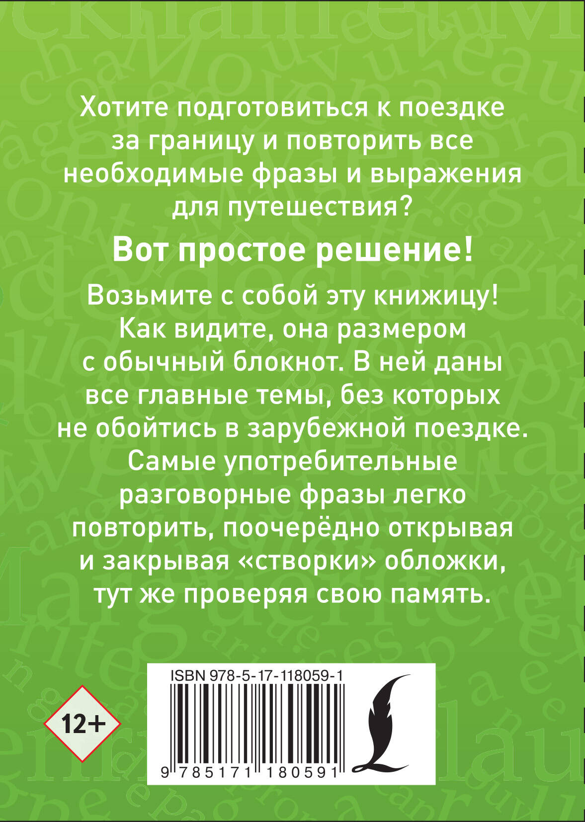 Хотите подготовиться к поездке за границу и повторить все необходимые фразы и выражения для путешествия? Вот простое решение! Возьмите с собой эту книжицу! Как видите, она размером с обычный блокнот. В ней даны все главные темы, без которых не обойтись в зарубежной поездке. Самые употребительные разговорные фразы легко повторить, поочерёдно открывая и закрывая "створки" обложки, тут же проверяя свою память.| Издательство | ИЗДАТЕЛЬСТВО "АСТ" |