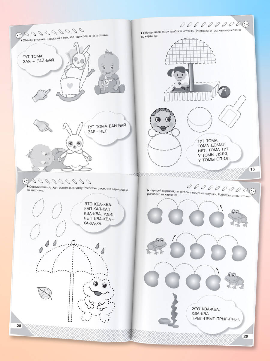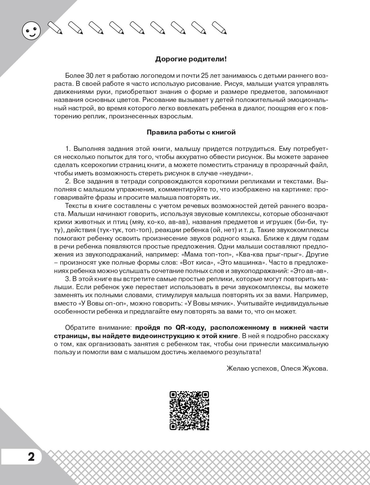 Лучшие логопеды-практики для ваших детей! Чем раньше малыш заговорит, тем быстрее будет развиваться, да и сильно облегчит взрослым общение. Как ни странно, рисование это не только самый эффективный метод развития мелкой моторики, но и отличный способ развития речи. Рисование вызывает у детей положительный эмоциональный настрой, во время которого легко вовлекать ребенка в диалог, поощряя к повторению слов, произнесенных взрослым. Именно этот принцип использован в книге: все задания сопровождаются короткими репликами и текстами, начиная от незатейливых звукокомплексов (би-бы; ту-ту) и заканчивая простым предложениями. Поэтому заниматься по книге можно даже с малышами, которые только начинают говорить. А чтобы правильно организовать занятия, сделать их по-настоящему полезными обязательно посмотрите ВИДЕО-РУКОВОДСТВО, записанное автором Олесей Жуковой. Для этого надо всего лишь отсканировать QR-код, расположенный в книге| Издательство | АСТ |