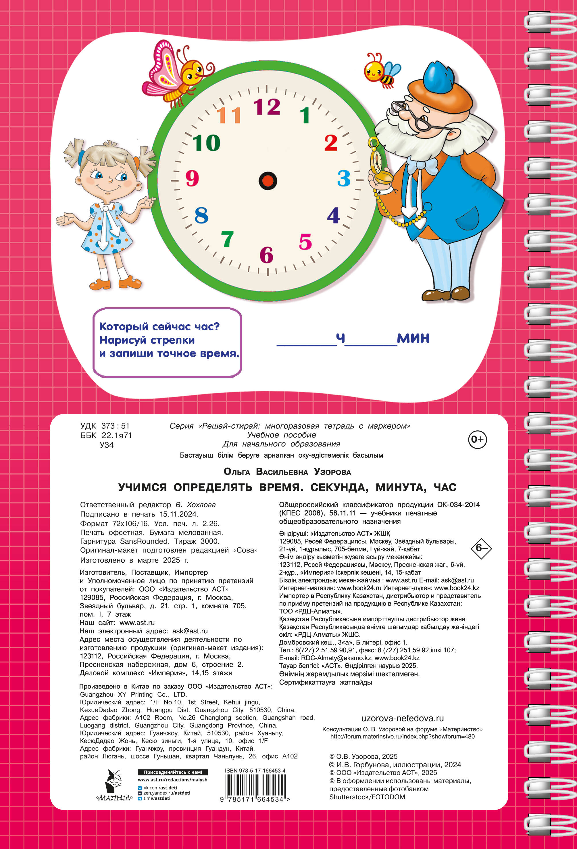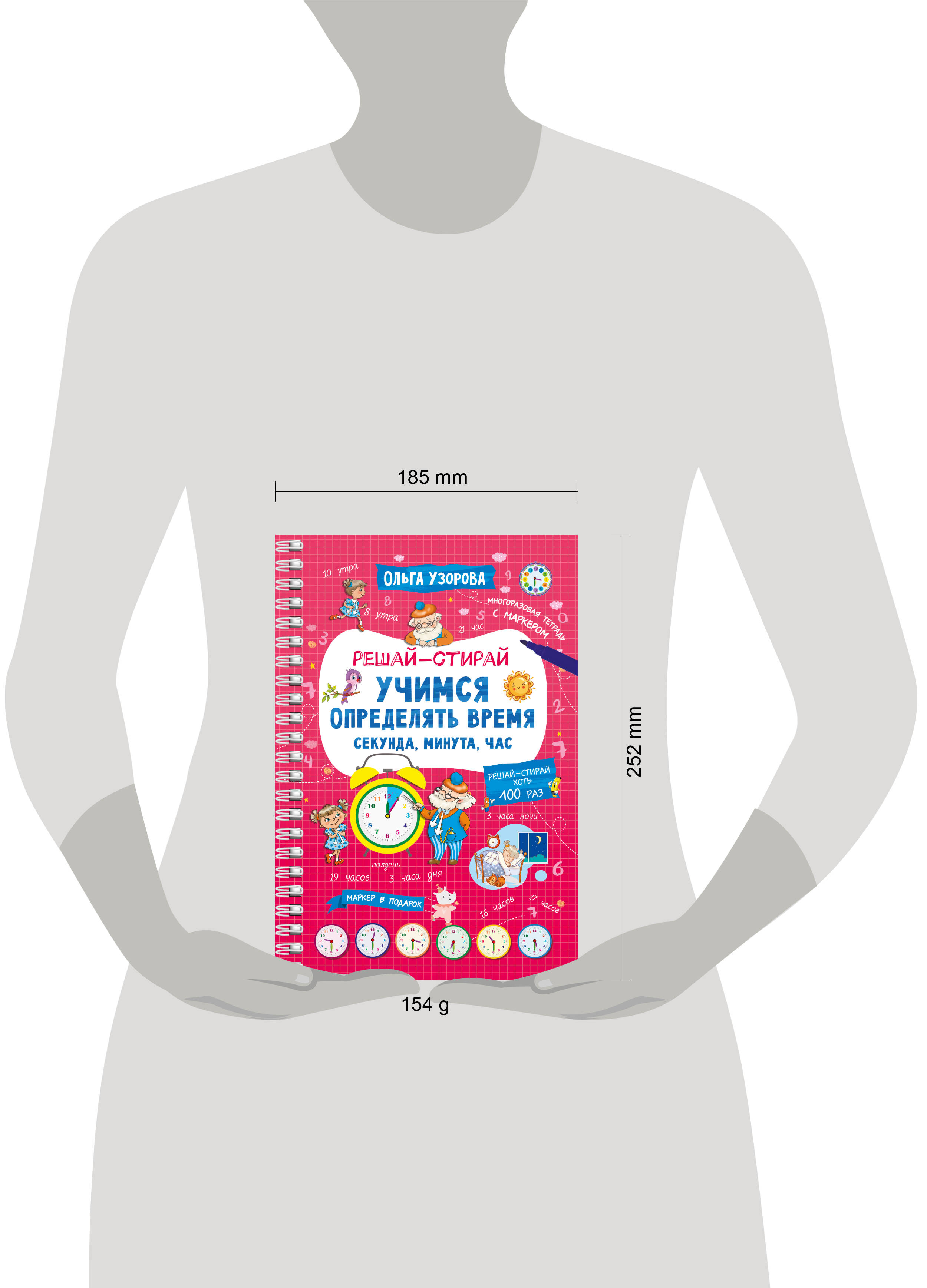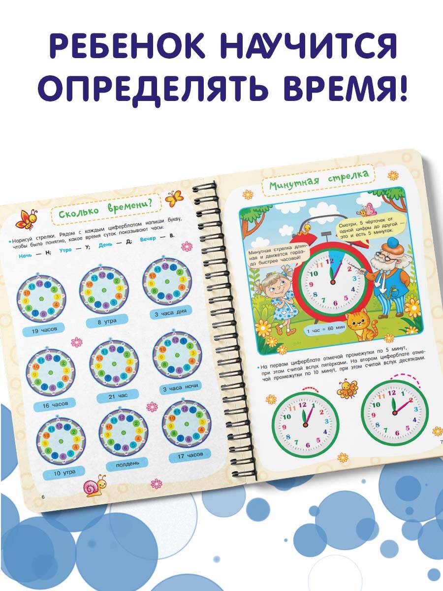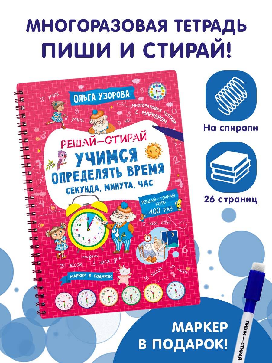 Представляем вашему вниманию удобный многоразовый тренажёр на спирали «Учимся определять время. Секунда, минута, час». Теперь ребёнок может писать, рисовать и стирать, исправлять ошибки и снова начинать с чистого листа благодаря специальному маркеру, который идеально подходит для письма на глянцевых страницах. Маркер на водной основе входит в комплект. Плотная мелованная бумага и ламинированные страницы делают книгу не только привлекательной, но и долговечной. Книгу можно использовать дома, на уроках в детском саду, во время логопедических занятий и даже в дороге. Ваш ребёнок в весёлой компании мудрого Хранителя времени и его внучки Секундочки в игровой форме быстро и максимально эффективно научится определять время по часам. Автор методики - педагог-практик с 30-летним стажем О. В. Узорова. Суммарный тираж книг автора к 2024 году составил более 60 миллионов экземпляров. Иллюстрации выполнены замечательной детской художницей Ириной Горбуновой. Подарите вашему ребёнку возможность с лёгкостью и радостью получать необходимые знания и полезные навыки!| Издательство | Издательство "АСТ" |