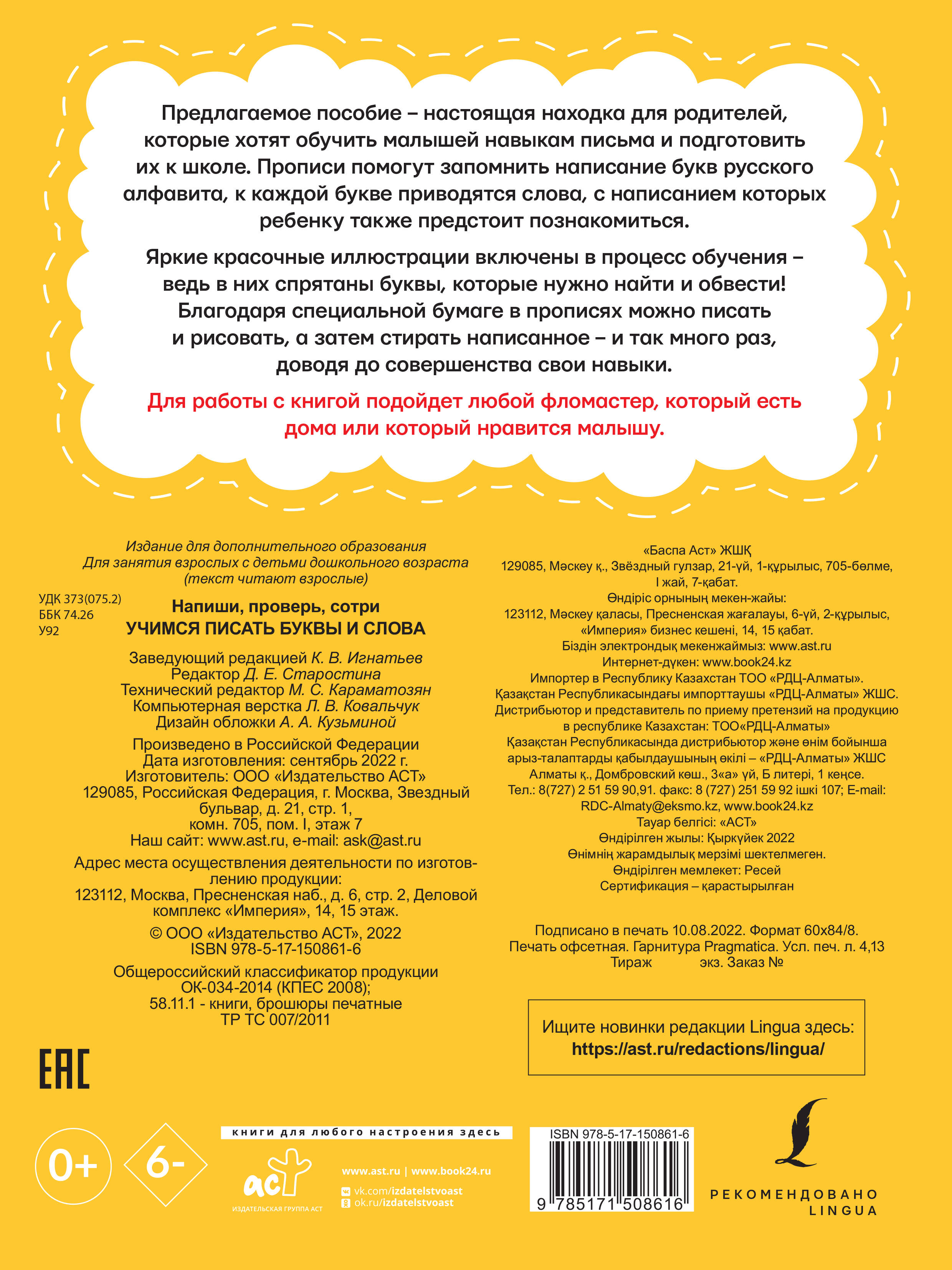 Предлагаемая книга - настоящая находка для родителей, которые хотят обучить малышей навыкам письма и подготовить их к школе. Прописи помогут запомнить написание букв русского алфавита, к каждой букве приводятся слова, с написанием которых ребенку также предстоит познакомиться. Яркие и красочные иллюстрации включены в процесс обучения - ведь в них спрятаны буквы, которые нужно найти и обвести! Благодаря специальной бумаге в прописях можно писать и рисовать, а затем стирать написанное - и так много раз, доводя до совершенства свои навыки. Для работы с книгой подойдет любой фломастер, который есть дома или который нравится малышу.| Издательство | ИЗДАТЕЛЬСТВО "АСТ" |