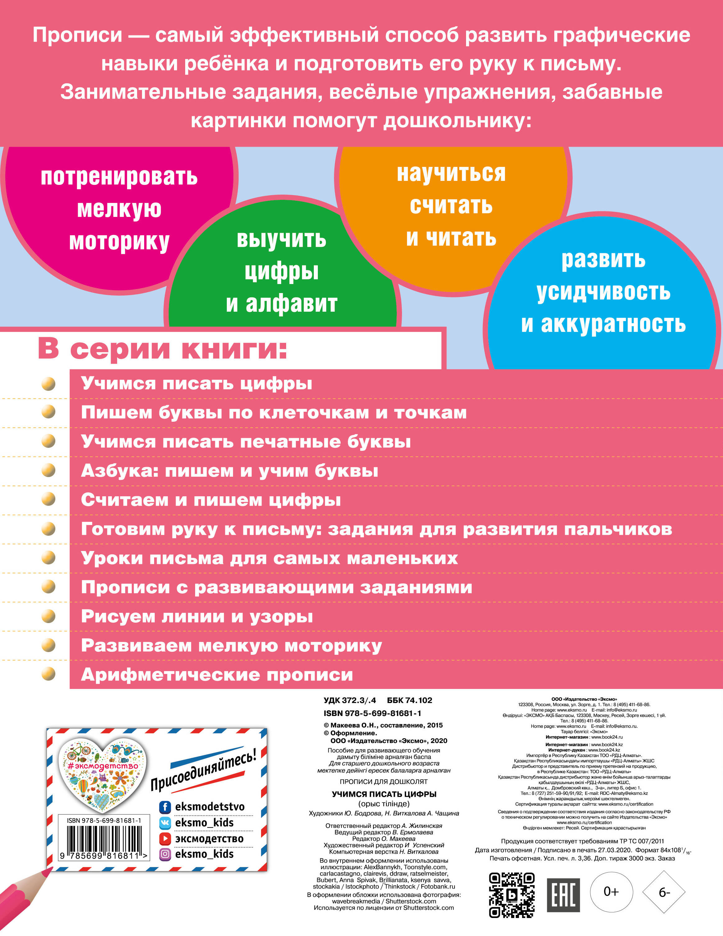 Основная цель этой книги - сформировать у ребенка навык написания цифр. Выполняя задания, он закрепит умение обводить по пунктирным линиям, писать по клеточкам, а также будет тренироваться в написании цифр. Большое количество развивающих заданий сделают подготовку руки к письму увлекательной игрой. Адресовано старшим дошкольникам, их родителям и воспитателям и может использоваться как для домашних занятий, так и в детском саду. Книга поможет ребенку: - укрепить мышцы руки, - подготовить руку к письму, - сформировать наглядно-образное мышление, - развить произвольное внимание, зрительное восприятие, графические навыки, - расширить словарный запас, - эффективно подготовиться к школе.| Издательство | ООО "Издательство "Эксмо" |