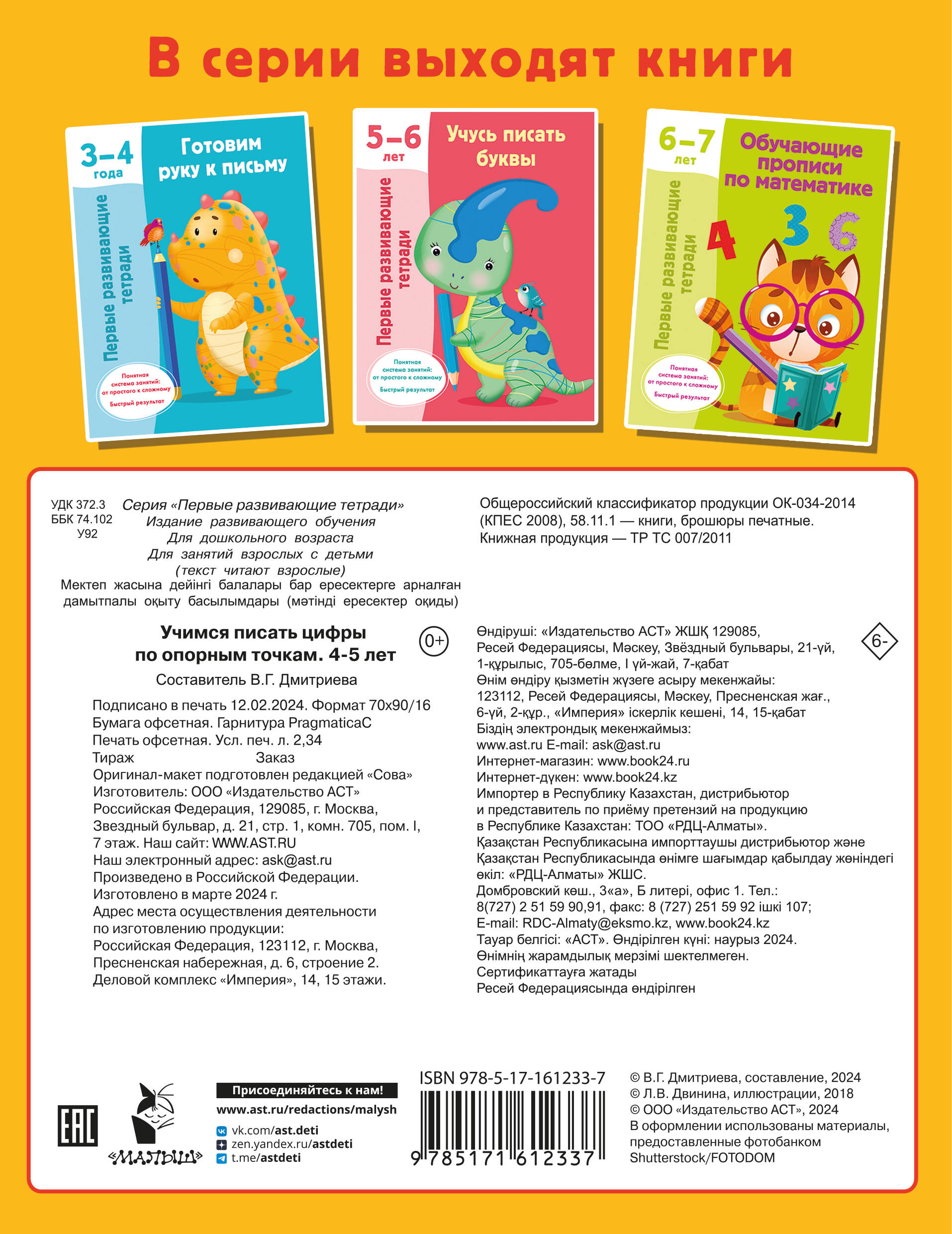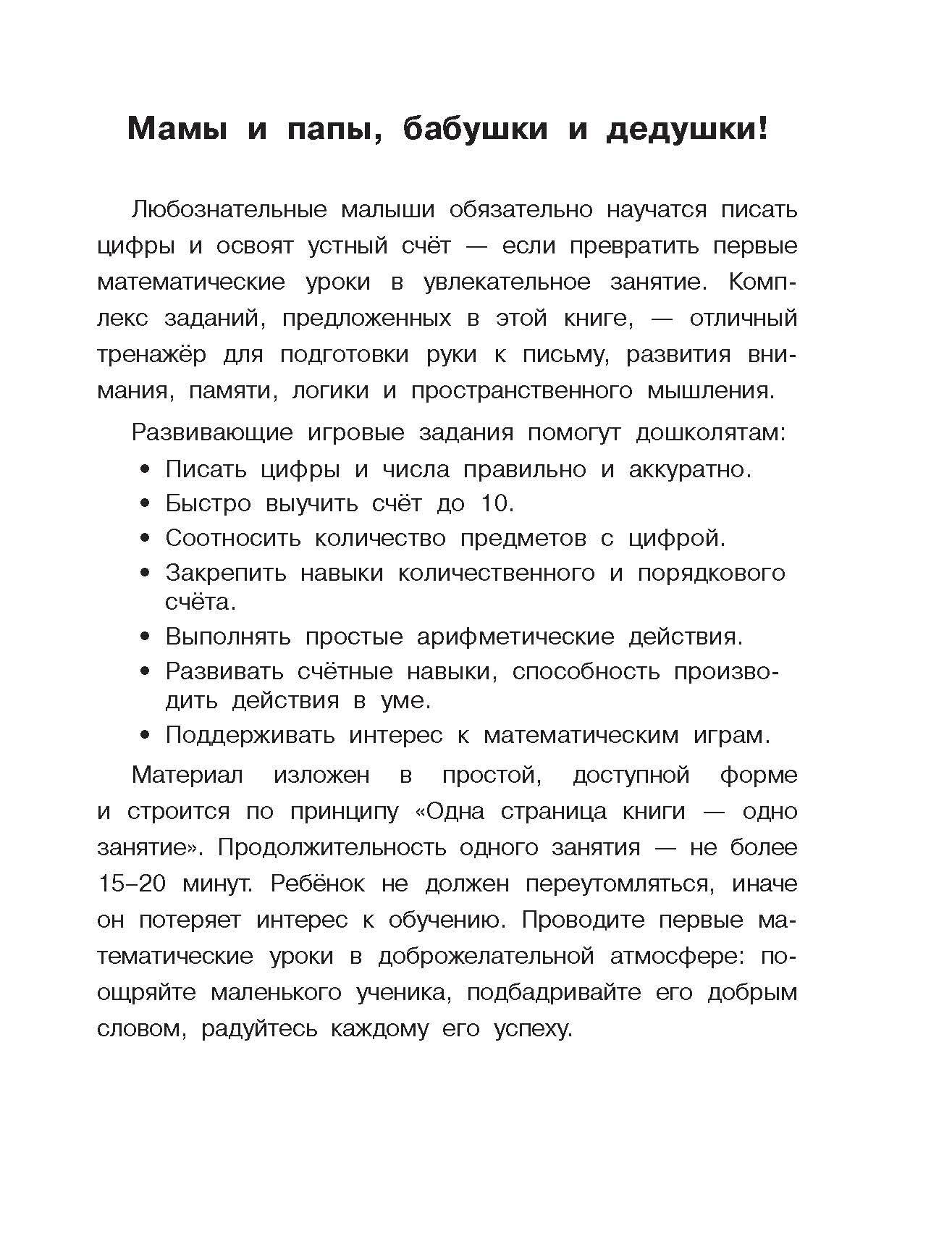 В серии «Первые развивающие тетради» - книги для любознательных малышей и заботливых родителей. Рабочая тетрадь «Учимся писать цифры по опорным точкам. 4-5 лет» представляет интерес для дошкольников, а также их родителей, - игровые задания позволяют ребёнку запомнить правильное начертание цифр, развивают интеллект, формируют математические представления и ориентацию в пространстве, закрепляют правила выполнения простых арифметических действий. Приобретая это пособие для своего ребёнка, вы поможете ему: • подготовить руку к письму, научиться держать ручку и карандаш; • запомнить правильное начертание цифр; • выучить порядковый и количественный счёт в пределах 10; • потренироваться в сложении и вычитании; • развить мышление, логику, внимание, память; • стать более усидчивым и аккуратным.| Издательство | Издательство "АСТ" |