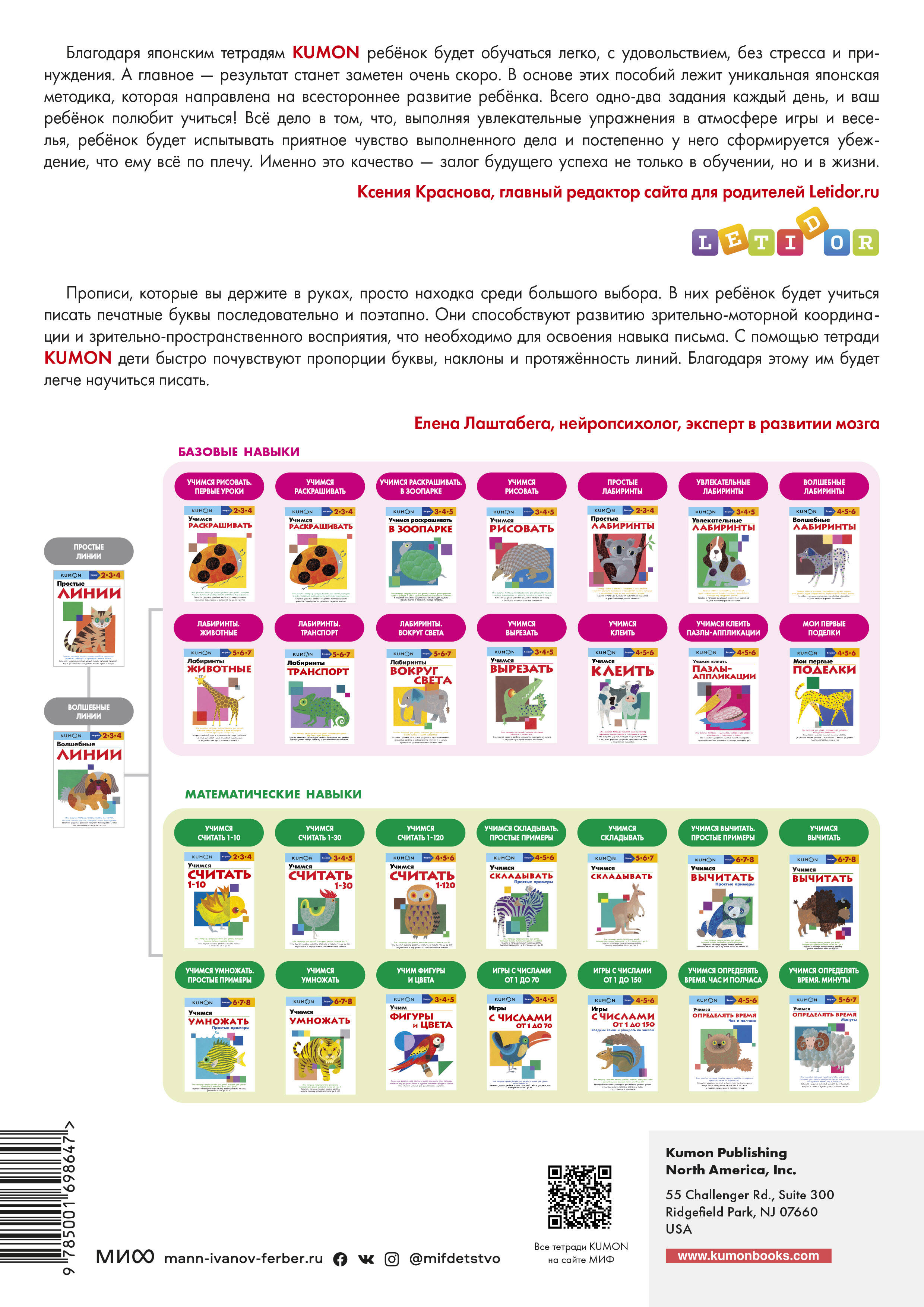 С помощью этой тетради ребёнок научится уверенно писать печатные буквы русского алфавита. Как и во всех остальных пособиях Kumon, в ней заложен принцип от простого к сложному. Именно поэтому буквы в тетради даны не по алфавиту, а по сложности написания. Сначала ребёнок будет писать буквы, состоящие из прямых линий, затем из наклонных, далее последуют буквы с дугами и наконец с окружностями. Перед тем как приступить к написанию букв, ребёнок потренируется проводить линии различной сложности. Тетрадь разработана центром Kumon специально для российских детей и проверена и одобрена педагогом, автором многих пособий для дошкольников Светланой Воскресенской, которая выступила научным консультантом тетради. Для кого эта тетрадь^ Для детей от 3 лет.| Издательство | МАНН, ИВАНОВ И ФЕРБЕР ООО |