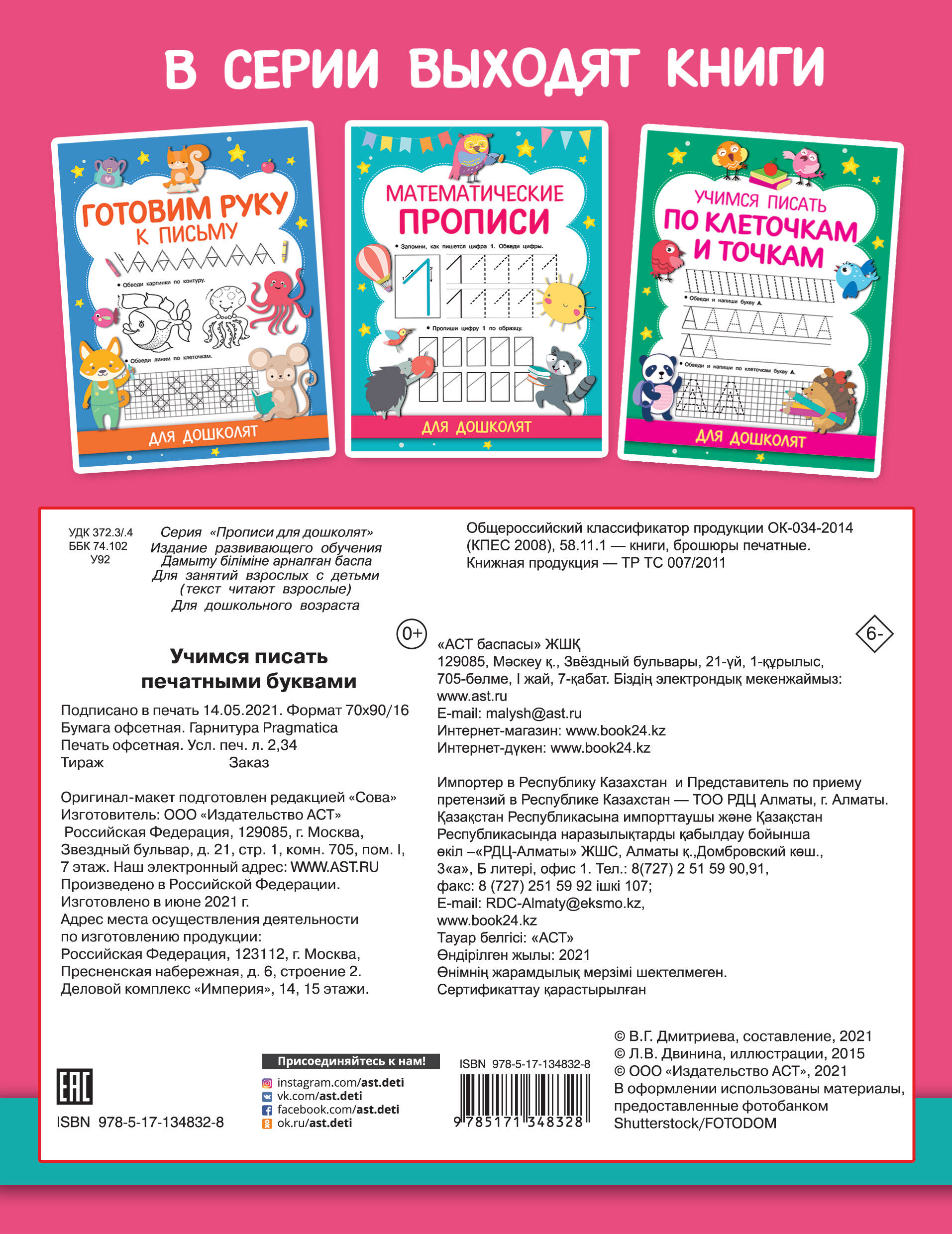О чём эта книга В пособии «Учимся писать печатными буквами» даны задания для развития графических навыков и подготовки к школе будущих первоклассников Кому эта книга будет интересна Пособие для детей дошкольного возраста. Каковы особенности этой книги • Занимаясь по этой книге, будущий первоклассник выучит все буквы алфавита, научится их правильно и красиво писать. • Разнообразные упражнения для развития графических навыков и мелкой моторики. • Регулярные занятия помогут ребёнку приобрести необходимые навыки для успешного обучения в школе.| Издательство | Издательство "АСТ" |