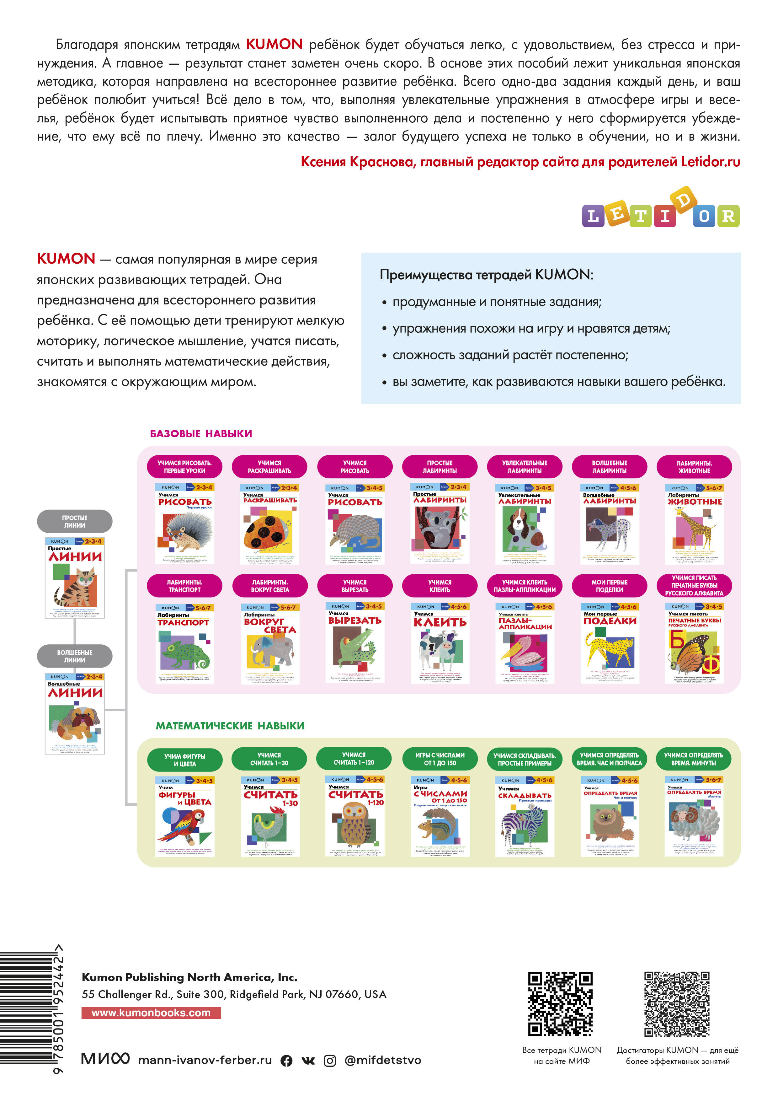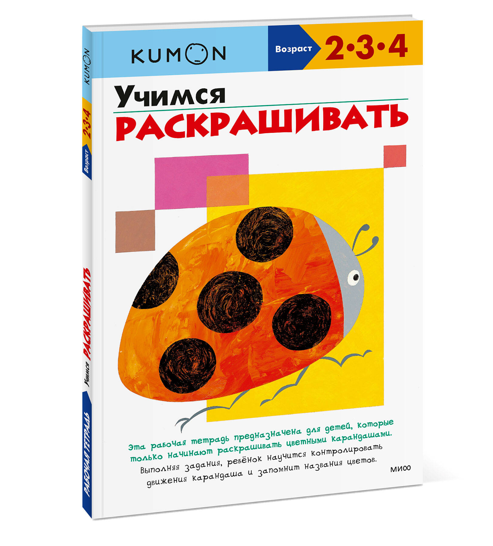 Тетрадь направлена на развитие мелкой моторики. Раскрашивая ограниченные области на картинках, ваш ребенок будет учиться проводить карандашом линии и контролировать движение руки. Кроме того, эта рабочая тетрадь поможет запомнить названия цветов и форм, разовьет творческое мышление и художественные способности ребенка. Все пособия KUMON используют принцип "от простого к сложному". В первых заданиях этой тетради ребёнку нужно будет выбрать восковой карандаш нужного цвета и закрасить им одну белую область простой формы на рисунке. Постепенно количество областей для раскрашивания будет увеличиваться, а их форма усложняться. В последних заданиях ребёнок должен будет сам выбрать карандаши для раскрашивания. На обороте каждого листа ребёнку предстоит проводить карандашом линии, не задевая картинок. Для кого эта тетрадь? Тетрадь предназначена для занятий с детьми 2-4 лет. Её могут использовать как педагоги в детских садах, клубах и центрах развития, так и родители для работы дома.| Издательство | МАНН, ИВАНОВ И ФЕРБЕР ООО |
