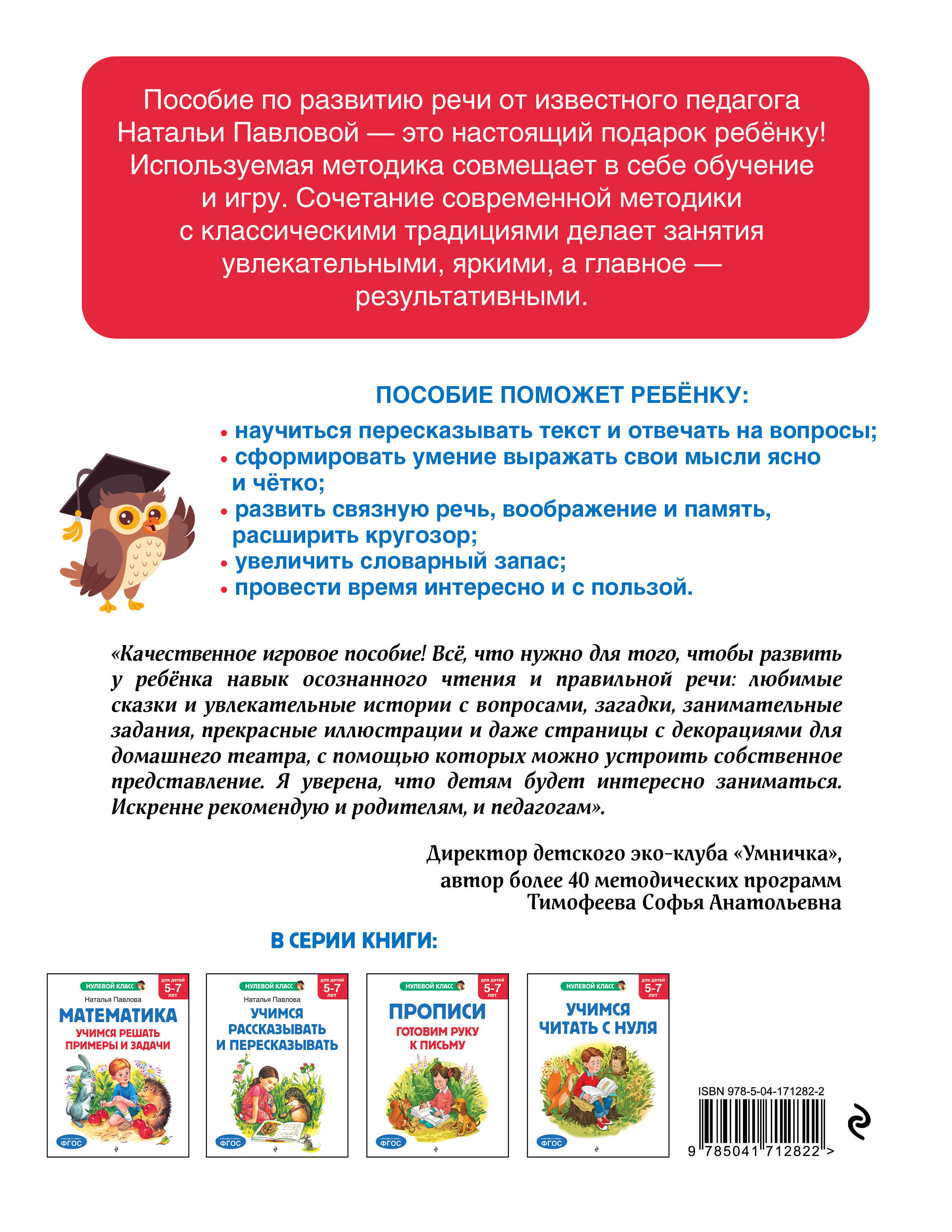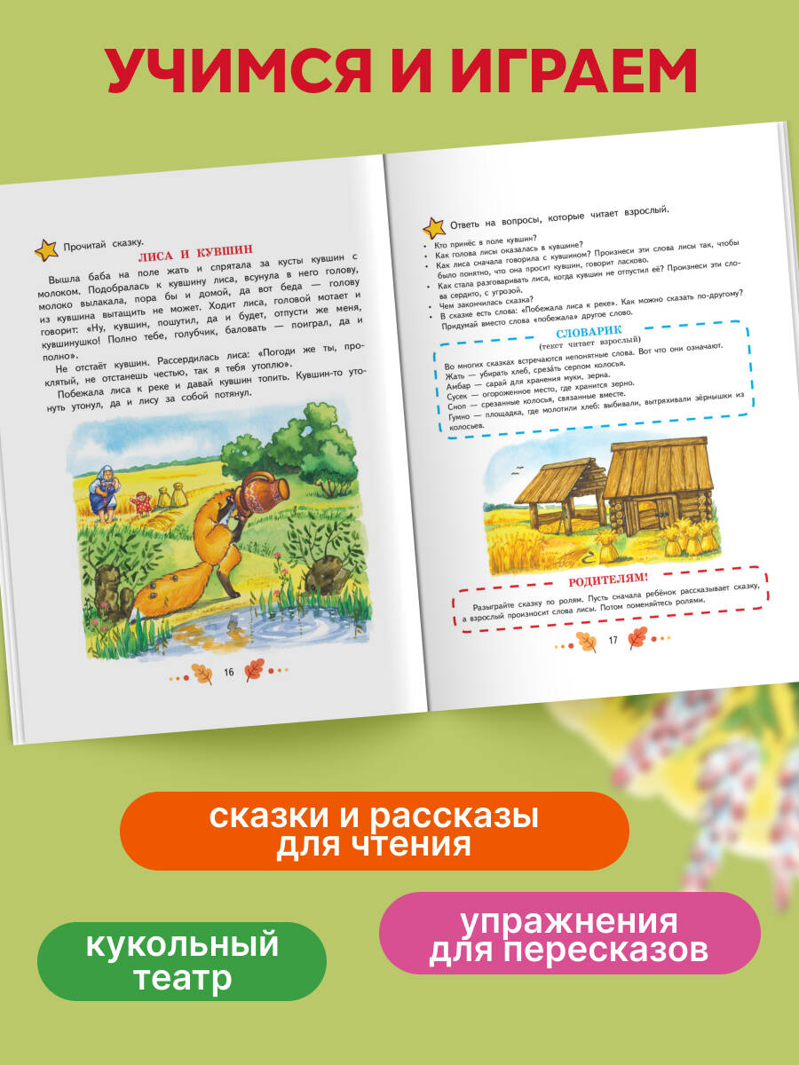 Книга по развитию речи, соответствующая ФГОС, - это не набор текстов, а ключ к миру общения и творчества. Пособие известного педагога Натальи Павловой объединяет сказки и рассказы для чтения, упражнения для обучения пересказу и домашний театр. Занимаясь, дошкольник научится правильно строить предложения, применять в речи сравнения и эпитеты, использовать нужную интонацию, заменять повторяющиеся слова близкими по значению, то есть не только научится правильно говорить, но и обогатит свою речь. Отвечая на вопросы вдумчиво и подробно, ребенок вспомнит последовательность событий, попытается проанализировать поступки героев, выразить свое отношение к прочитанному. Занимательные задания, а также изображения сказочных героев, которые можно вырезать, дадут возможность дошкольнику научиться пересказывать тексты, играя и воображая себя настоящим артистом. Практика пересказа помогает запомнить детали и структурировать информацию, что положительно повлияет на будущее обучение. А красочные иллюстрации способствуют развитию воображения, речевых и коммуникативных навыков. Кроме того, ребенок сможет увеличить словарный запас, расширить кругозор, качественно подготовиться к школе. Книга издательства «Эксмо» - это настоящий подарок для дошкольника. Она станет незаменимым помощником родителям в развитии ребенка и воспитании уверенного в себе творчески мыслящего человека.| Издательство | ООО "Издательство "Эксмо" |