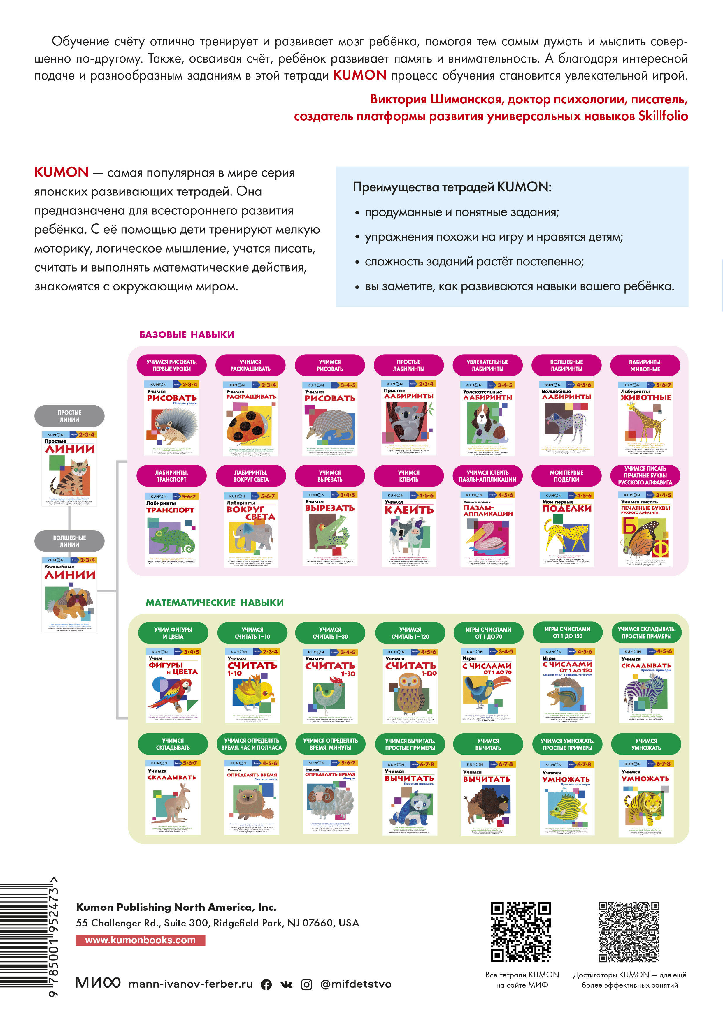 Тетрадь познакомит вашего ребёнка с количественным и порядковым счётом от 1 до 30 и научит писать числа. С помощью тетради "Kumon. Учимся считать от 1 до 30" ребёнок: научится считать до 30; запомнит форму цифр и сможет писать их; поймёт связь между количеством объектов и числом, которое его обозначает; будет развивать мелкую моторику рук. Задания в тетради даны по принципу от простого к сложному. Они разделены на четыре блока: 1. Задания с числами от 1 до 10 (№ 1-20). В них ребёнок повторяет счёт до 10 и учится писать числа. Освоение навыков происходит в три этапа: сначала ребёнок выполняет игровые задания, соединяя линией числа по порядку и называя их вслух; затем пишет числа от 1 до 10; и наконец считает предметы и сопоставляет их с соответствующим числом. 2. Задания с числами от 1 до 20 (№ 21-29). В этих упражнениях ребёнок знакомится с числами до 20 и учится их писать. Навык отрабатывается в два этапа: сначала ребёнок осваивает порядковый счёт от 1 до 20; затем выполняет знакомые по первому разделу упражнения, работая с числами от 11 до 20. 3. Задания с числами от 1 до 30 (№ 30-33). В этом разделе ребёнок осваивает счет до 30. Это также происходит в два этапа: сначала ребёнок обводит объекты по контуру, называя числа по порядку; затем тренируется писать числа. 4. Задания на повторение пройденного материала (№ 34-40) - В этом разделе ребёнок закрепляет знания и повторяет всё, что запомнил.