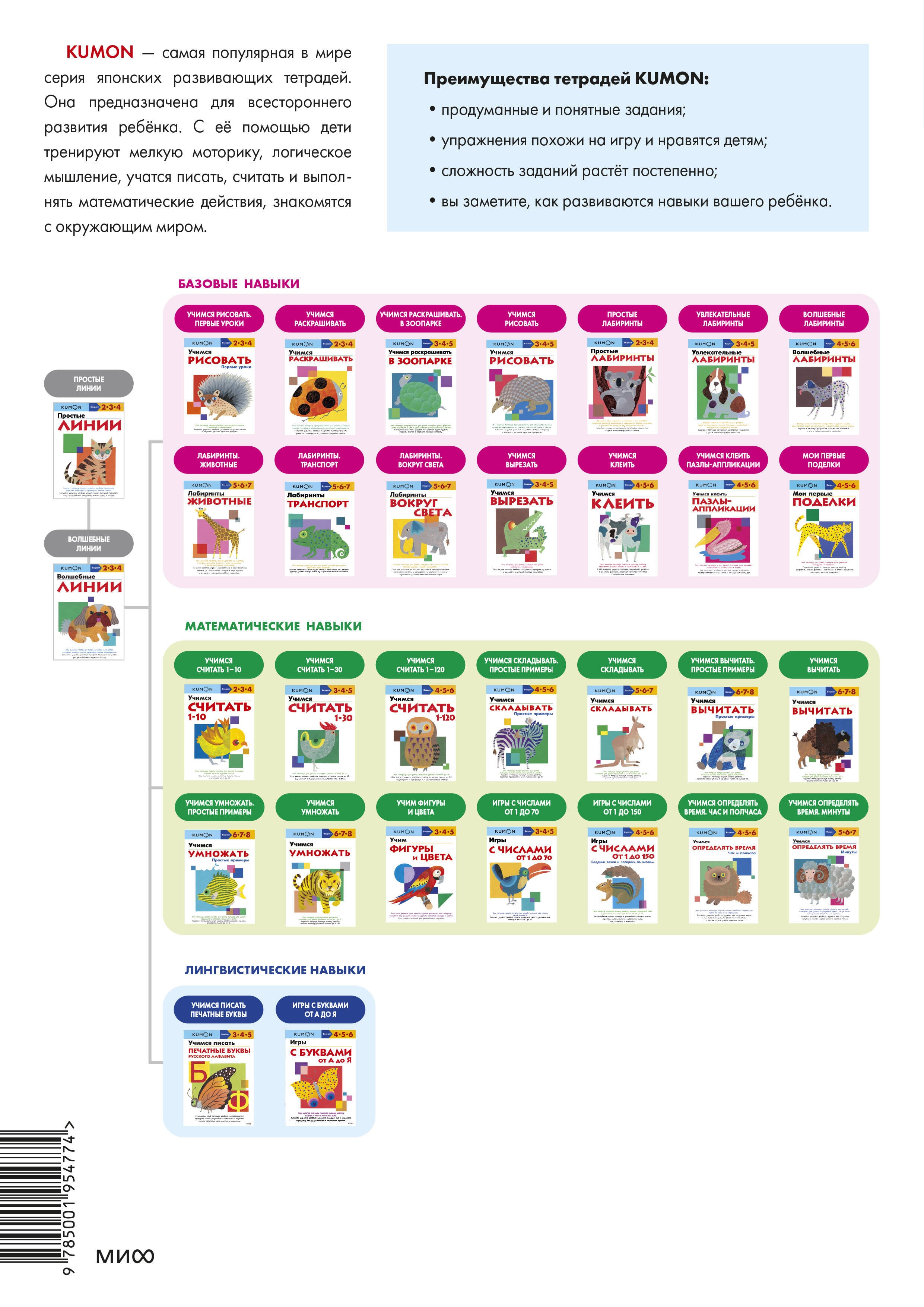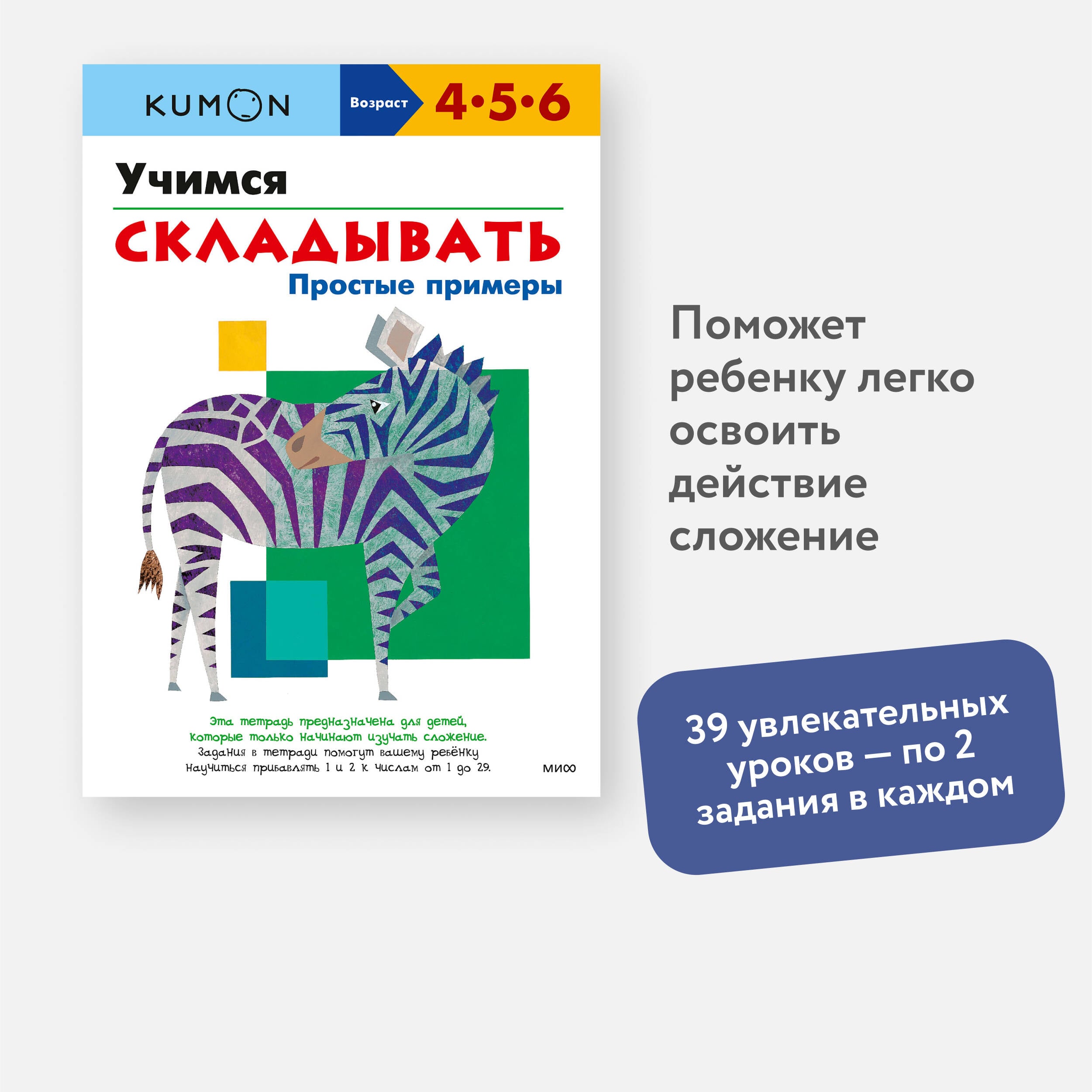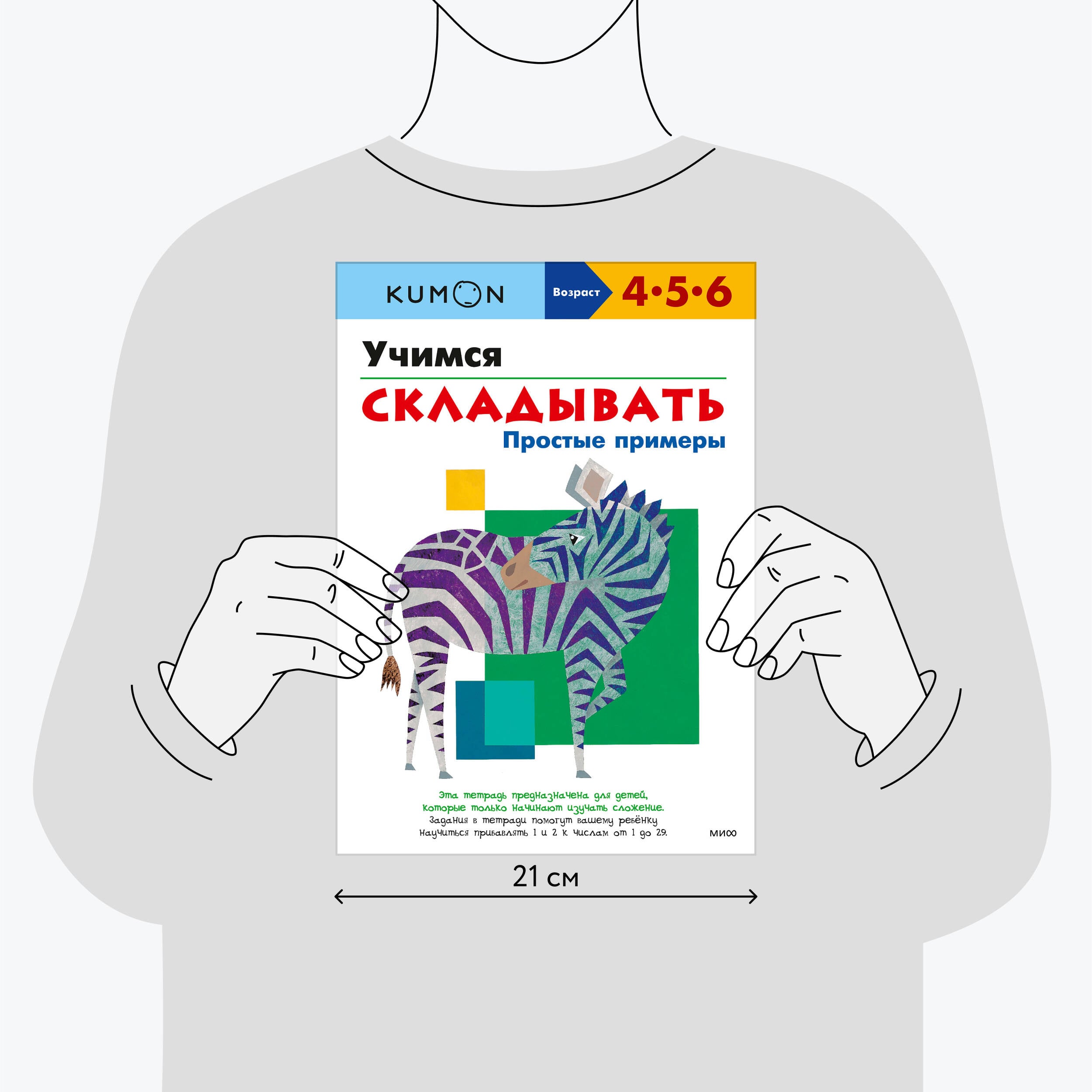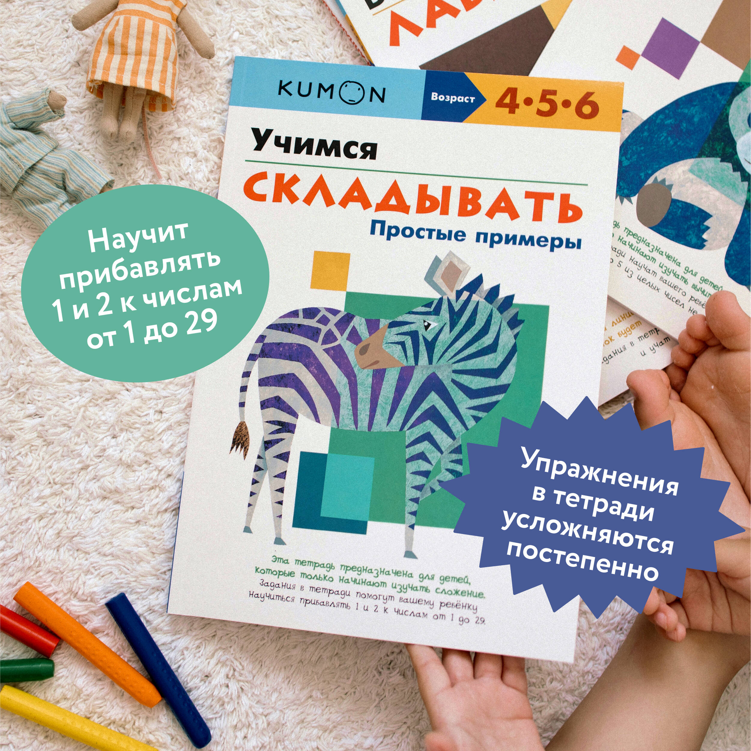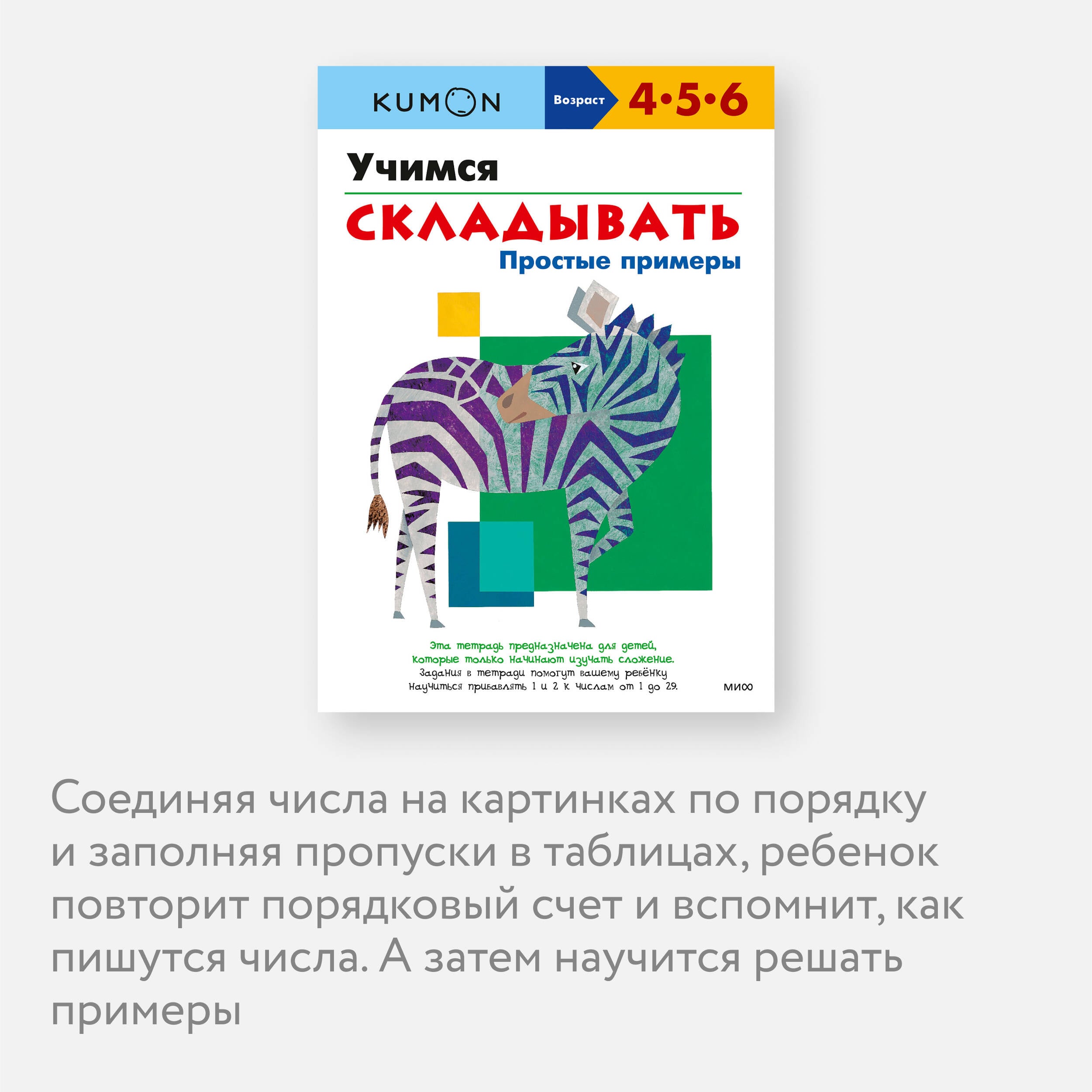 В этой тетради содержатся задания, которые помогут вашему ребенку освоить действие сложение. Соединяя числа на картинках по порядку и заполняя пропуски в таблицах, он повторит порядковый счет и вспомнит, как пишутся числа. Затем ребенок перейдет к изучению новой темы и научится решать примеры. Благодаря тому что упражнения в тетради становятся сложнее постепенно, а новый материал изложен на основе уже знакомых понятий, он легко освоит прибавление 1 и 2 к числам от 1 до 29. Для кого эта тетрадь? Тетрадь предназначена для занятий с детьми от 4 до 6 лет, которые уже умеют считать и знают, как пишутся числа. Ее могут использовать как педагоги в детских клубах и центрах развития, так и родители для работы дома. Что такое KUMON? KUMON - это крупнейший международный центр дополнительного образования. Сегодня по программам KUMON обучаются в 47 странах более 4 млн. детей и подростков в возрасте от 2 до 17 лет. Рабочие тетради KUMON для дошкольников помогут вашему ребенку приобрести навыки письма, счета, а также научат его работать с ножницами и клеем.| Издательство | Манн, Иванов и Фербер |