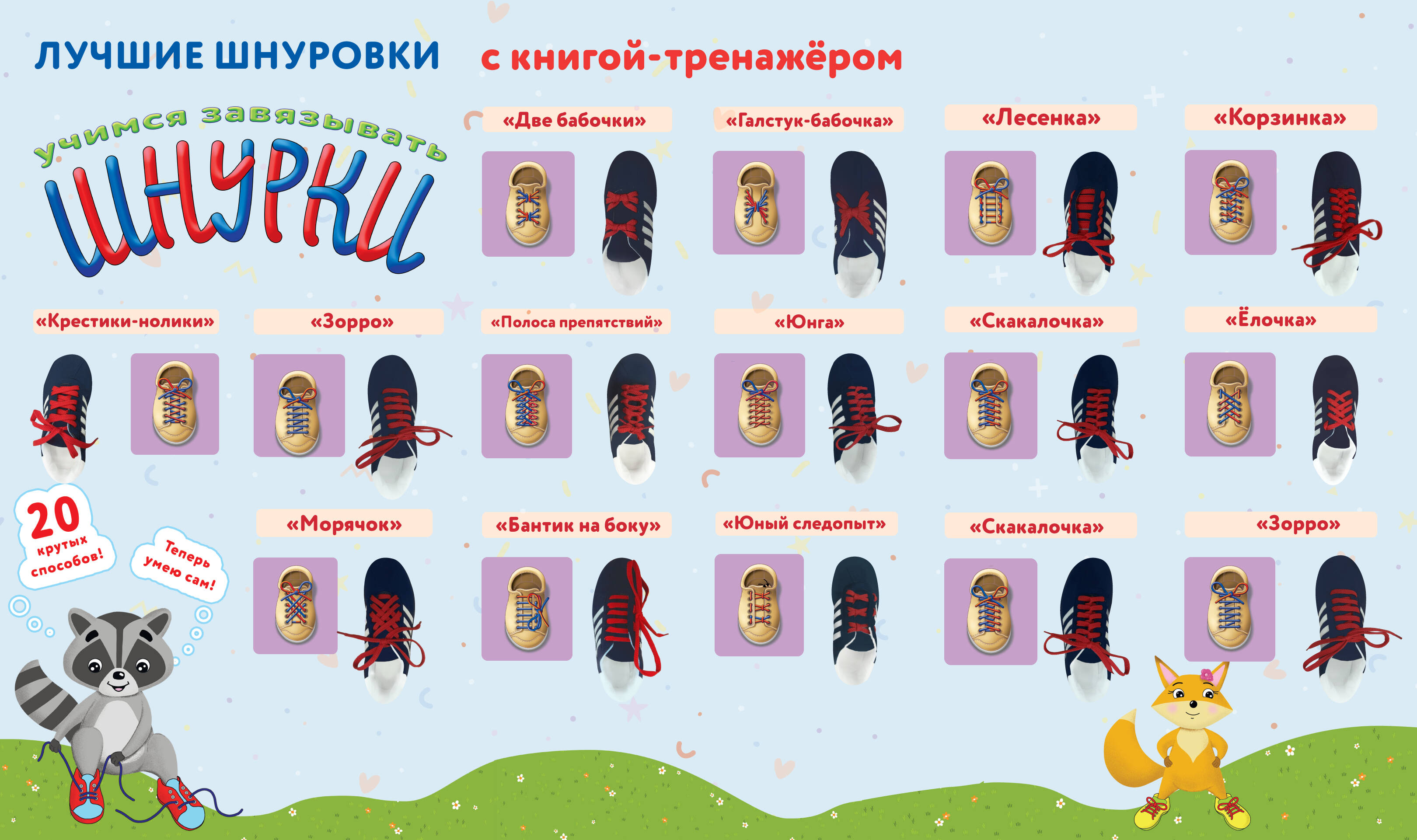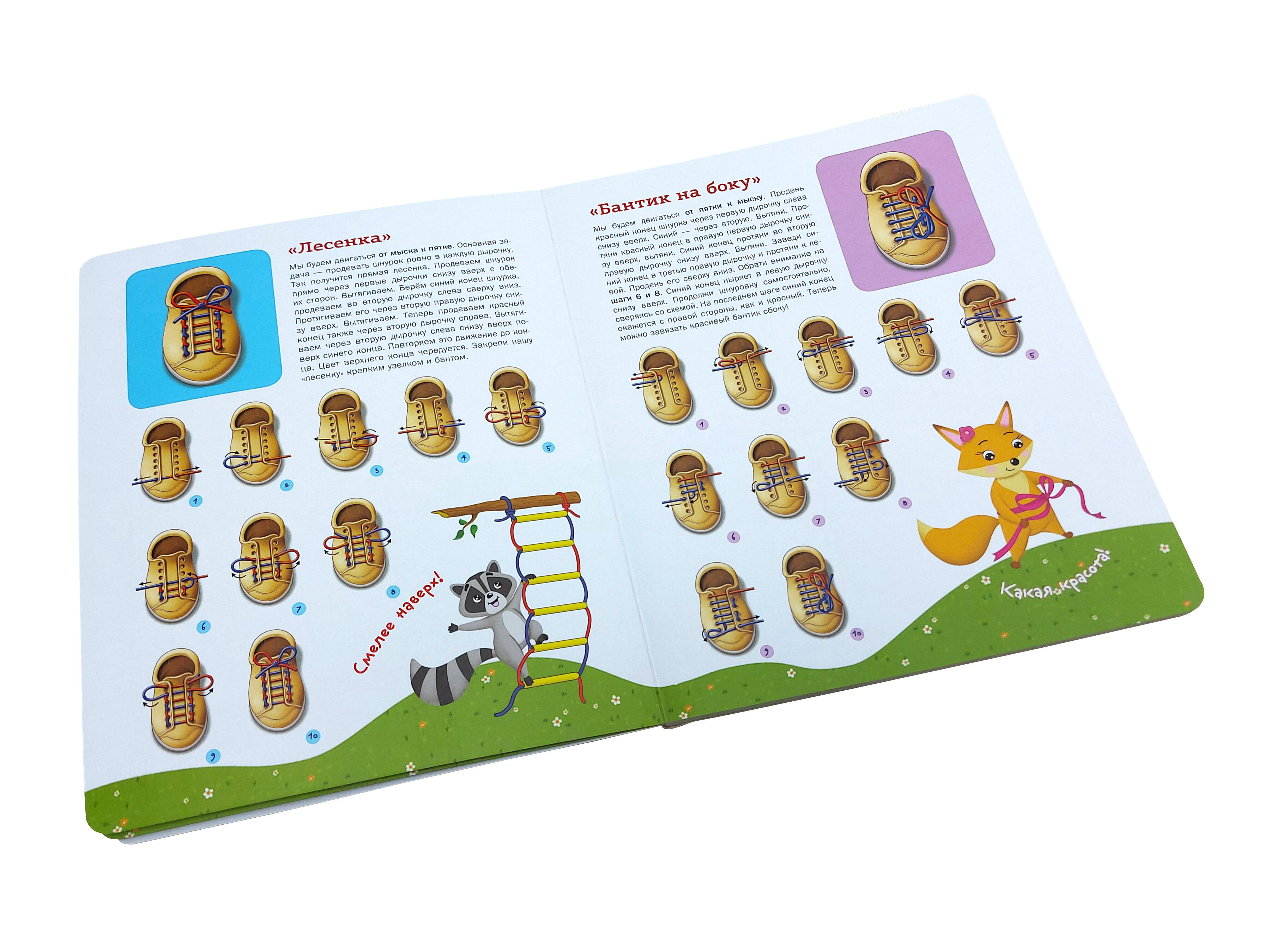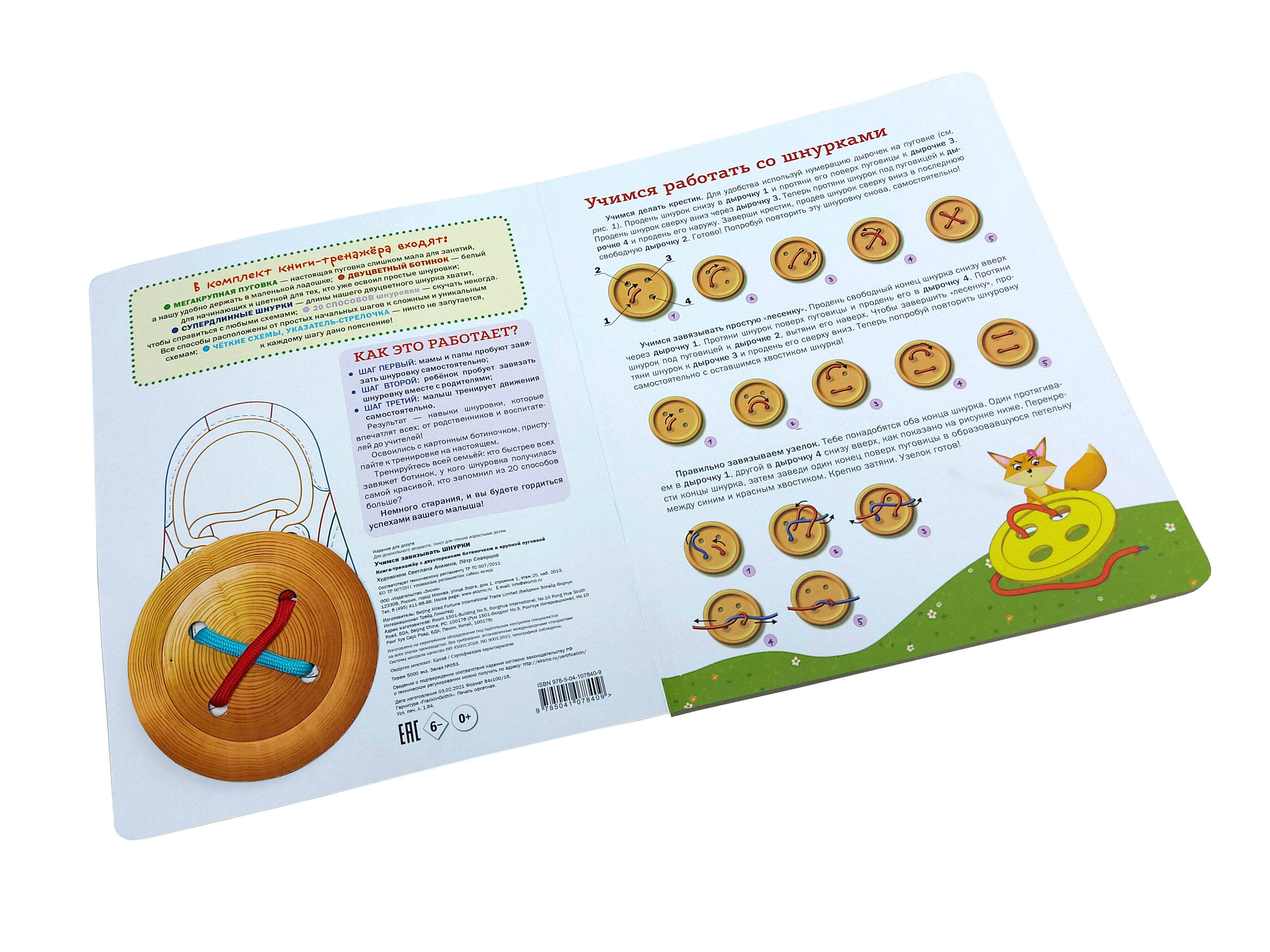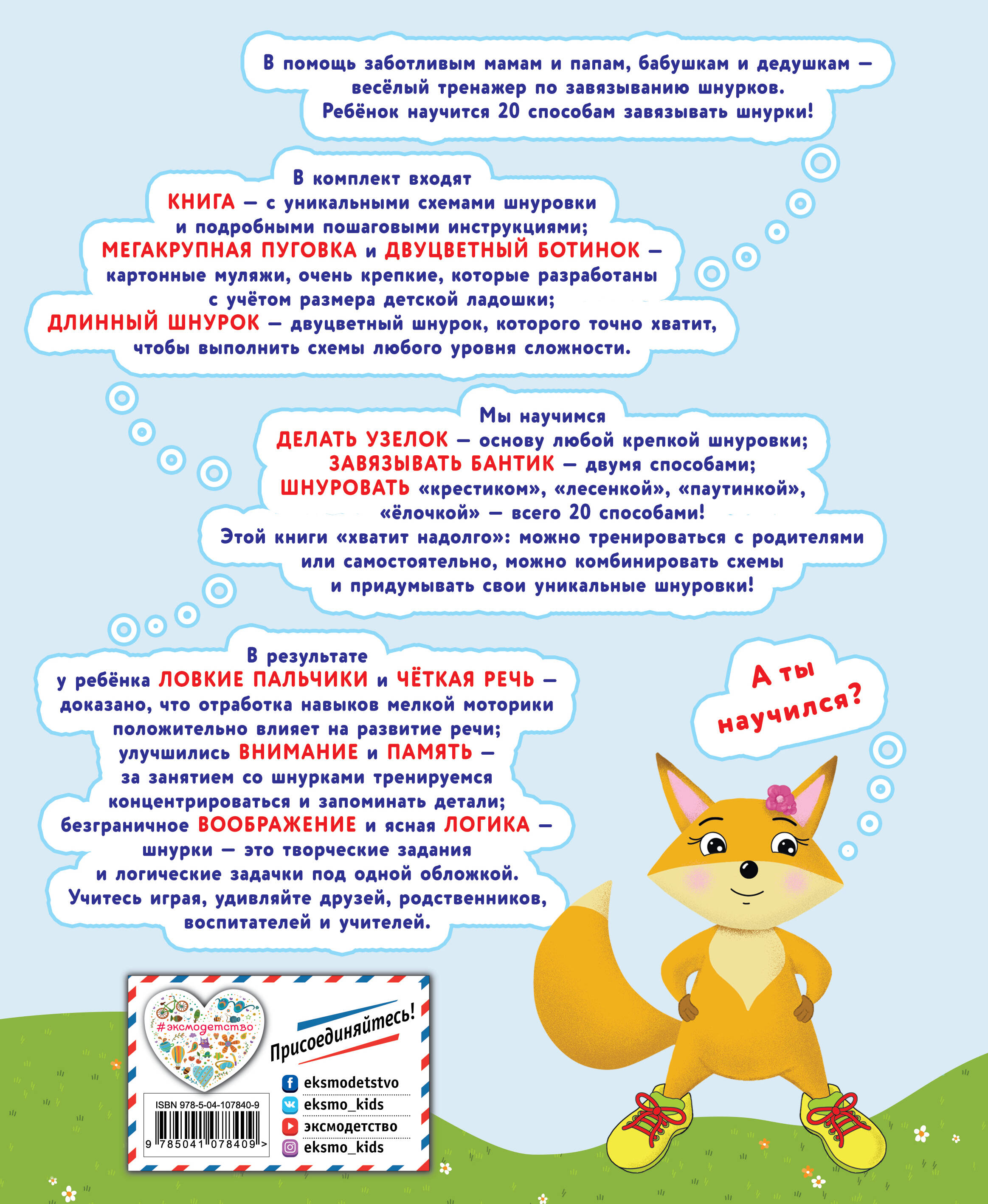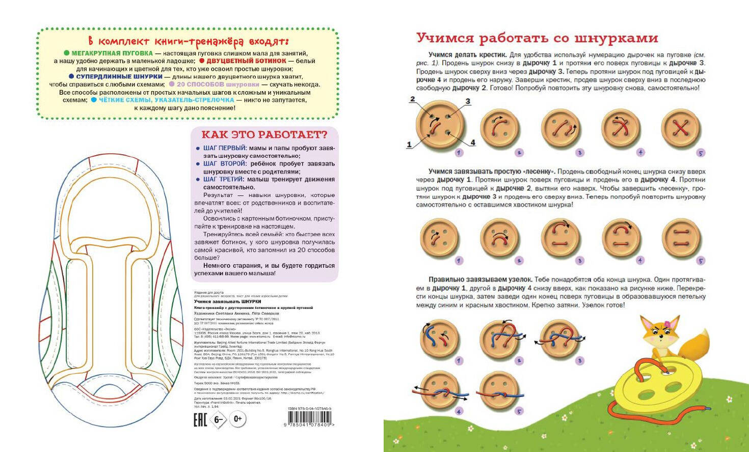 «Учимся завязывать ШНУРКИ» не просто книга, это удобный набор для занятий с детьми. В комплект входят: • ДВУСТОРОННИЙ МУЛЯЖ БОТИНОЧКА (прочный и яркий). • МЕГАКРУПНАЯ КАРТОННАЯ ПУГОВКА (идеального размера для детской ладошки). • УНИКАЛЬНЫЙ КРАСНО-СИНИЙ ШНУРОК без центральной спайки (нигде не застревает и позволяет завязать даже самую хитрую шнуровку). ШНУРОВАТЬ ВЕСЕЛО! 20 подробных четких схем и ясных детальных инструкций научат шнуровать ботинки всем на зависть. БЕЗ СЛЕЗ И КАПРИЗОВ развиваем ловкость пальчиков и мелкую моторику. «Учимся завязывать ШНУРКИ» - это одновременно и творческое задание, и весёлая игра для всей семьи: комбинируйте схемы, придумывайте свои, шнуруйте на скорость, играйте вместе с друзьями и воспитателями - КАЖДЫЙ СМОЖЕТ ГОРДИТЬСЯ СВОИМИ УСПЕХАМИ!| Издательство | ООО "Издательство "Эксмо" |