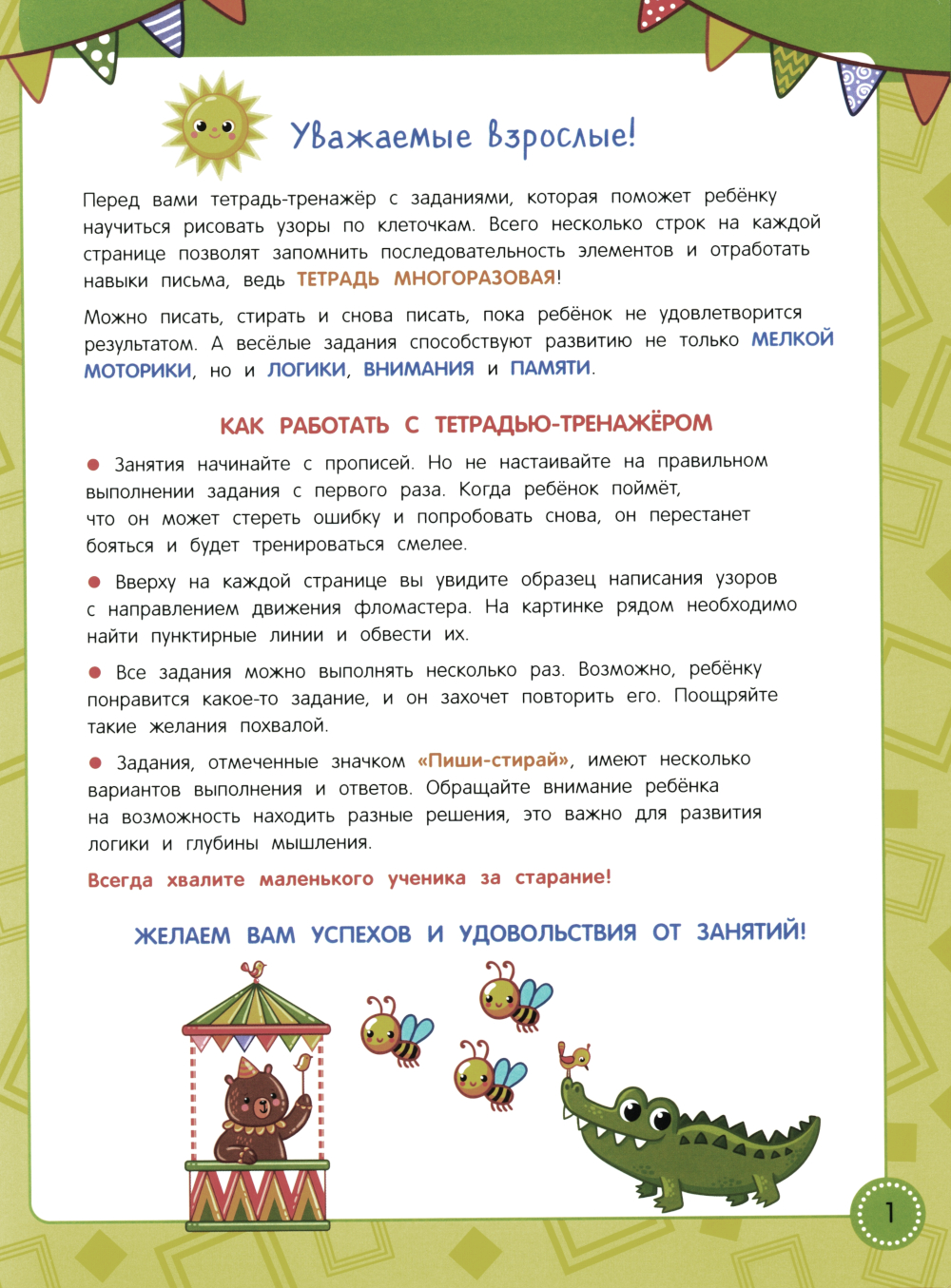 Аннотация: Учись - пиши - стирай. Учимся рисовать узоры по клеточкам: многоразовая тетрадь-тренажер