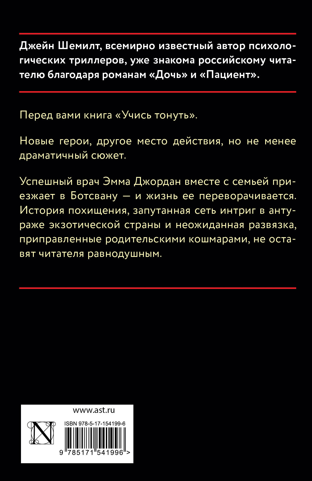 Джейн Шемилт, всемирно известный автор психологических триллеров, уже знакома российскому читателю благодаря романам "Дочь" и "Пациент". Перед вами книга: "Учись тонуть". Новые герои, другое место действия, но не менее драматичный сюжет. Успешный врач Эмма Джордан вместе с семьей приезжает в Ботсвану - и жизнь ее переворачивается. История похищения, запутанная сеть интриг в антураже экзотической страны и неожиданная развязка, приправленные родительскими кошмарами, не оставят читателя равнодушным.| Издательство | ИЗДАТЕЛЬСТВО "АСТ" |