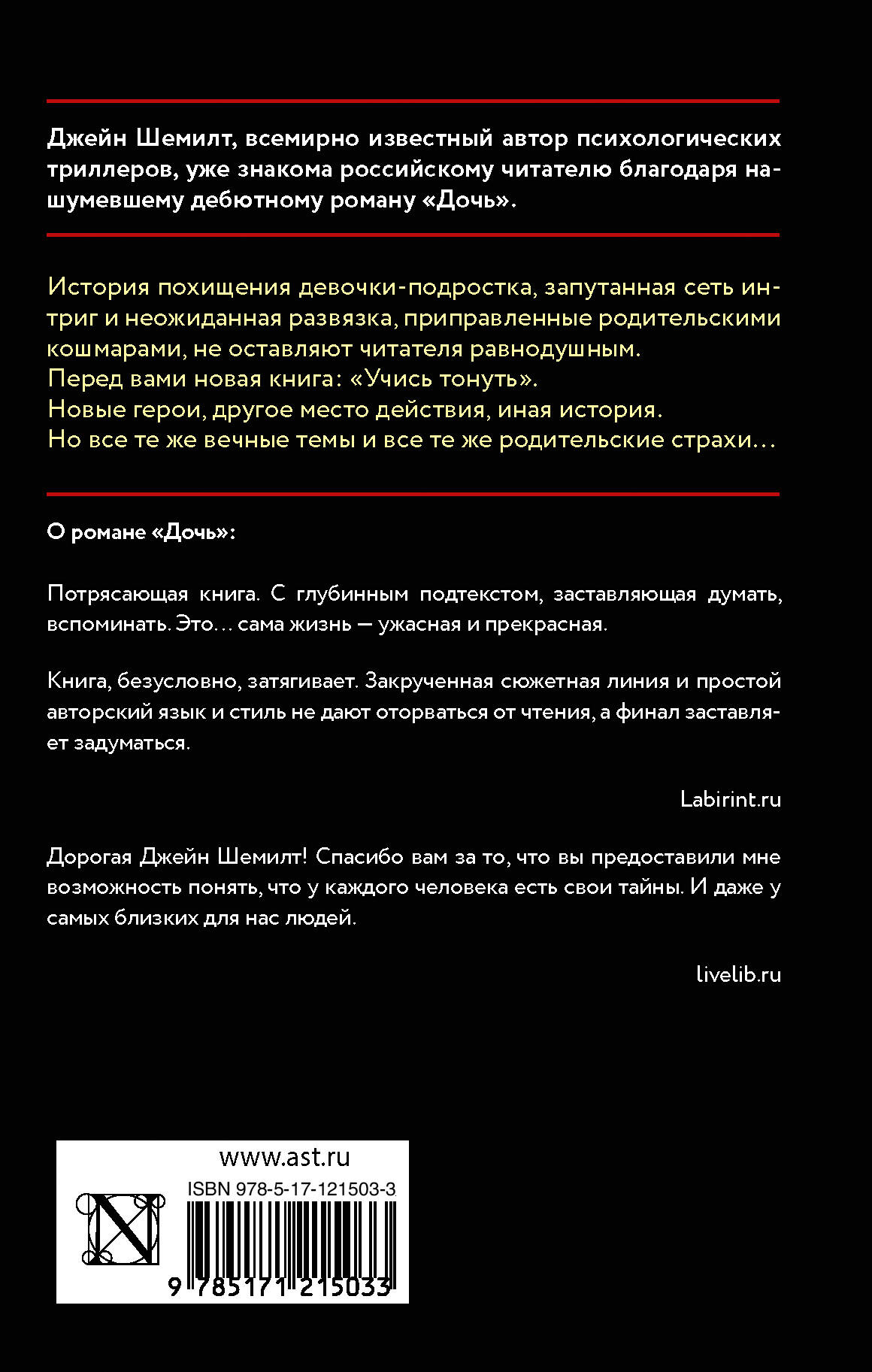 Джейн Шемилт, всемирно известный автор психологических триллеров, уже знакома российскому читателю благодаря нашумевшему дебютному роману "Дочь". История похищения девочки-подростка, запутанная сеть интриг и неожиданная развязка, приправленные родительскими кошмарами, не оставляют читателя равнодушным. Перед вами новая книга: "Учись тонуть". Новые герои, другое место действия, иная история. Но все те же вечные темы и все те же родительские страхи...| Издательство | ИЗДАТЕЛЬСТВО "АСТ" |