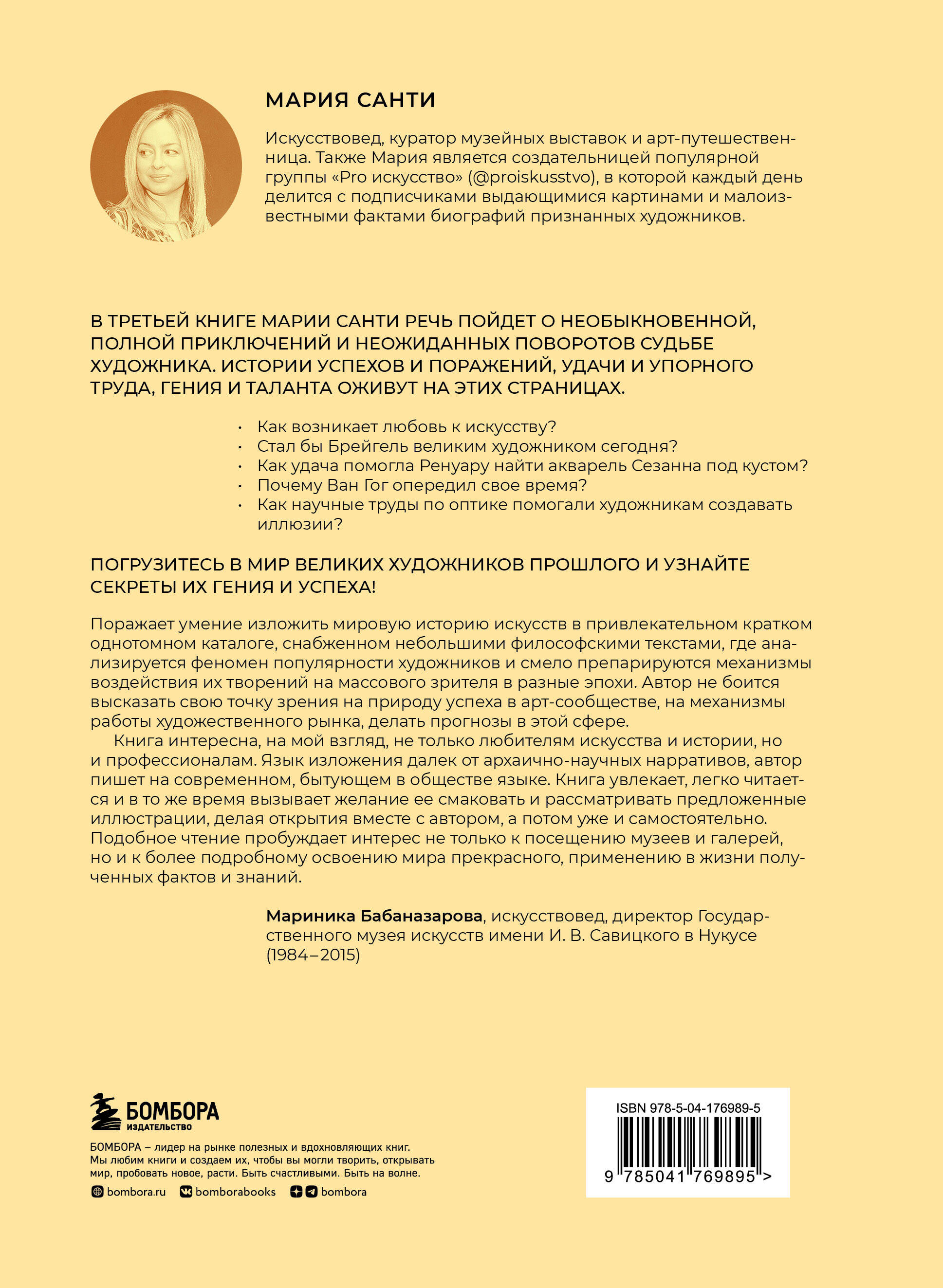 Мария Санти, автор таких бестселлеров, как «Просто об искусстве. О чем молчат в музеях» и «О любви и деньгах. История искусств за чашкой кофе», в своей новой книге приоткроет завесу тайны над судьбами гениальных художников - как они добивались успеха? Как они стали авторами шедевров? Почему мы восхищаемся их полотнами сотни лет спустя? Как художник, бывший обслугой у своих господ-заказчиков, стал пророком и визионером, влияющим на умы людей? «Поражает умение изложить мировую историю искусств в привлекательном кратком однотомном каталоге, снабженном небольшими философскими текстами, где анализируется феномен популярности художников и смело препарируются механизмы воздействия их творений на массового зрителя в разные эпохи. Автор не боится высказать свою точку зрения на природу успеха в арт-сообществе, на механизмы работы художественного рынка, делать прогнозы в этой сфере. Книга интересна, на мой взгляд, не только любителям искусства и истории, но и профессионалам. Язык изложения далек от архаично-научных нарративов, автор пишет на современном, бытующем в обществе языке. Книга увлекает, легко читается и в то же время вызывает желание ее смаковать и рассматривать предложенные иллюстрации, делая открытия вместе с автором, а потом уже и самостоятельно. Подобное чтение пробуждает интерес не только к посещению музеев и галерей, но и к более подробному освоению мира прекрасного, применению в жизнедеятельности полученных фактов и знаний». - Мариника Бабаназарова - искусствовед, директор Государственного музея искусств имени И. В. Савицкого в Нукусе (1984-2015) Мария Санти - искусствовед, куратор музейных выставок и арт-путешественница. Также Мария является создательницей популярной группы «Pro искусство» (proiskusstvo), в которой каждый день делится с подписчиками выдающимися картинами и малоизвестными фактами биографий признанных художников.| Издательство | ООО "Издательство "Эксмо" |
