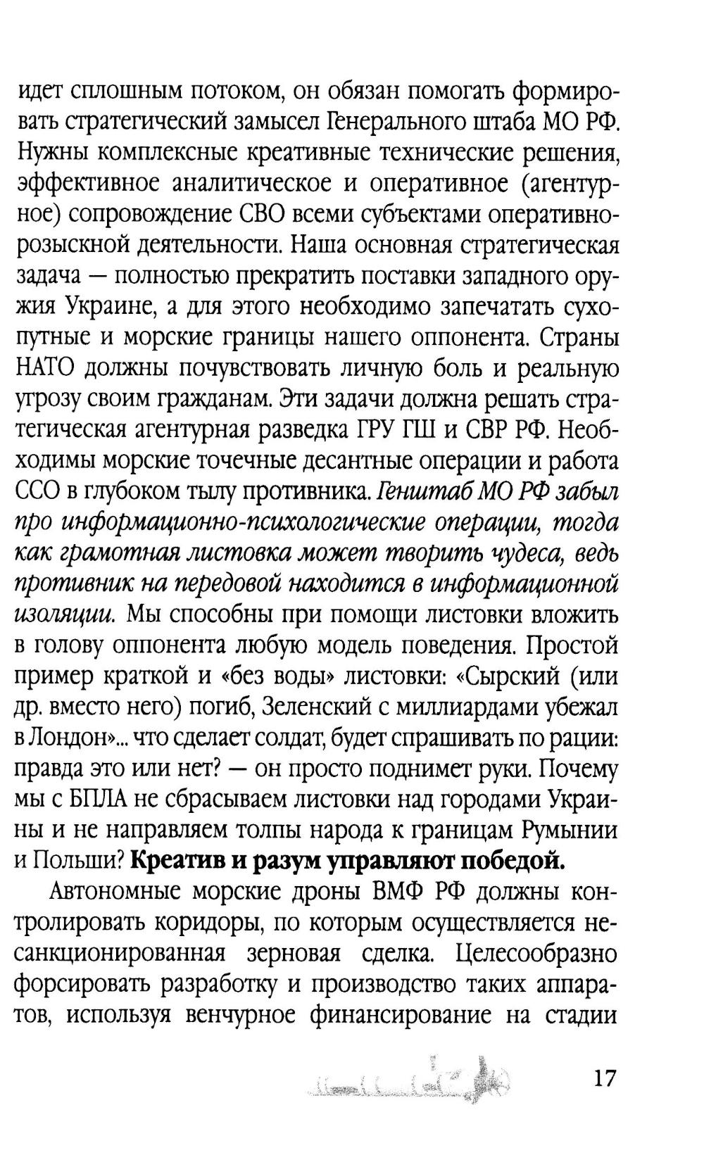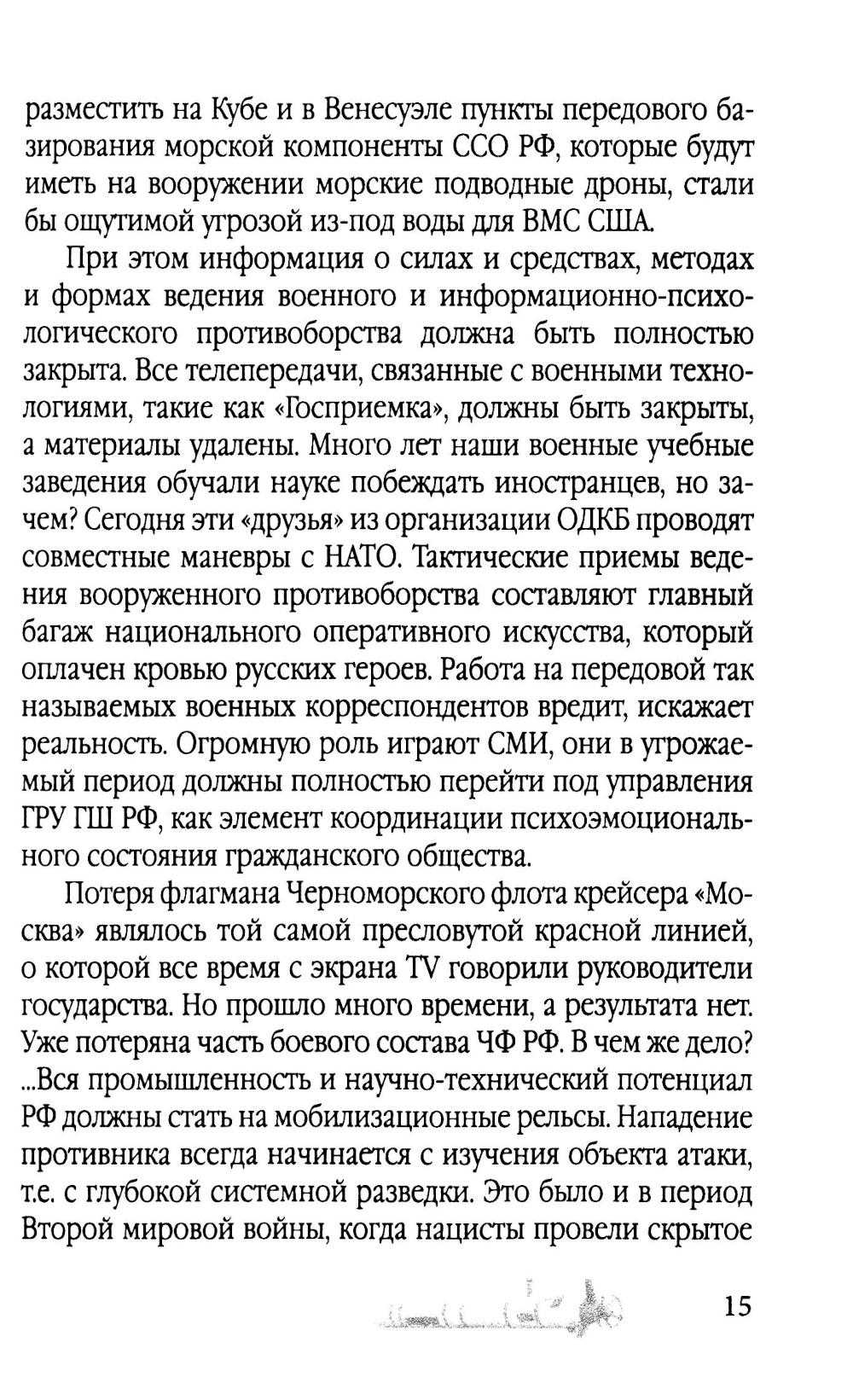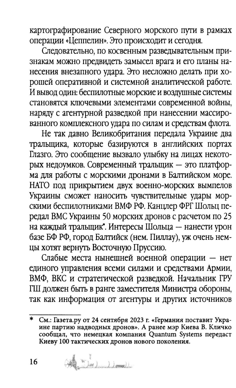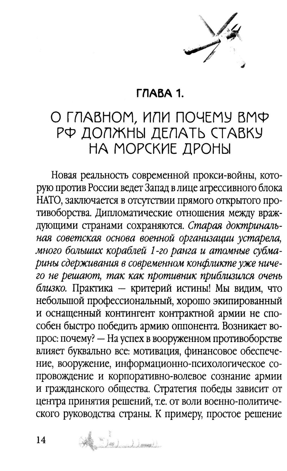 Современная прокси-война, которую против России ведет Запад в лице агрессивного блока НАТО, заключается в отсутствии прямого открытого противоборства. Необходимо понять: старая доктринальная советская основа военной организации устарела; современная война - это война научных знаний и новых технологий. Силы и средства, в том числе человеческий ресурс армии и флота, ничего не решают в новых условиях возможного применения морского, космического и атомного оружия. На новый уровень выходит война на море, ибо успех ударов из-под воды на 100% приводит к победе. В своей научно-технической работе над новыми проектами (а всю линейку новых видов морского вооружения НАТО сейчас «обкатывает» на Украине) страны Запада опираются на информационно-конструкторский багаж ученых Третьего рейха - Вернера фон Брауна, Виктора Шаубергера, Гельмута Вальтера, Курта Танка и др. Сегодня на поле боя выходят роботы: в космосе, в воздухе, на суше и на воде воюют роботы, которыми скоро будет управлять Искусственный Интеллект. И победит тот, кто первый поставит военную науку впереди отсталых старых технологий времен 1-й и 2-й мировых войн. У России есть все шансы на грамотное переформатирование в этом направлении. Массированное применение воздушных и подводных дронов - это ключ к сохранению человеческих жизней, ключ к решению поставленных задач, ключ к победе.| Издательство | Родина |