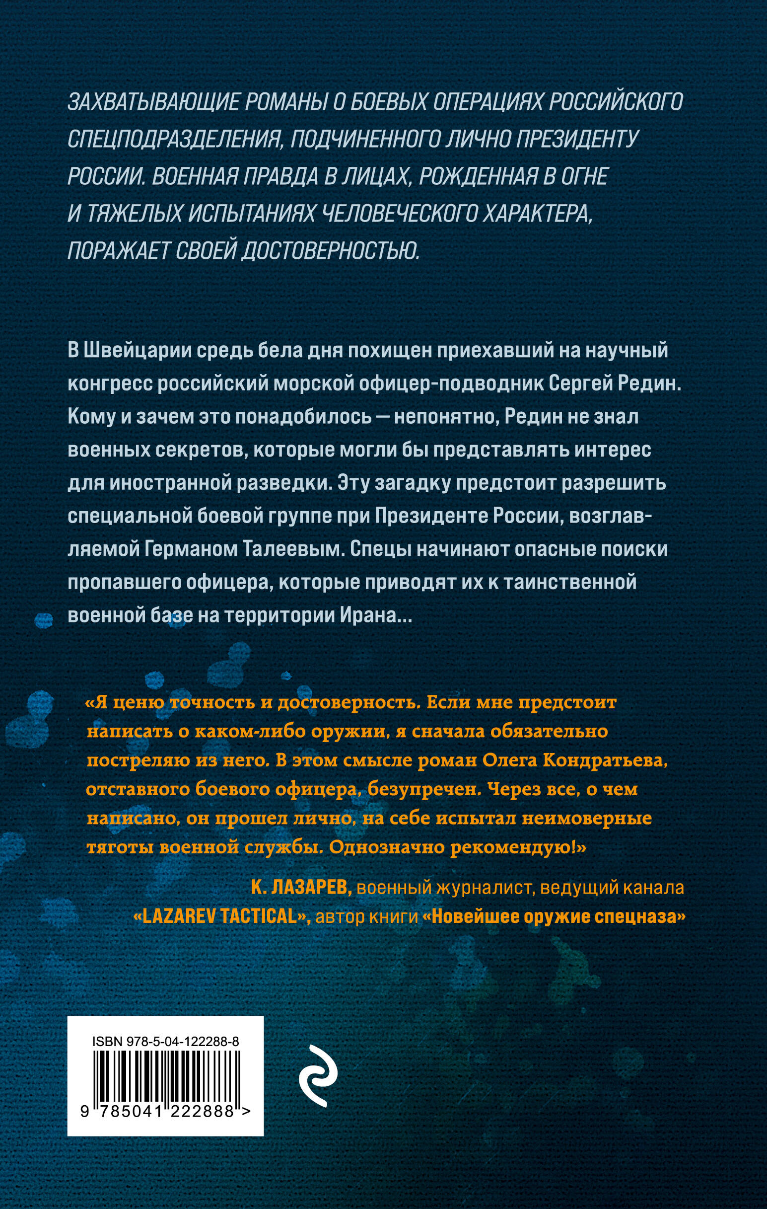 В Швейцарии среди бела дня похищен приехавший на научный конгресс российский морской офицер-подводник Сергей Редин. Кому и зачем это понадобилось - непонятно, Родин не знал военных секретов, которые могли бы представлять интерес для иностранной разведки. Эту загадку предстоит разрешить специальной боевой группе при Президенте России, возглавляемой Германом Талеевым. Спецы начинают опасные поиски пропавшего офицера, которые приводят их к таинственной военной базе на территории Ирана... Захватывающие романы о боевых операциях российского спецподразделения, подчиненного лично Президенту России. Военная правда в лицах, рожденная в огне и тяжелых испытаниях человеческого характера, поражает своей достоверностью.