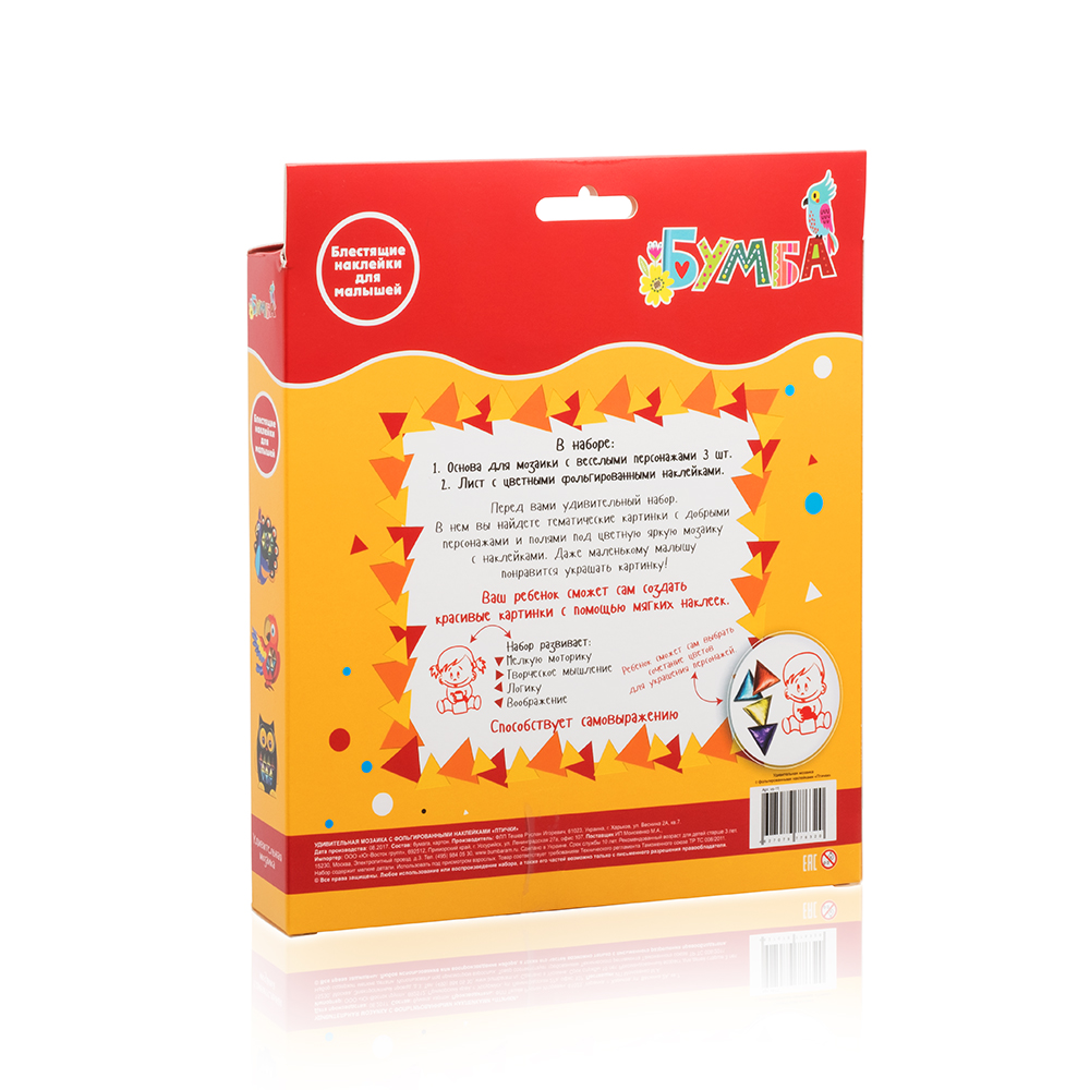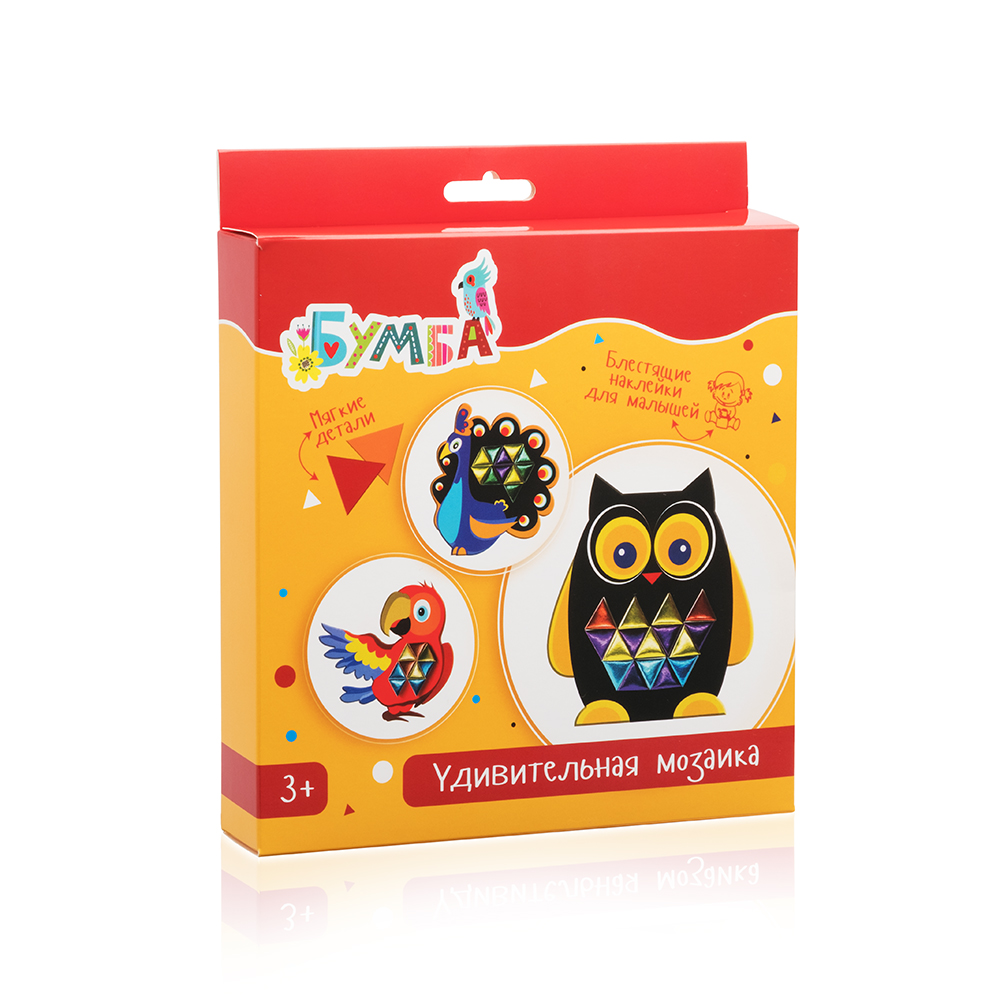 Наборы, выходящие под брендом «Бумба» - это увлекательные занятия с ребенком, приносящие радость и пользу. В процессе игры дети развивают творческие способности и фантазию, а также учатся сочетать цвета и выстраивать единое целое из разрозненных деталей. Занятия с мягкими наклейками и мозаиками развивают у ребенка мелкую моторику и положительно влияют на мышление.