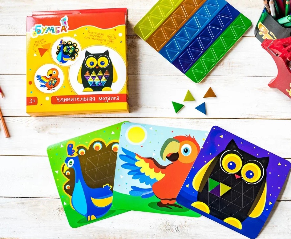 Этот удивительный набор станет для малыша пропуском в мир творчества. Украсьте картинки с различными птицами разноцветной мозаикой из мягких фольгированных наклеек. Ребенок сам выберет любимые цвета, составит узоры и подарит яркое оперение каждой птичке. Результатом творчества станут добрые сувениры и трогательные украшения для детской комнаты.