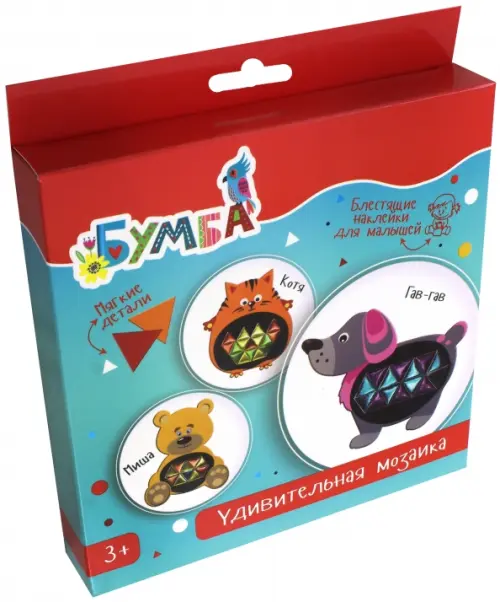 С этим набором вашему малышу понравится творить! В комплекте вы найдете картинки с тремя забавными зверюшками, а также набор фольгированных наклеек, приятных на ощупь. Доверьте ребенку самому выбрать цвета наклеек, придумать узоры и украсить картинки яркой мозаикой. У него получатся трогательные украшения для детской комнаты, сделанные своими руками.